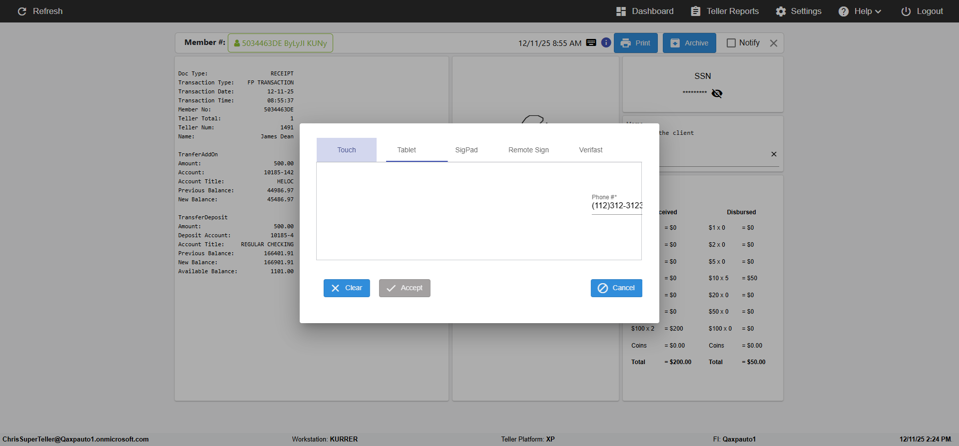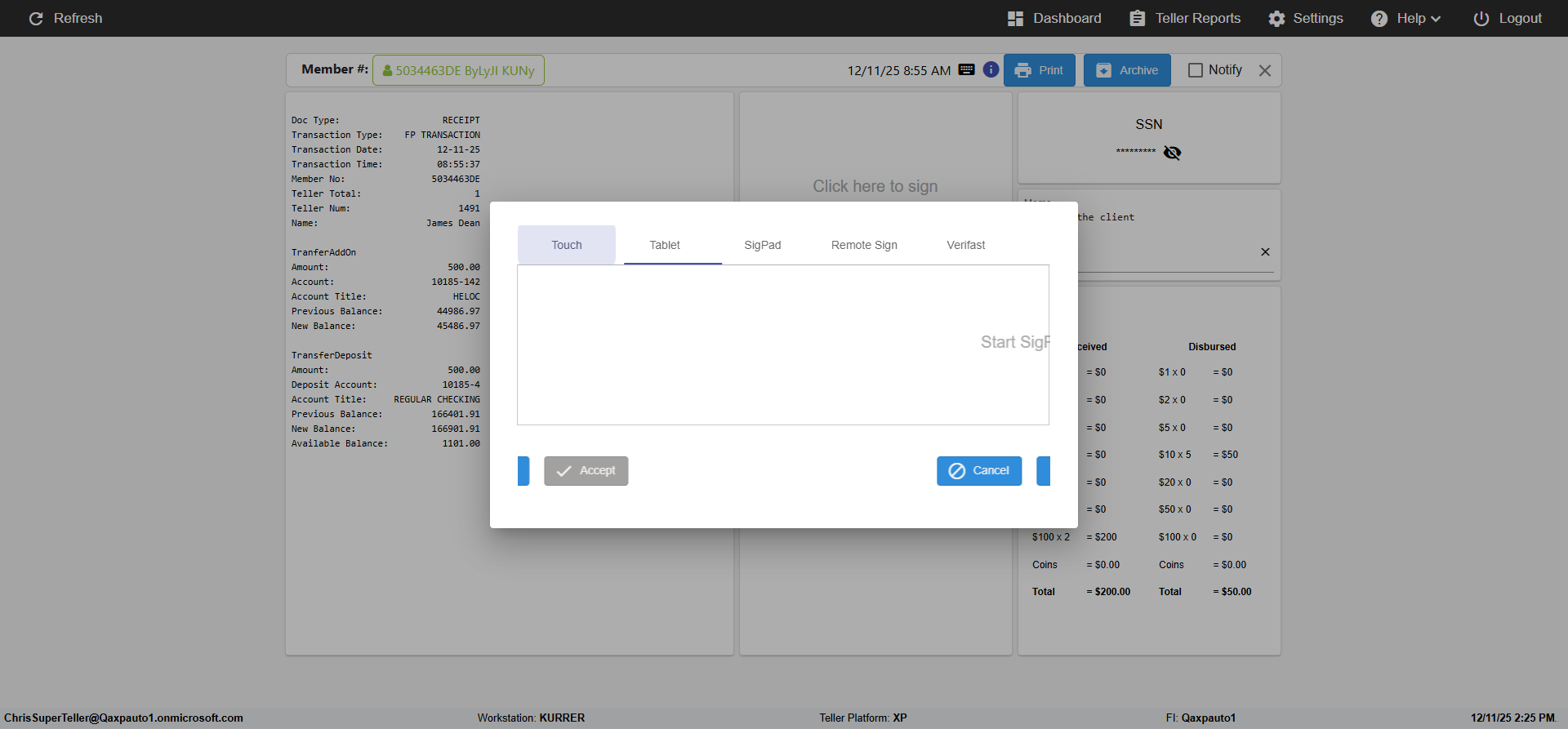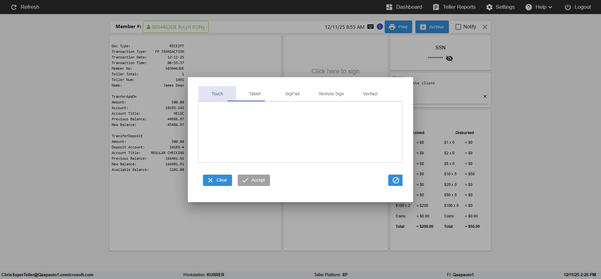 ({Toggel=, Archived Transactions=no, Description=verify touch signature in Receipt Page, Email=FALSE, Archive=FALSE, Document Type=, Notify=TRUE, SignatureTab=Touch,, DisbursedExpression=|-10*5, Operation=, Teller LastName=, Disbursed cash=, errorint=, TestID=verifyTouchSignatureEreceipt, Print=FALSE, DisbursedExpressionValue=TRUE, Phone=, ReceivedCashValue=FALSE, Member=, UserPwd=iMM2022!, Transtatus=Archived-false;Active-true;Error-false, Docment ID=, Teller=, Teller FirstName=Joe, errorMessage=, ReceivedExpressionValue=TRUE, SecondName=, Date=, Platfrom=, Received cash=, Transaction=, Header=, Expression=, Username=ChrisSuperTeller@Qaxpauto1.onmicrosoft.com, DisbursedCashValue=FALSE, FullName=, ReceivedExpression=|+100*2, SMS=FALSE, Memo=})