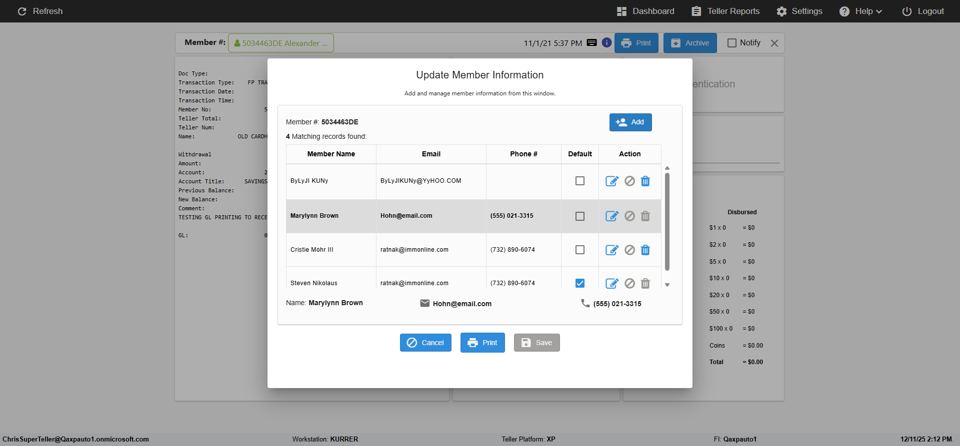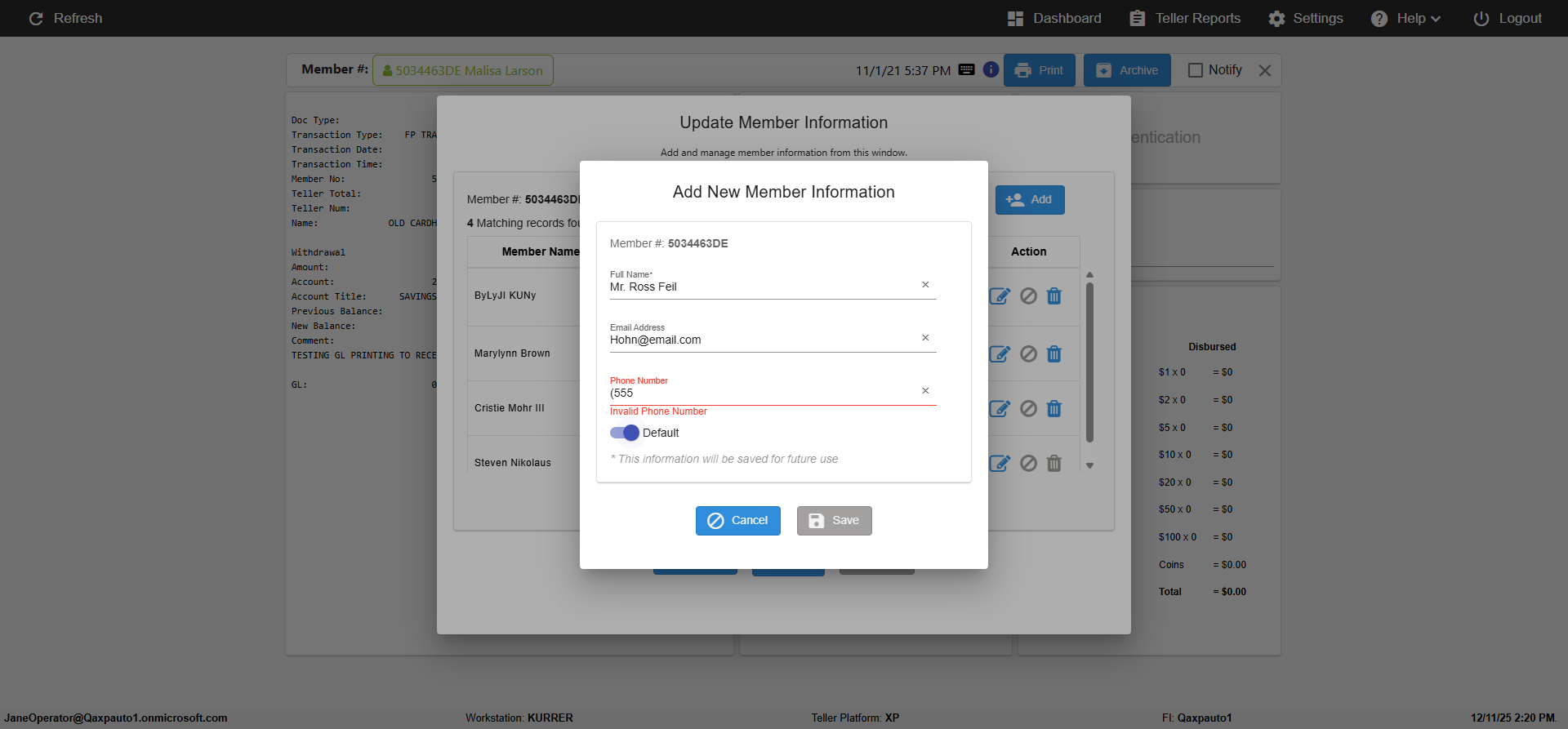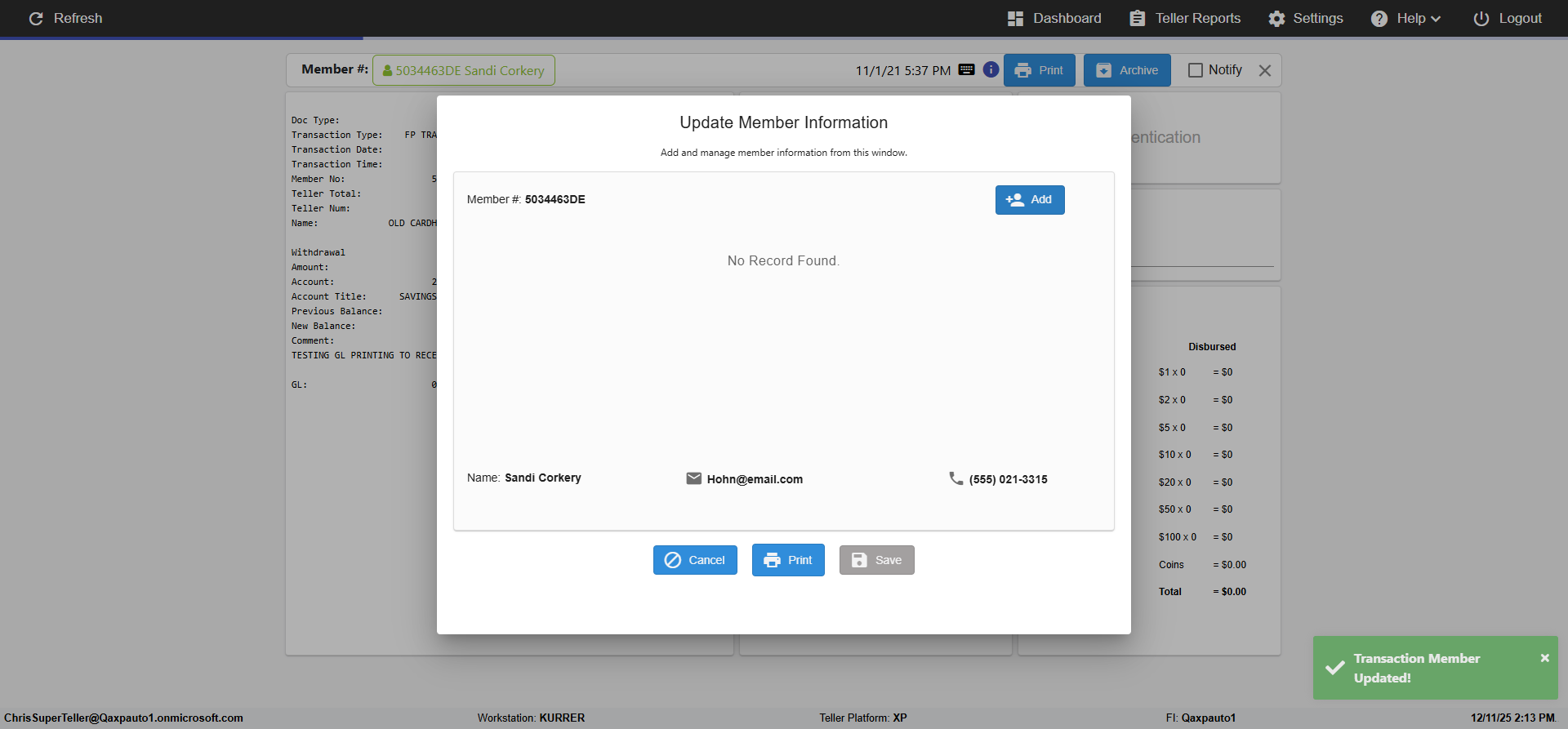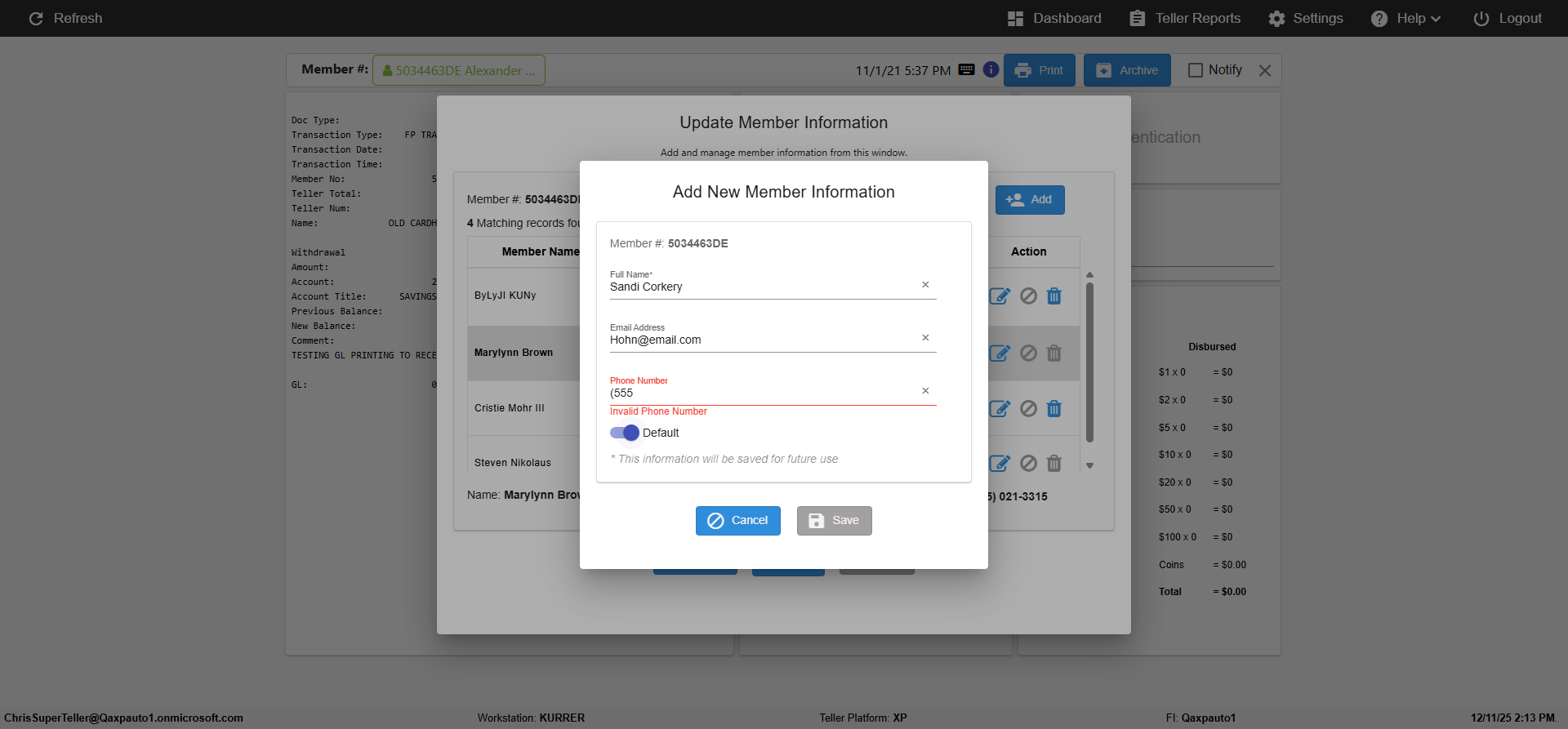 ({Toggel=TRUE, Archived Transactions=no, Description=verify MemberID And Archive Information Update, Email=Hohn@email.com, Archive=, Document Type=, Notify=, SignatureTab=, DisbursedExpression=, Operation=, Teller LastName=, Disbursed cash=, errorint=, TestID=verifyMemberAddUpdateContactInfo, Print=, DisbursedExpressionValue=, Phone=(555) 021-3315, ReceivedCashValue=, Member=5034463, UserPwd=iMM2022!, Transtatus=Archived-false;Active-true;Error-false, Docment ID=, Teller=, Teller FirstName=, errorMessage=, ReceivedExpressionValue=, SecondName=, Date=11/01/2021 - 11/20/2021, Platfrom=, Received cash=, Transaction=, Header=, Expression=, Username=ChrisSuperTeller@Qaxpauto1.onmicrosoft.com, DisbursedCashValue=, FullName=John, ReceivedExpression=, SMS=, Memo=})