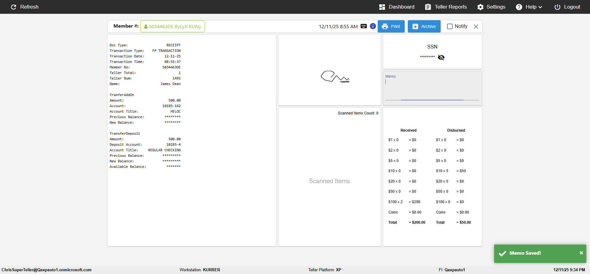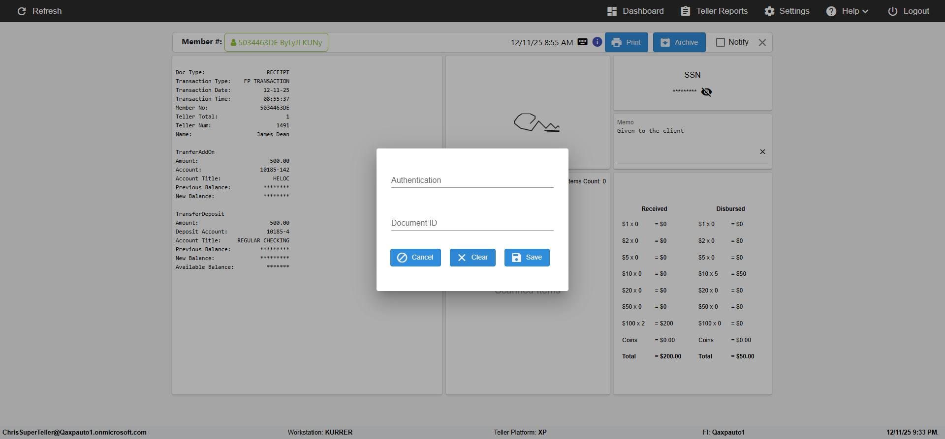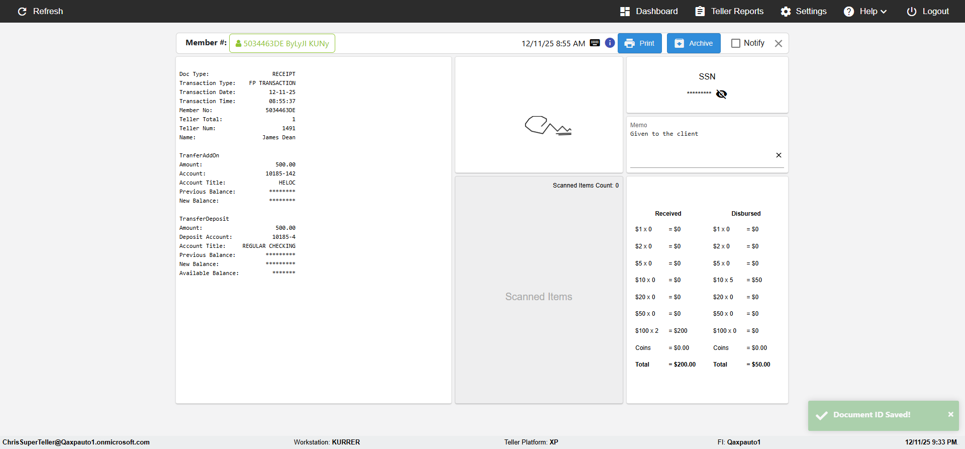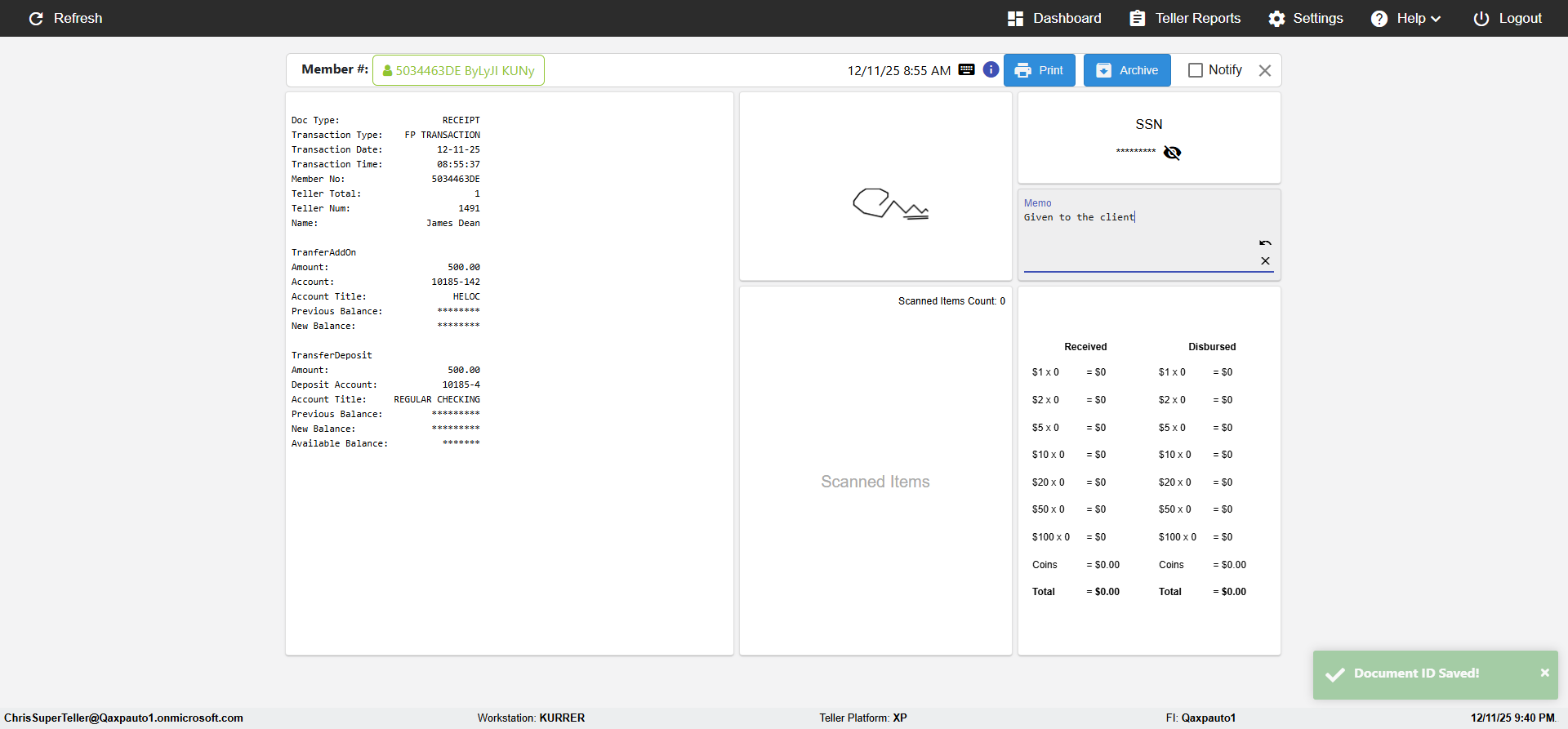 (verify MemberID And Archive Information for Normal teller In Receipt Page)
