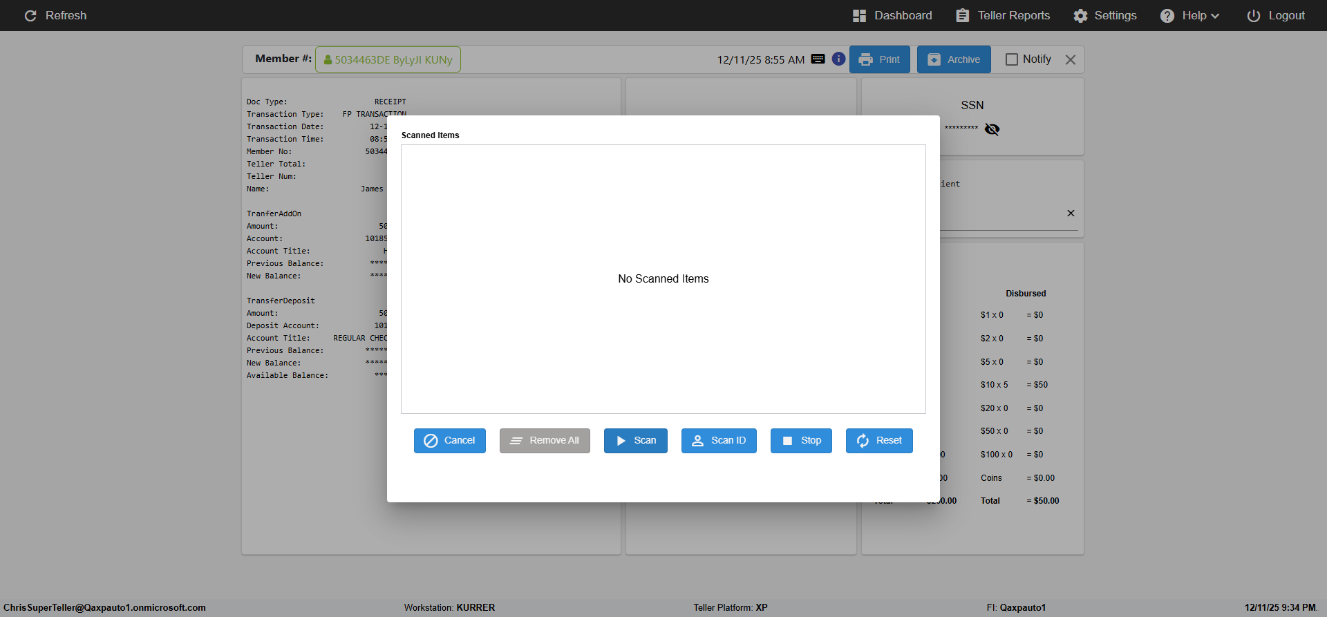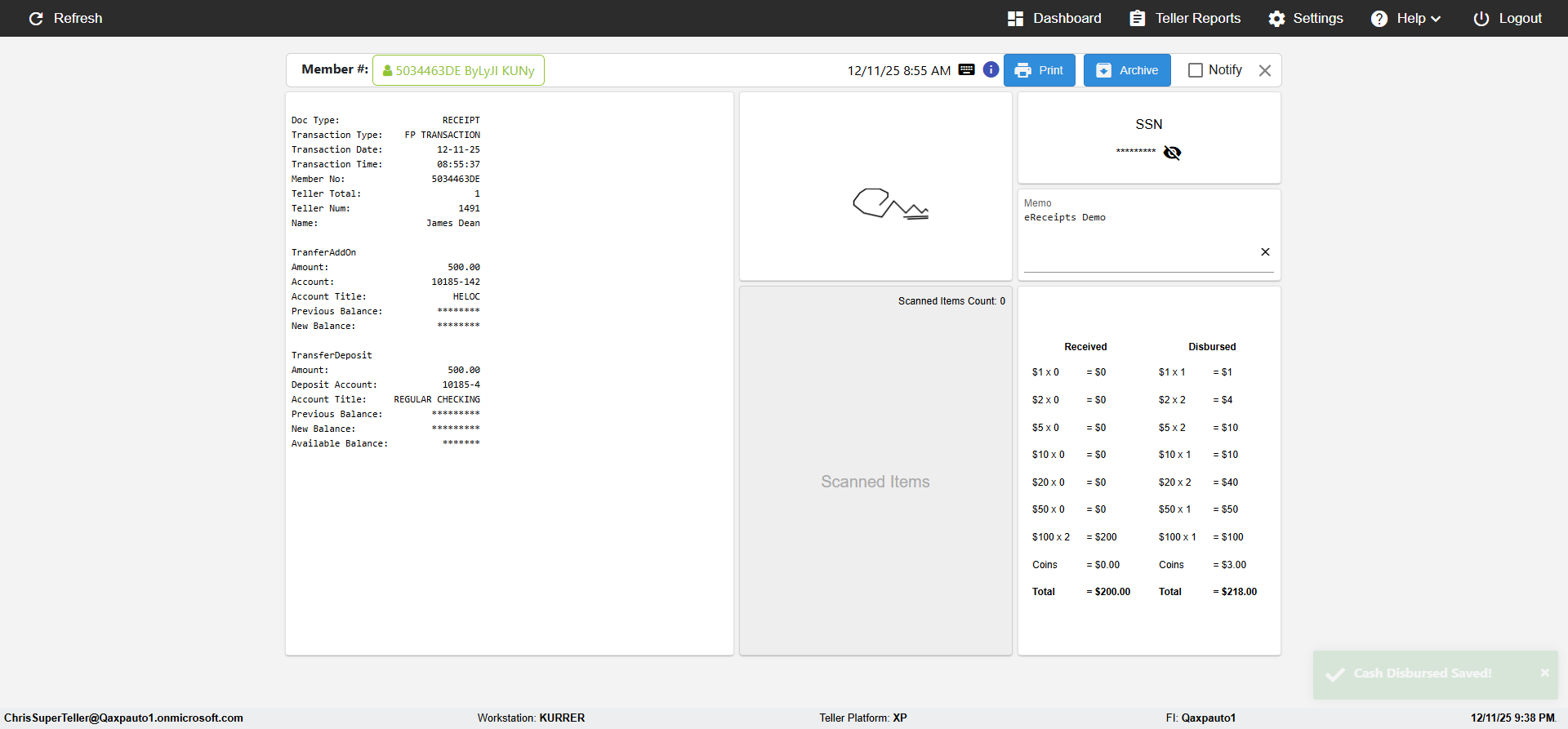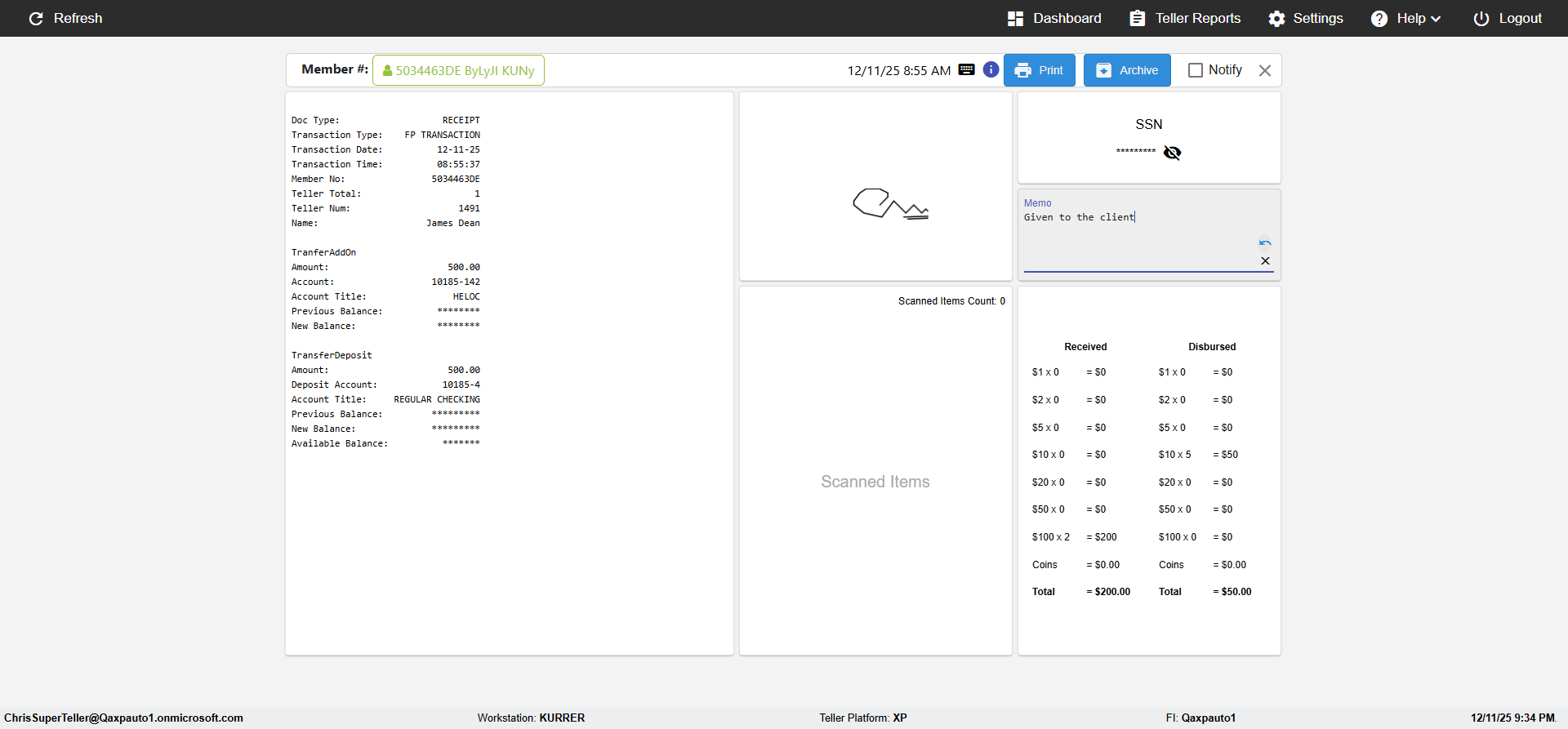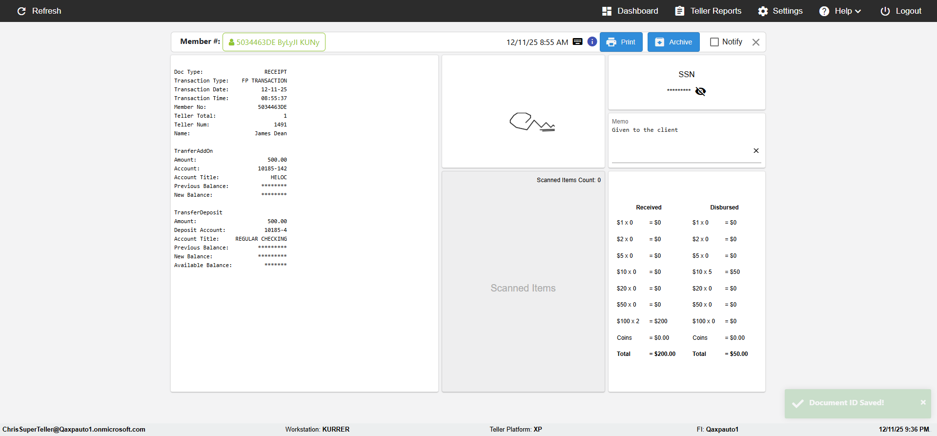 (verify MemberID And Archive Information for Normal teller In Receipt Page)
