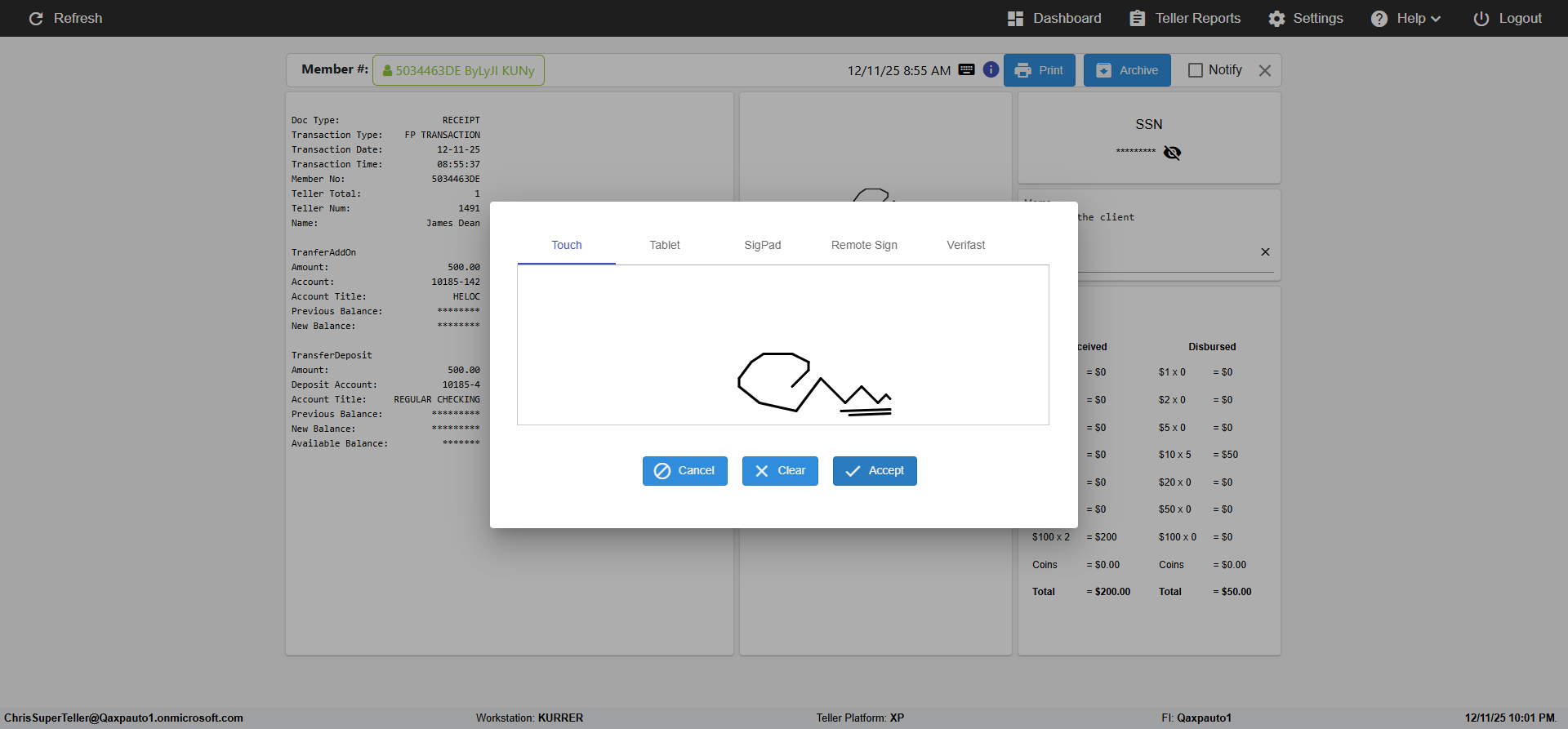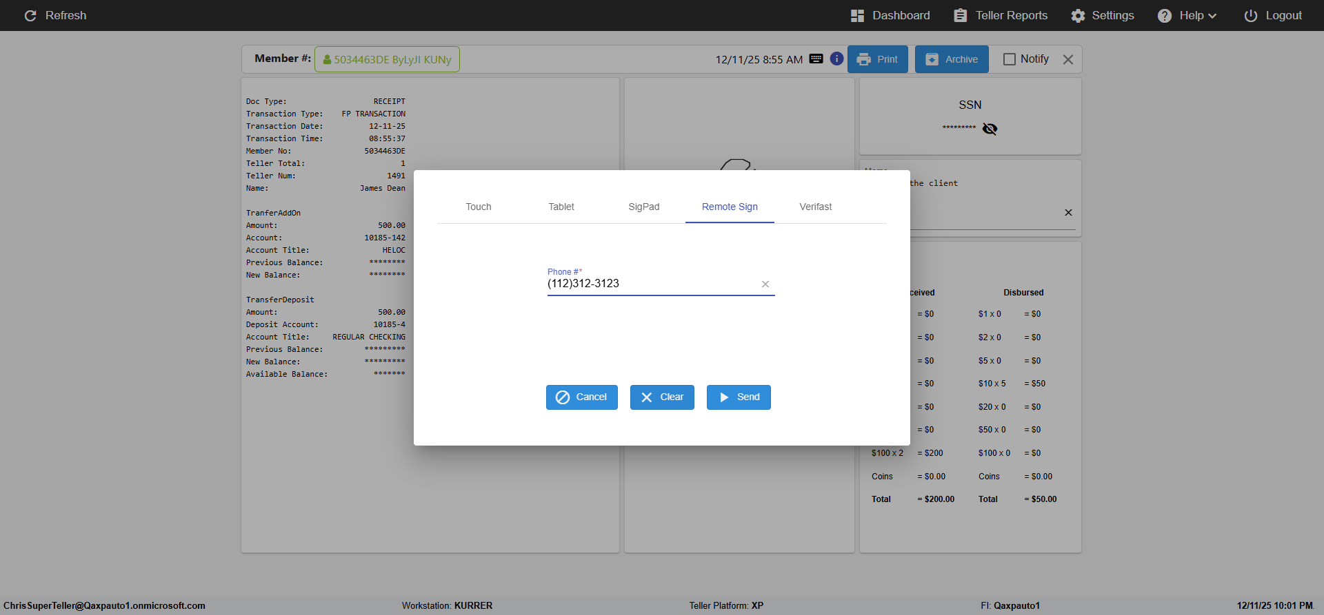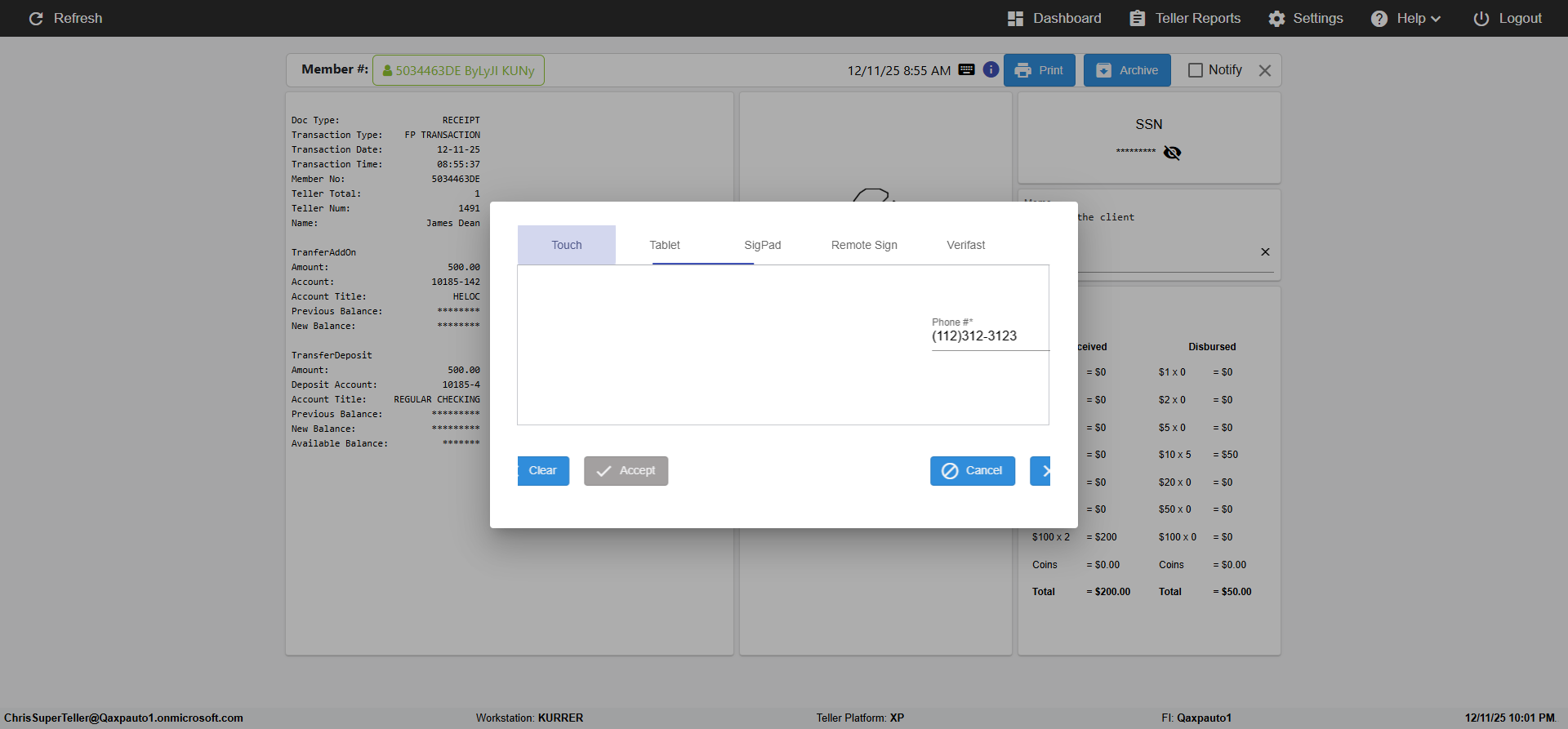 ({Toggel=, Archived Transactions=no, Description=verify touch signature in Receipt Page, Email=FALSE, Archive=FALSE, Document Type=, Notify=TRUE, SignatureTab=Touch,, DisbursedExpression=|-10*5, Operation=, Teller LastName=, Disbursed cash=, errorint=, TestID=verifyTouchSignatureEreceipt, Print=FALSE, DisbursedExpressionValue=TRUE, Phone=, ReceivedCashValue=FALSE, Member=, UserPwd=iMM2022!, Transtatus=Archived-false;Active-true;Error-false, Docment ID=, Teller=, Teller FirstName=Joe, errorMessage=, ReceivedExpressionValue=TRUE, SecondName=, Date=, Platfrom=, Received cash=, Transaction=, Header=, Expression=, Username=ChrisSuperTeller@Qaxpauto1.onmicrosoft.com, DisbursedCashValue=FALSE, FullName=, ReceivedExpression=|+100*2, SMS=FALSE, Memo=})