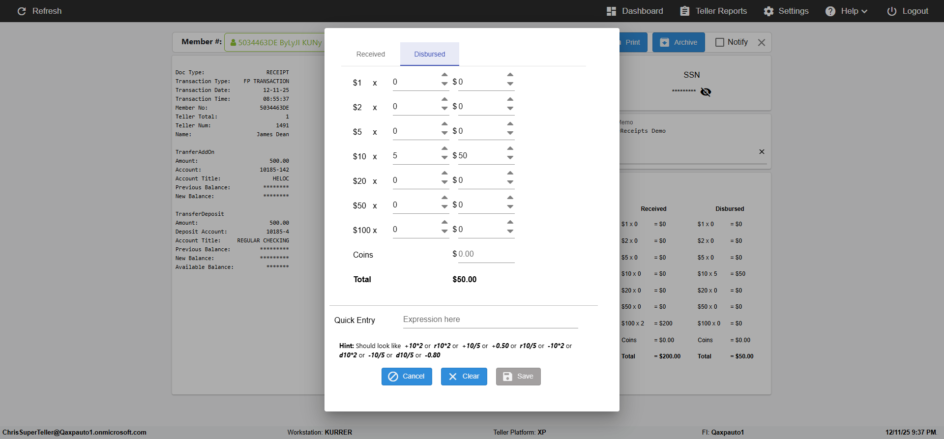 ({Toggel=, Archived Transactions=yes, Description=verify End TO End Test OF Normal Teller In Ereceipt Page, Email=FALSE, Archive=FALSE, Document Type=SSN, Notify=TRUE, SignatureTab=Touch,, DisbursedExpression=|-10*5, Operation=, Teller LastName=, Disbursed cash=1-1|2-2|5-2|10-1|20-2|50-1|100-1|Coins-3, errorint=, TestID=verifyEndTOEndTestOFNormalTellerInEreceipt, Print=FALSE, DisbursedExpressionValue=TRUE, Phone=(555) 021-3315, ReceivedCashValue=FALSE, Member=, UserPwd=iMM2022!, Transtatus=Archived-false;Active-true;Error-false, Docment ID=216554333, Teller=, Teller FirstName=, errorMessage=, ReceivedExpressionValue=TRUE, SecondName=, Date=, Platfrom=, Received cash=1-1|2-2|5-2|10-1|20-2|50-1|100-1|Coins-3, Transaction=, Header=, Expression=, Username=ChrisSuperTeller@Qaxpauto1.onmicrosoft.com, DisbursedCashValue=FALSE, FullName=, ReceivedExpression=|+100*2, SMS=FALSE, Memo=Given to the client})