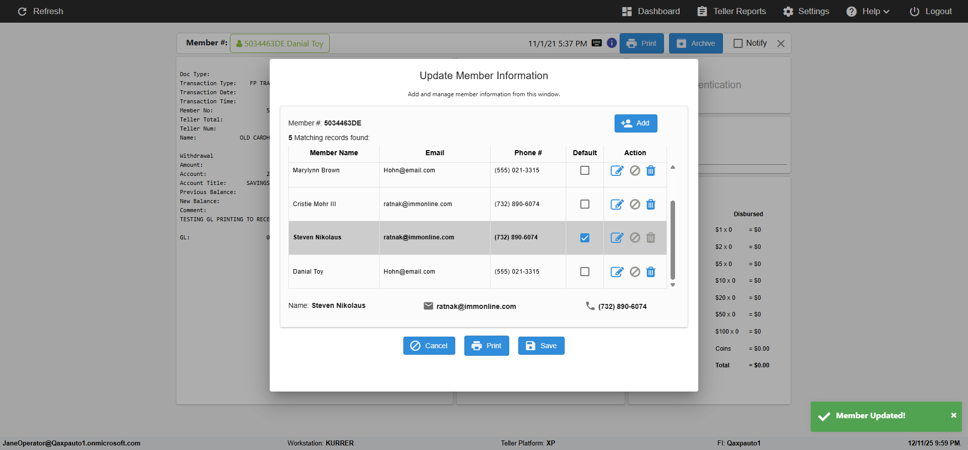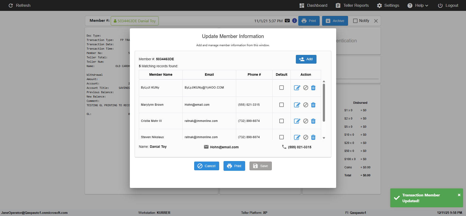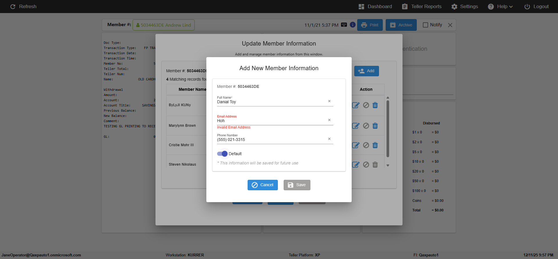 ({Toggel=TRUE, Archived Transactions=no, Description=verify MemberID And Archive Information Update, Email=Hohn@email.com, Archive=, Document Type=, Notify=, SignatureTab=, DisbursedExpression=, Operation=, Teller LastName=, Disbursed cash=, errorint=, TestID=verifyMemberAddUpdateContactInfo, Print=, DisbursedExpressionValue=, Phone=(555) 021-3315, ReceivedCashValue=, Member=5034463, UserPwd=iMM2022!, Transtatus=Archived-false;Active-true;Error-false, Docment ID=, Teller=, Teller FirstName=, errorMessage=, ReceivedExpressionValue=, SecondName=, Date=11/01/2021 - 11/20/2021, Platfrom=, Received cash=, Transaction=, Header=, Expression=, Username=ChrisSuperTeller@Qaxpauto1.onmicrosoft.com, DisbursedCashValue=, FullName=John, ReceivedExpression=, SMS=, Memo=})