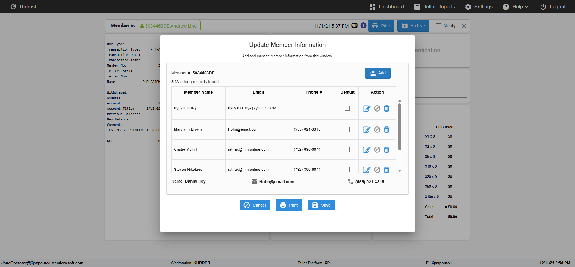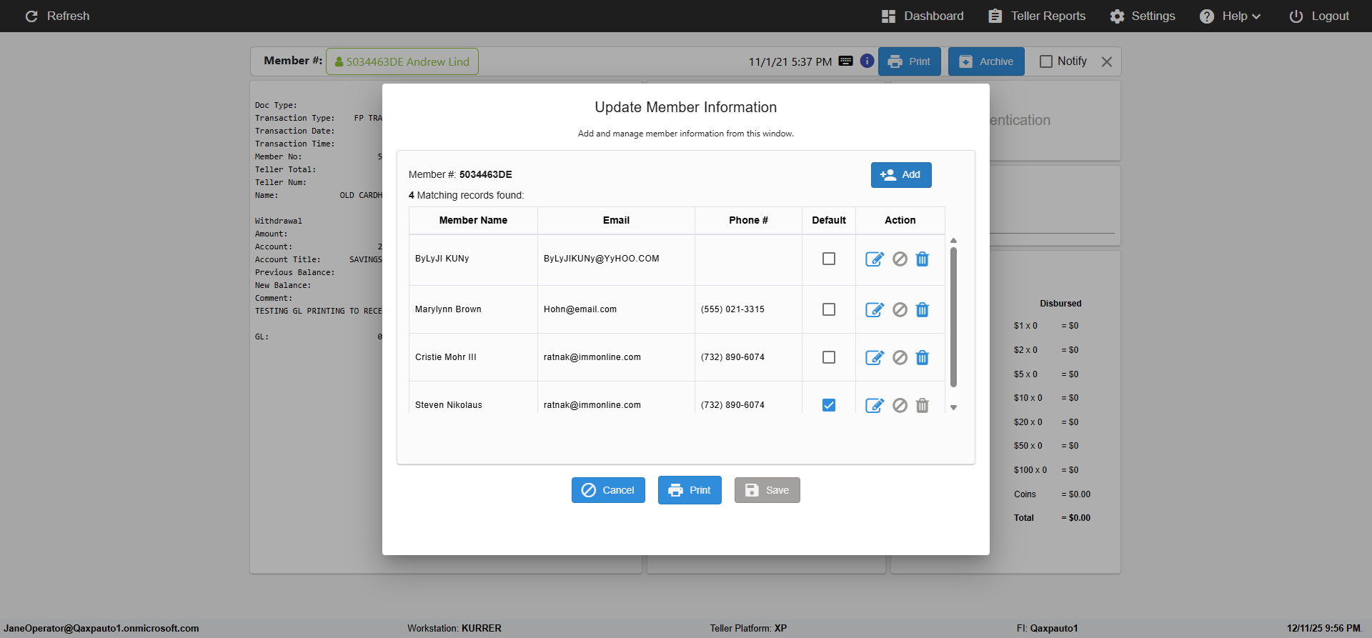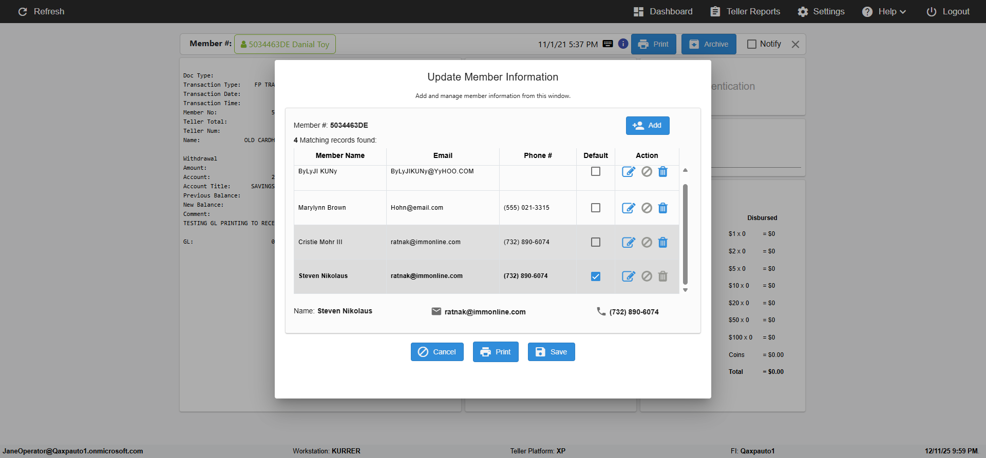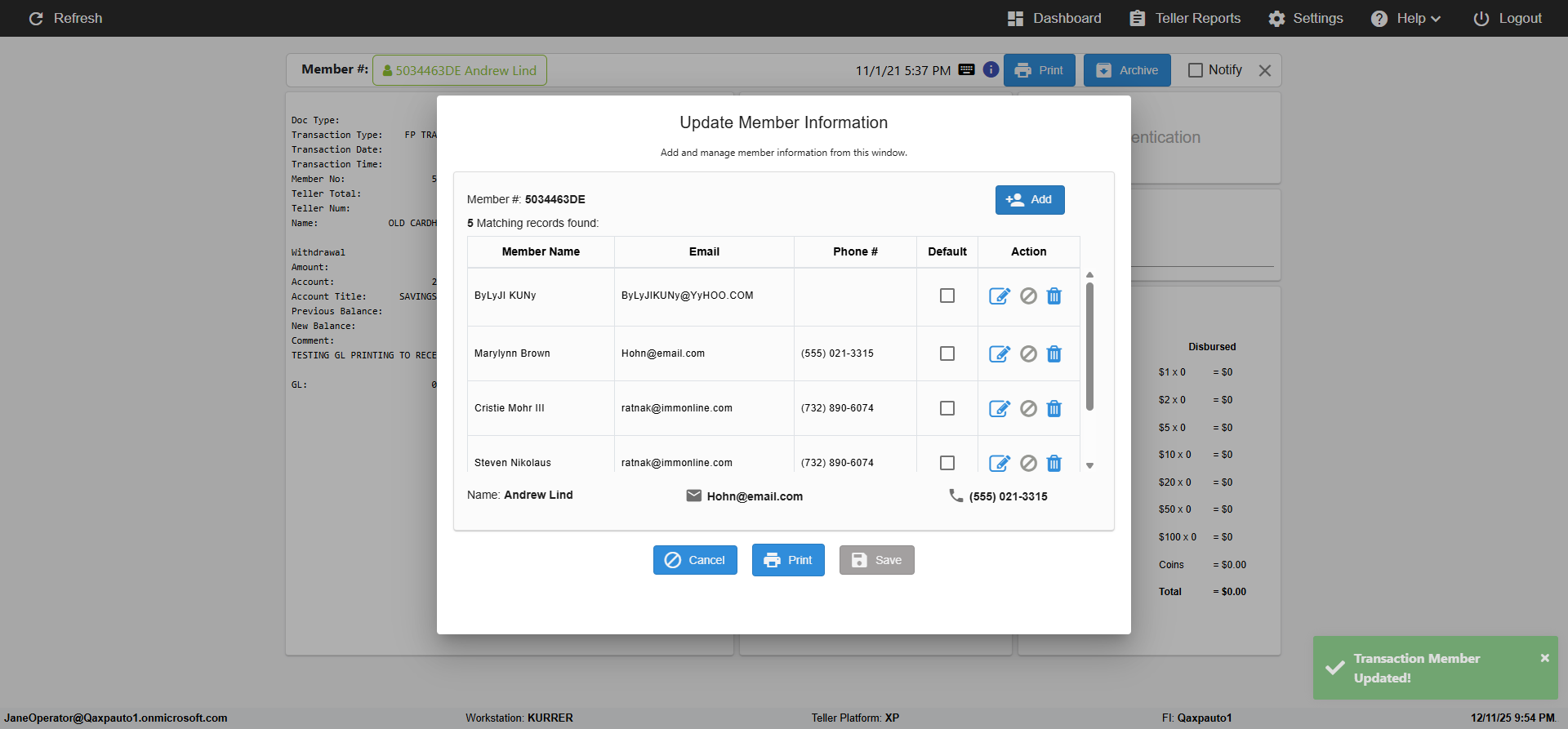 ({Toggel=TRUE, Archived Transactions=no, Description=verify MemberID And Archive Information Update, Email=Hohn@email.com, Archive=, Document Type=, Notify=, SignatureTab=, DisbursedExpression=, Operation=, Teller LastName=, Disbursed cash=, errorint=, TestID=verifyMemberAddUpdateContactInfo, Print=, DisbursedExpressionValue=, Phone=(555) 021-3315, ReceivedCashValue=, Member=5034463, UserPwd=iMM2022!, Transtatus=Archived-false;Active-true;Error-false, Docment ID=, Teller=, Teller FirstName=, errorMessage=, ReceivedExpressionValue=, SecondName=, Date=11/01/2021 - 11/20/2021, Platfrom=, Received cash=, Transaction=, Header=, Expression=, Username=ChrisSuperTeller@Qaxpauto1.onmicrosoft.com, DisbursedCashValue=, FullName=John, ReceivedExpression=, SMS=, Memo=})
