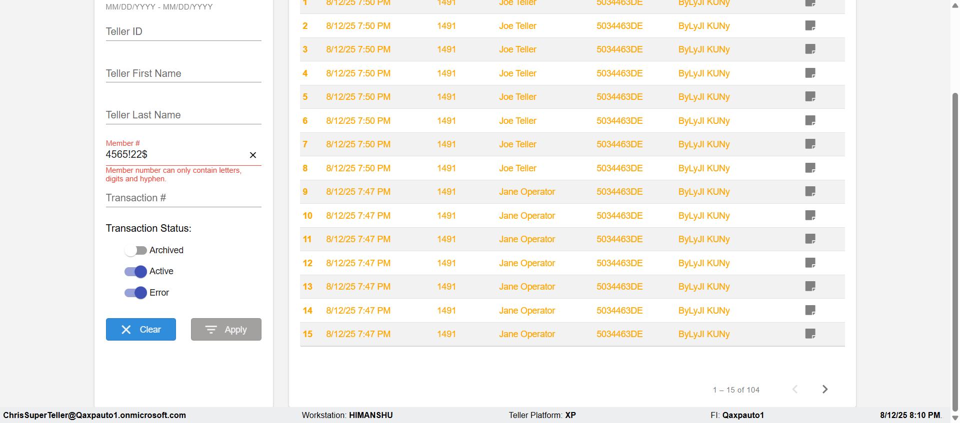 ({Description=verify Error Messages In DashBoard Page for Member, Email=, Teller LastName=, print signatur=, errorint=1, TestID=verifyErrorMessagesInDashBoardPage, Color Transactions=, Member=4565!22$, UserPwd=iMM2022!, Transtatus=Archived-false;Active-true;Error-false, Receipt=, Report=, Teller=, Teller FirstName=, errorMessage=Member number can only contain letters, digits and hyphen.;, Suppress=, Date=, print Disburstments=, Print signature line=, Type=, Transaction=, Header=, Username=ChrisSuperTeller@Qaxpauto1.onmicrosoft.com, SMS=, Sign=, Scan=})