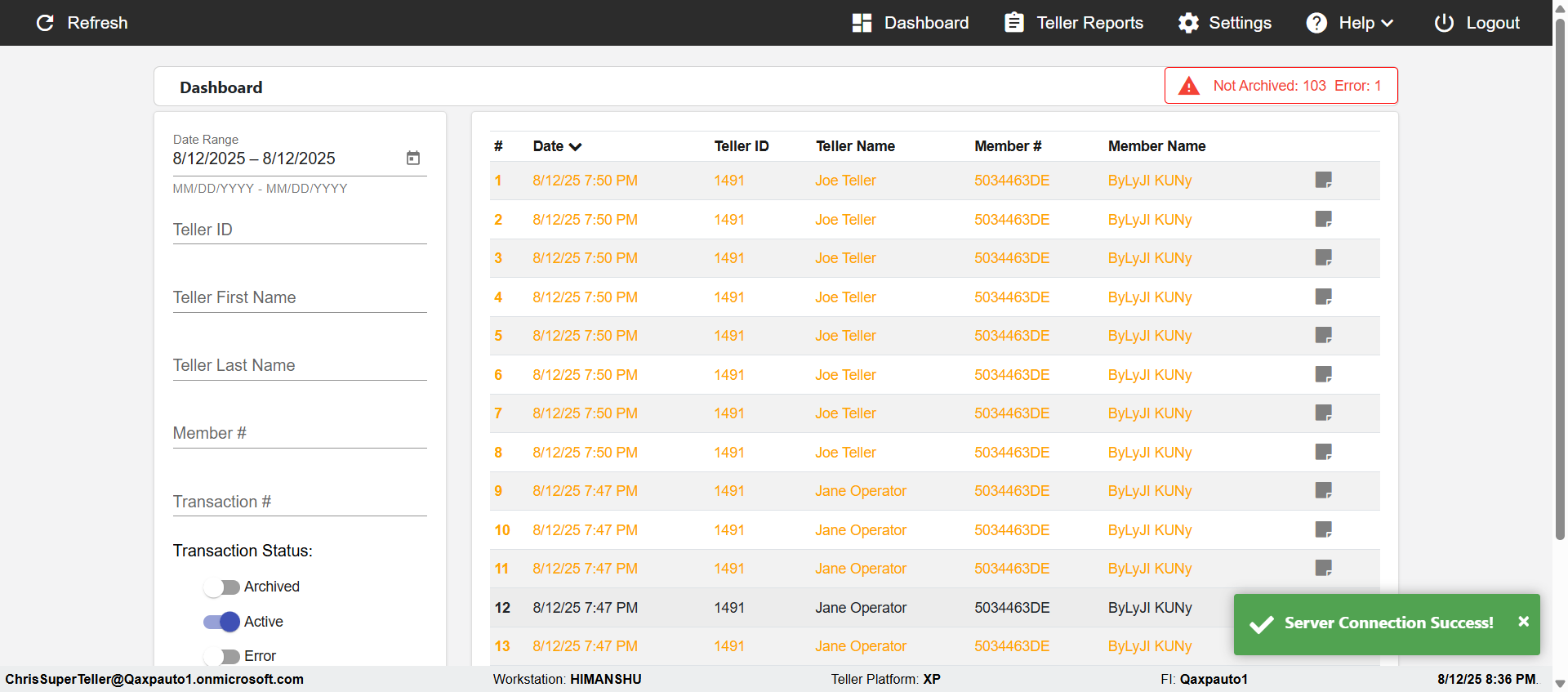 (Verify negative/invalid Search of the Date,Teller,Teller name,Member name in DashBoard page)
