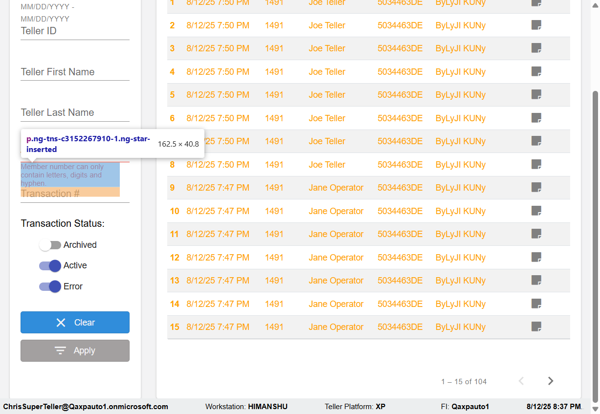 ({Description=verify Error Messages In DashBoard Page for Member, Email=, Teller LastName=, print signatur=, errorint=1, TestID=verifyErrorMessagesInDashBoardPage, Color Transactions=, Member=4565!22$, UserPwd=iMM2022!, Transtatus=Archived-false;Active-true;Error-false, Receipt=, Report=, Teller=, Teller FirstName=, errorMessage=Member number can only contain letters, digits and hyphen.;, Suppress=, Date=, print Disburstments=, Print signature line=, Type=, Transaction=, Header=, Username=ChrisSuperTeller@Qaxpauto1.onmicrosoft.com, SMS=, Sign=, Scan=})