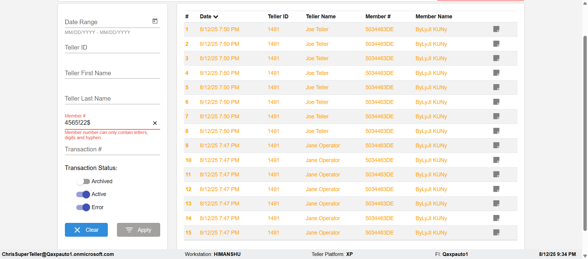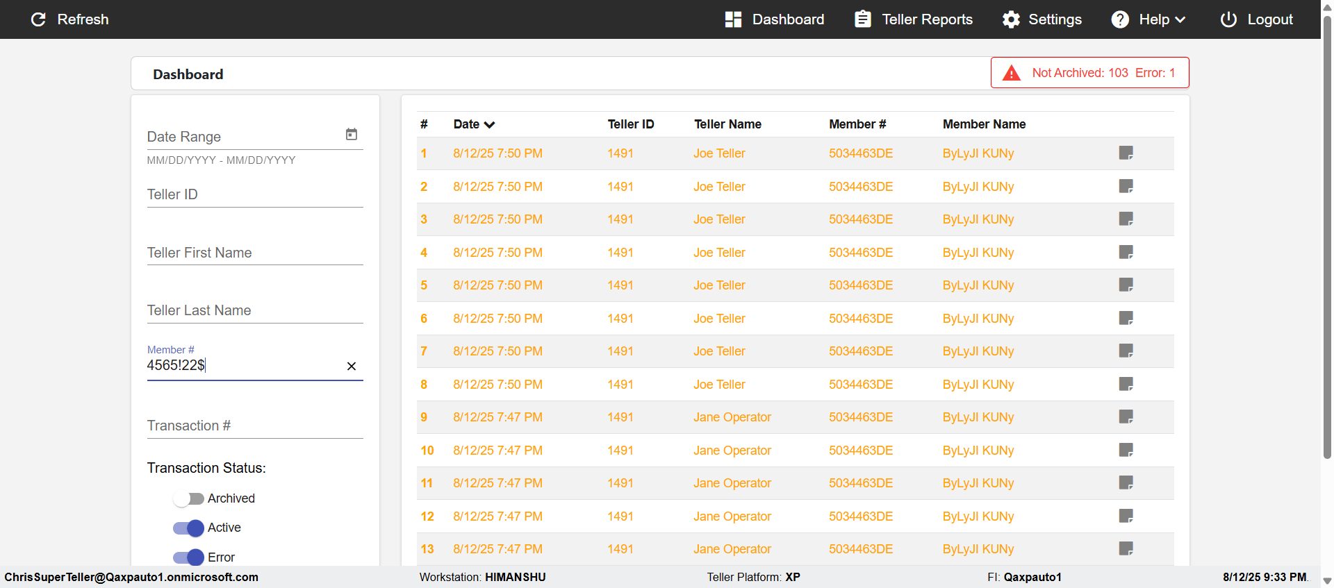 (Verify negative/invalid Search of the Date,Teller,Teller name,Member name in DashBoard page)