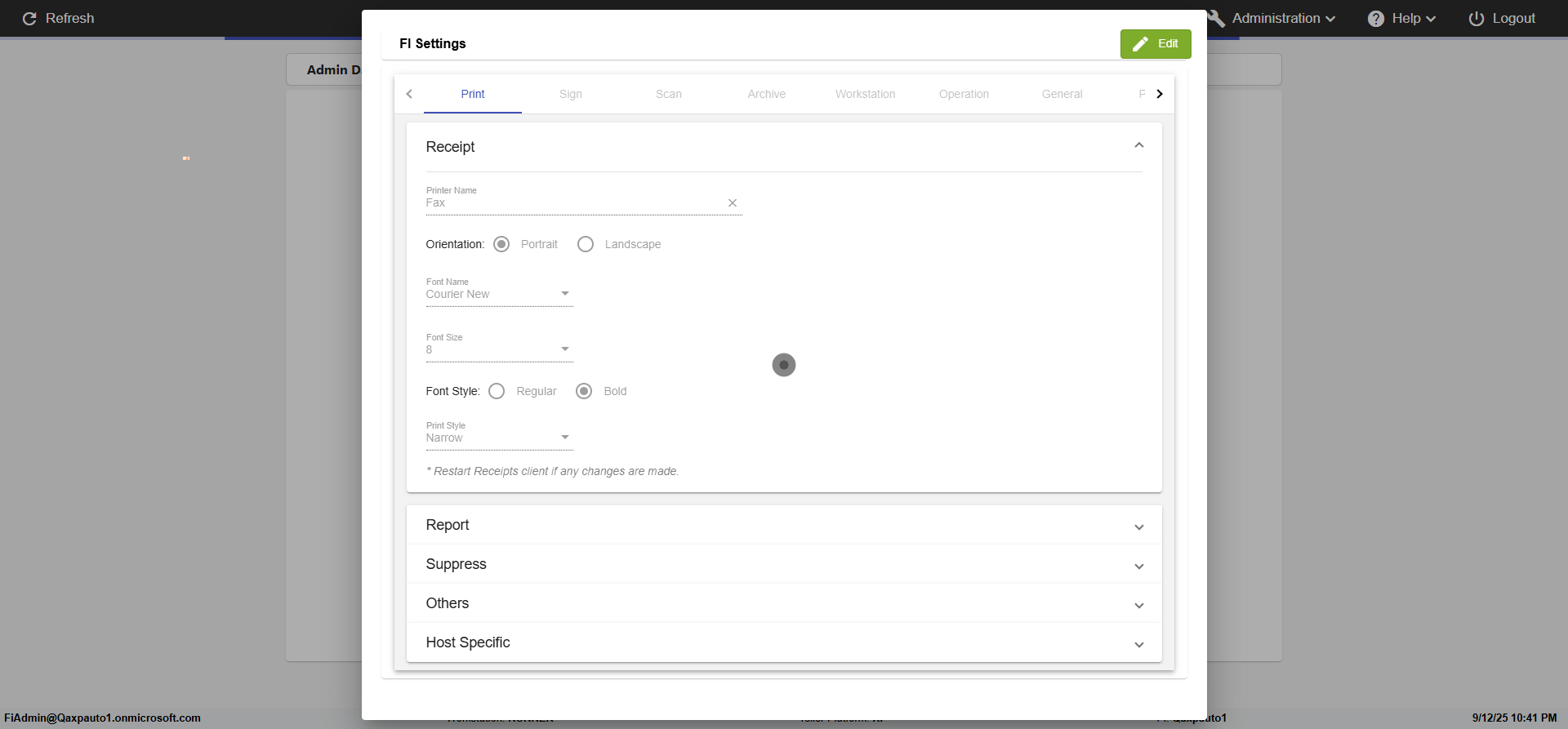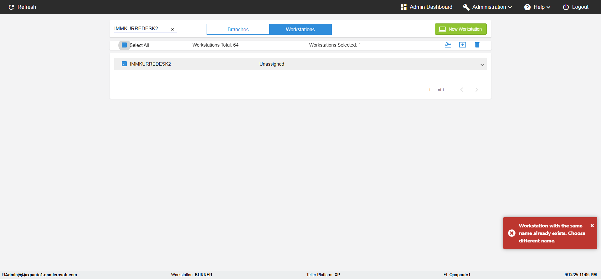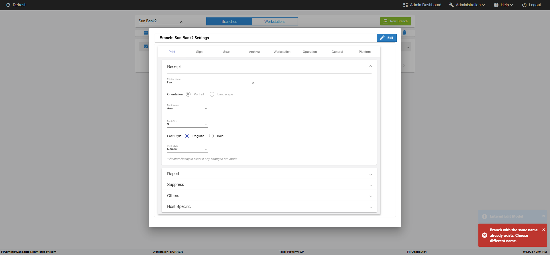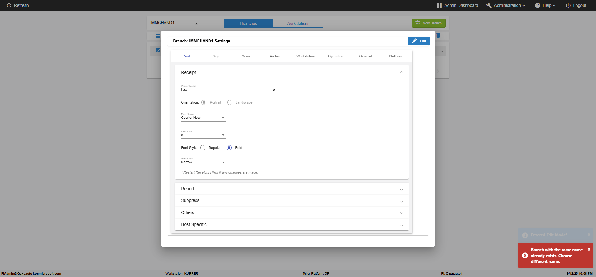 | {FromBranch=, Archived Transactions=, Description=verify Workstation print settings Admin Portal, Archive=, Operation=, print signatur=, Name=, Clear=, TestID=verifyWorkstationPrintSettingsInAdmin, Phone=, MultipleWorkstation=, WorkstationName=IMMKURREDESK2, ToBranch=, WorkstationDeleteOption=, Subscription Names=, BranchName=, retention=, FilePath=, Agent=, UserPwd=iMM2022!, BranchDeleteOption=, Transtatus=Archived-false;Active-true;Error-false, Receipt=Printer Name-Fax;Orientation-Portrait;Name-Courier New;Size-8;Style-Bold,Narrow, Report=Printer Name-Fax;Orientation-Portrait;Name-Consolas;Size-10;Style-Bold, Index_Field_Name=, Agents=, IPFilter=, Text=, Hold Notice=, Suppress=Log1-false;Log2-false;CuAddress-false;Member Address-false, SchedualType=, Date=, Platfrom=, GroupId=, print Disburstments=FALSE, Role=, Brand=, SMTP=, Print signature line=print the sign, TimeZone=, Imaging System=, Header=, MultipleBranches=, Username=fiAdmin@Qaxpauto1.onmicrosoft.com, MappedOption=, Sign=, Scan=, PortNumber=} |