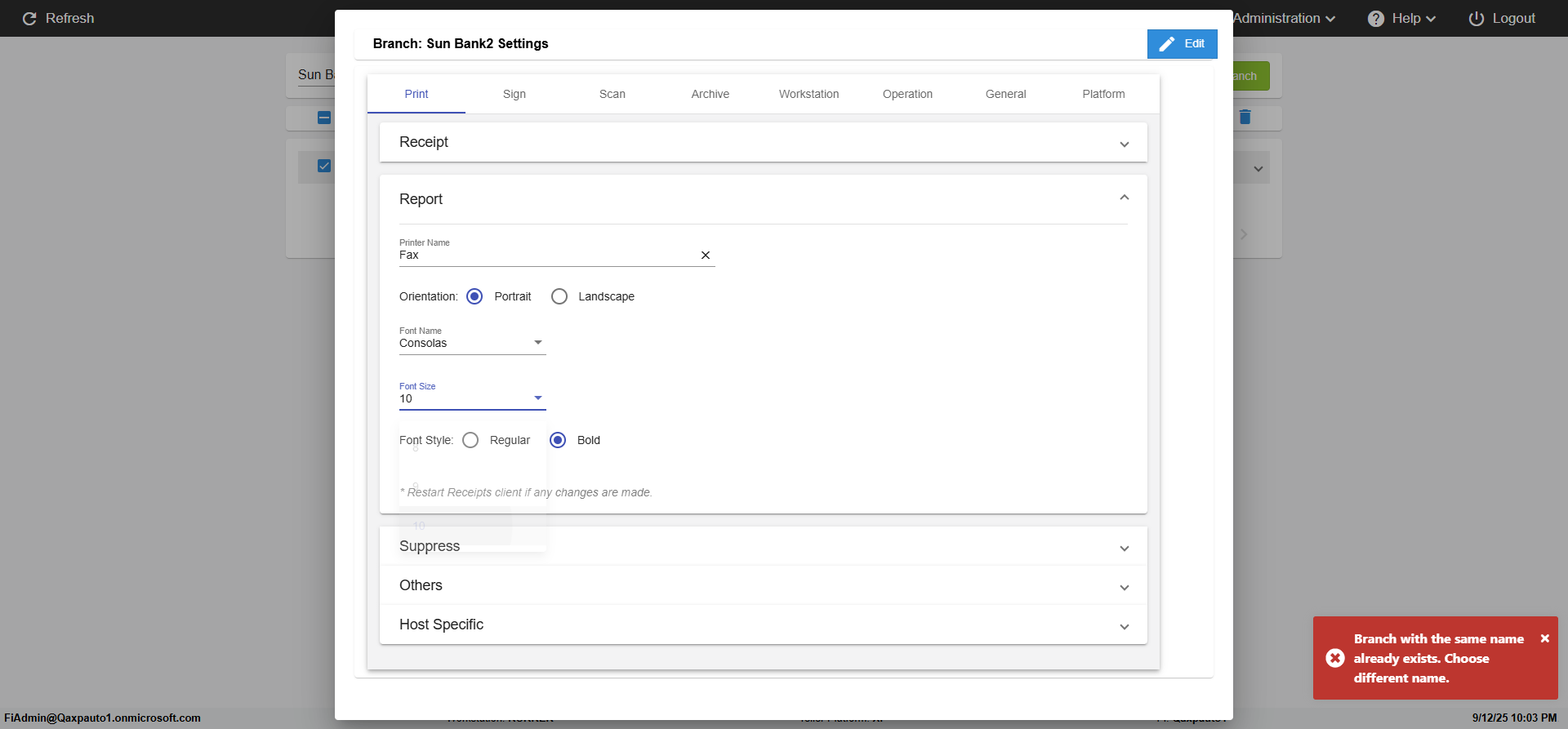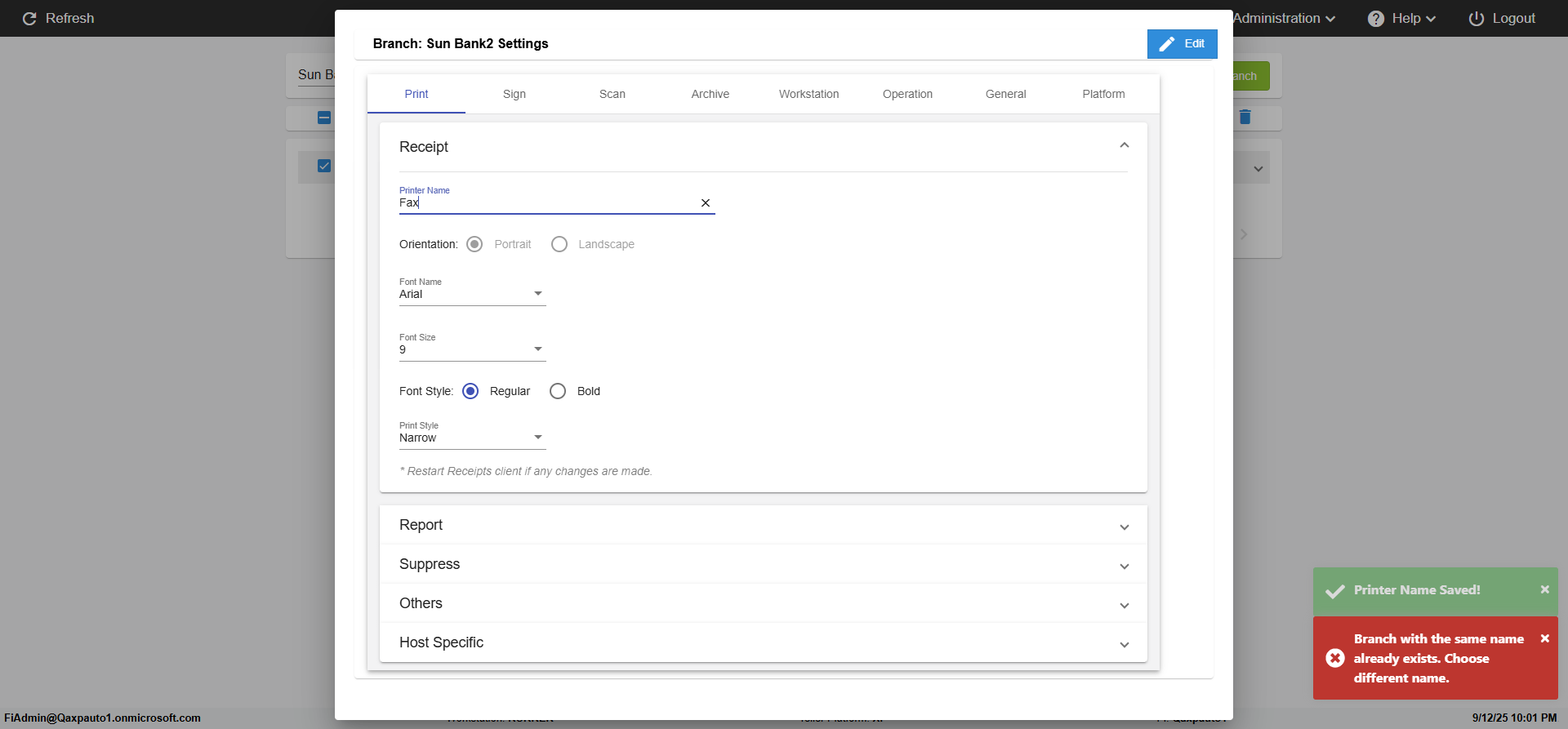 | {FromBranch=, Archived Transactions=, Description=verify Branch print settings Admin Portal, Archive=, Operation=, print signatur=, Name=, Clear=, TestID=verifyBranchPrintSettingsInAdmin, Phone=, MultipleWorkstation=, WorkstationName=, ToBranch=, WorkstationDeleteOption=, Subscription Names=, BranchName=Sun Bank2, retention=, FilePath=, Agent=, UserPwd=iMM2022!, BranchDeleteOption=, Transtatus=Archived-false;Active-true;Error-false, Receipt=Printer Name-Fax;Name-Arial;Size-9;Style-Regular,Narrow, Report=Printer Name-Fax;Orientation-Portrait;Name-Consolas;Size-10;Style-Bold, Index_Field_Name=, Agents=, IPFilter=, Text=, Hold Notice=, Suppress=Log1-false;Log2-false;CuAddress-false;Member Address-false, SchedualType=, Date=, Platfrom=, GroupId=, print Disburstments=FALSE, Role=, Brand=, SMTP=, Print signature line=print the sign, TimeZone=, Imaging System=, Header=, MultipleBranches=, Username=fiAdmin@Qaxpauto1.onmicrosoft.com, MappedOption=, Sign=, Scan=, PortNumber=} |