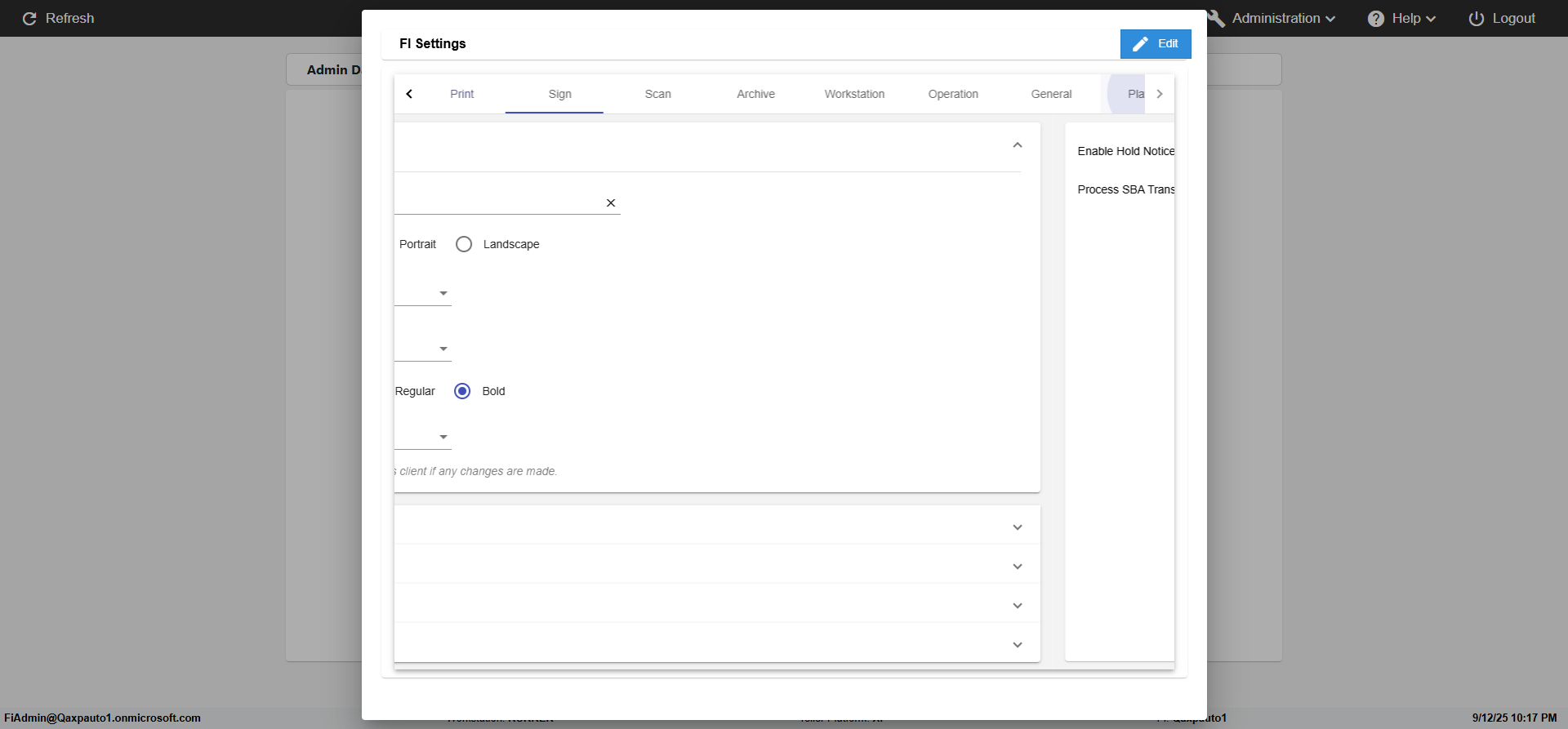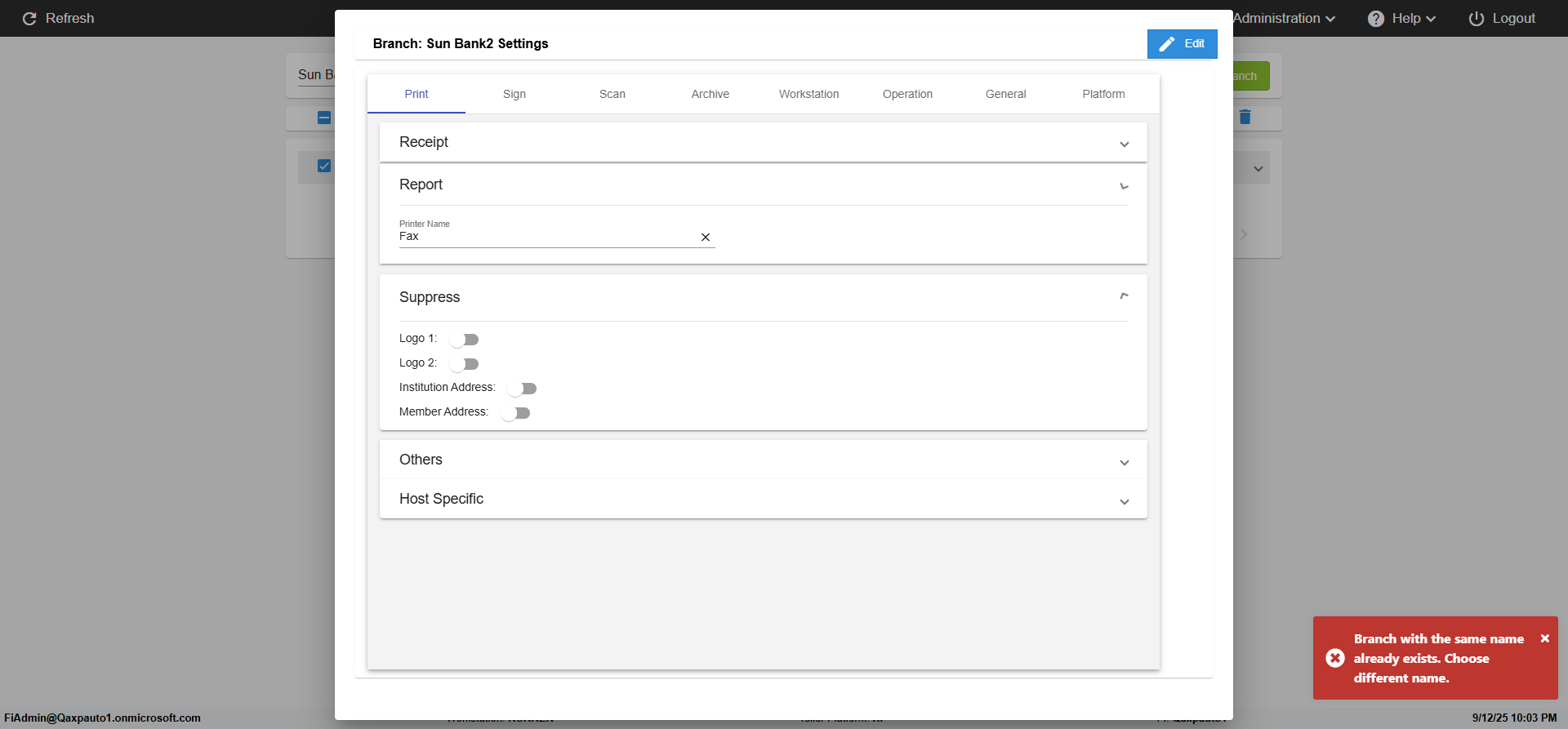 | {FromBranch=, Archived Transactions=, Description=verify FI Platform Settings In Admin, Archive=, Operation=, print signatur=, Name=, Clear=, TestID=verifyFIPlatformSettingsInAdmin, Phone=, MultipleWorkstation=, WorkstationName=, ToBranch=, WorkstationDeleteOption=, Subscription Names=, BranchName=, retention=, FilePath=, Agent=, UserPwd=iMM2022!, BranchDeleteOption=, Transtatus=Archived-false;Active-true;Error-false, Receipt=, Report=, Index_Field_Name=, Agents=, IPFilter=, Text=, Hold Notice=, Suppress=, SchedualType=, Date=, Platfrom=Enable Hold Notice-true;, GroupId=, print Disburstments=, Role=, Brand=, SMTP=, Print signature line=, TimeZone=, Imaging System=, Header=, MultipleBranches=, Username=fiAdmin@Qaxpauto1.onmicrosoft.com, MappedOption=, Sign=, Scan=, PortNumber=} |