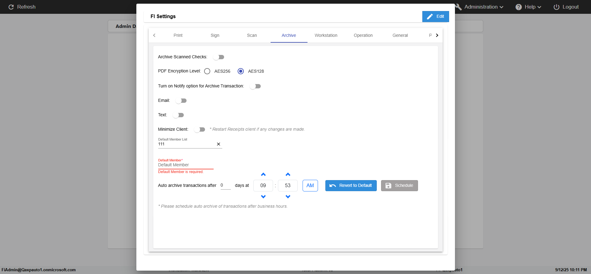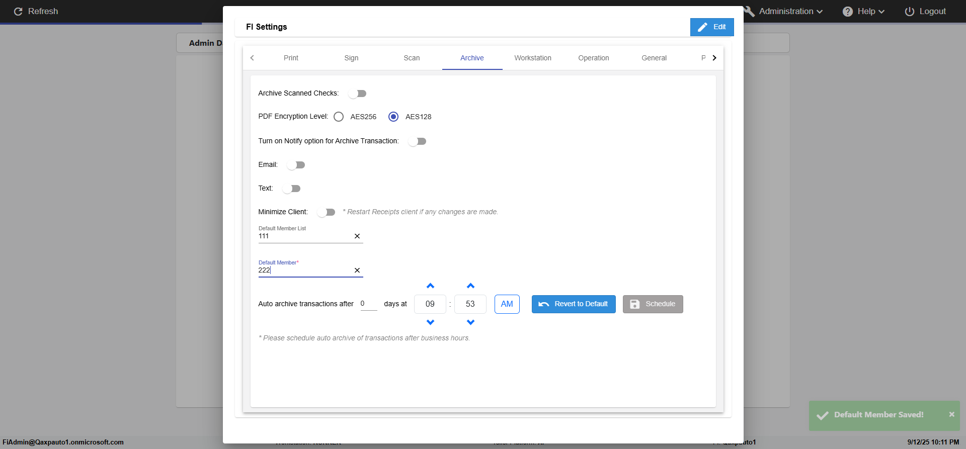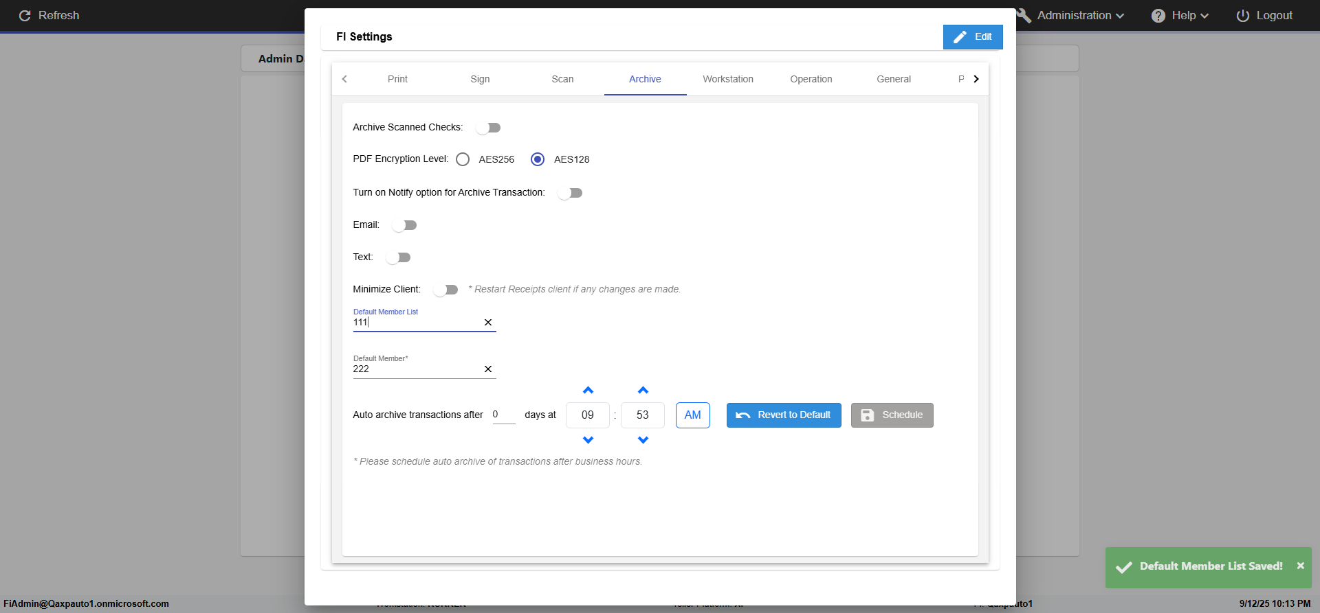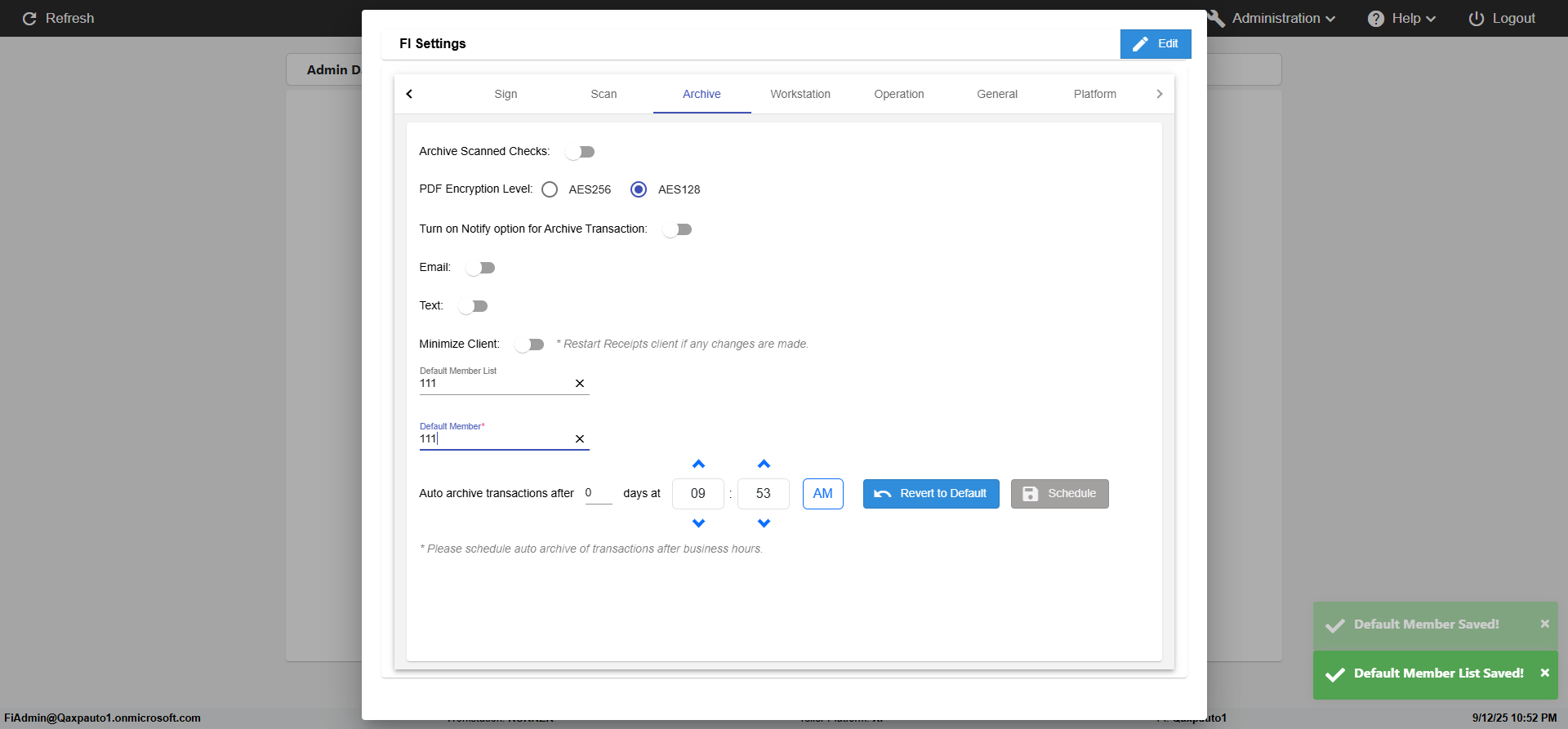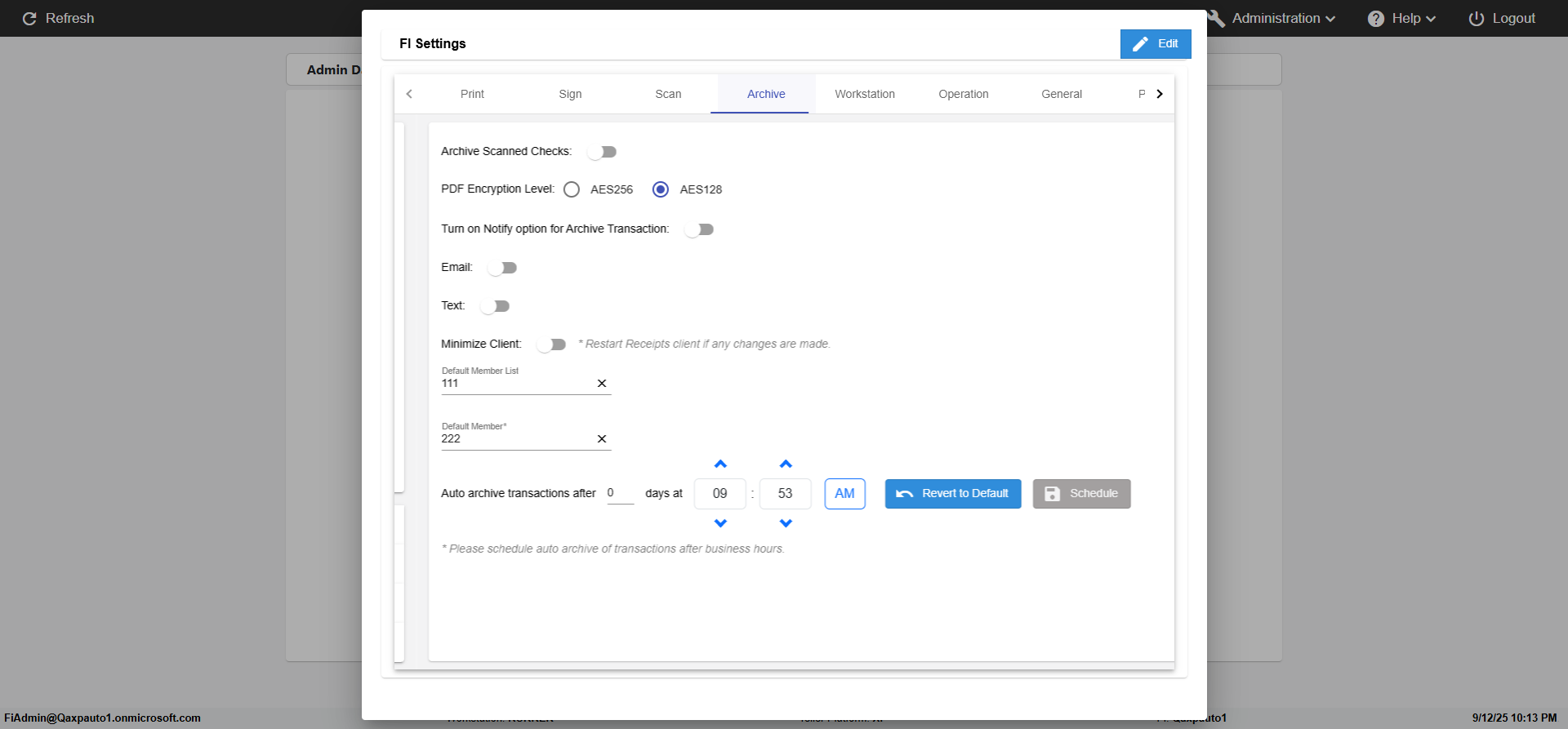 | {FromBranch=, Archived Transactions=, Description=verify Archive Settings In Admin, Archive=Archive Scanned Checks-false;PDFEncryptionLevel-128;Send Notifications-false;Email-false;Text-false;Minimize Client-false;Default Member Numbers-111;Default Member Number-111, Operation=, print signatur=, Name=, Clear=, TestID=verifyFIArchiveSettingsInAdmin, Phone=, MultipleWorkstation=, WorkstationName=, ToBranch=, WorkstationDeleteOption=, Subscription Names=, BranchName=, retention=, FilePath=, Agent=, UserPwd=iMM2022!, BranchDeleteOption=, Transtatus=Archived-false;Active-true;Error-false, Receipt=, Report=, Index_Field_Name=, Agents=, IPFilter=, Text=, Hold Notice=, Suppress=, SchedualType=, Date=, Platfrom=, GroupId=, print Disburstments=, Role=, Brand=, SMTP=, Print signature line=, TimeZone=, Imaging System=, Header=, MultipleBranches=, Username=fiAdmin@Qaxpauto1.onmicrosoft.com, MappedOption=, Sign=, Scan=, PortNumber=} |