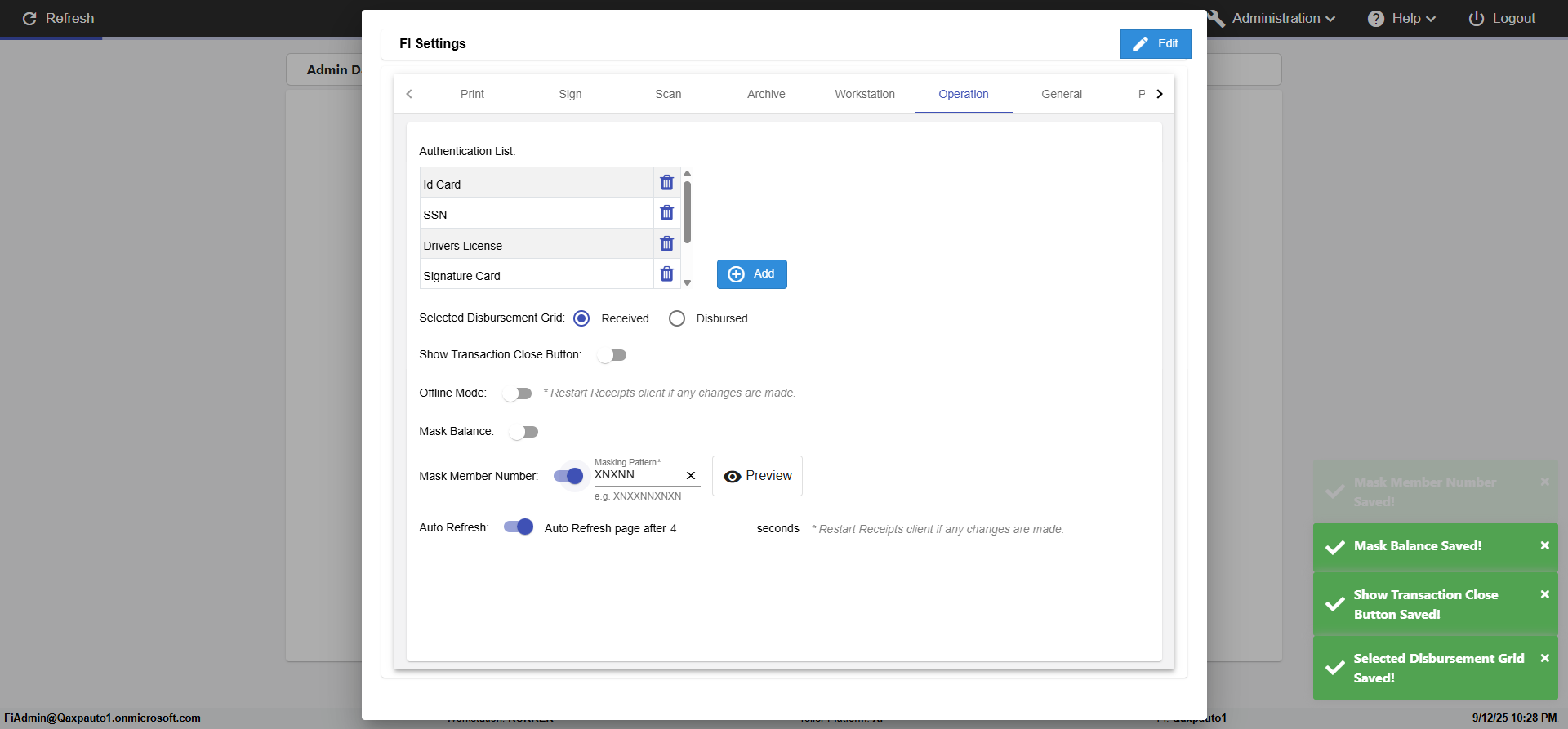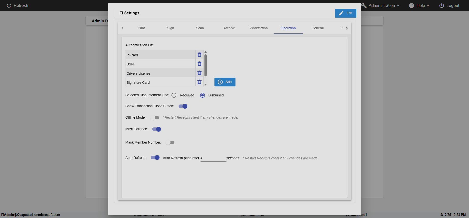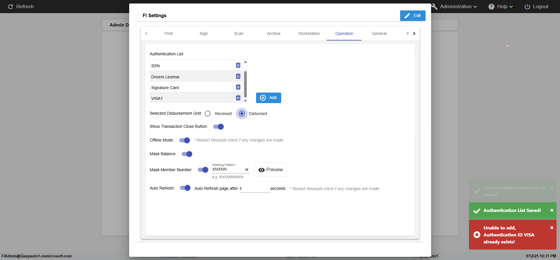 | {FromBranch=, Archived Transactions=, Description=verify operation In Admin Teller Portal Edit, Archive=Archive Scanned Checks-false;PDFEncryptionLevel-128;Send Notifications-false;Email-false;Text-false;Default Member Numbers-111;Default Member Number-111, Operation=Authentication List-Edit,VISA;Selected Disbursement Grid-Disbursed;Show Transaction Close Button-true;Mask Balance-false;Mask Receipt-false;Offline Mode-false, print signatur=TRUE, Name=, Clear=, TestID=verifyFIOperationSettingsInAdmin, Phone=, MultipleWorkstation=, WorkstationName=, ToBranch=, WorkstationDeleteOption=, Subscription Names=, BranchName=, retention=, FilePath=, Agent=, UserPwd=iMM2022!, BranchDeleteOption=, Transtatus=Archived-false;Active-true;Error-false, Receipt=Printer Name-Fax;Orientation-Portrait;Name-Courier New;Size-8;Style-Bold,Narrow, Report=Printer Name-Fax;Orientation-Portrait;Name-Consolas;Size-10;Style-Bold, Index_Field_Name=, Agents=Log File Location-C:\PDF\Logs;Log Event Level-Verbose;File Size in Bytes-10000000;Retained File Count Limit-10;File-True;Port-False, IPFilter=, Text=, Hold Notice=, Suppress=Log1-false;Log2-false;CuAddress-false;Member Address-false, SchedualType=, Date=, Platfrom=Hold Notice-true;, GroupId=, print Disburstments=FALSE, Role=, Brand=Logo 1-src/main/resources/testdata/files/Log1.jpg;Logo 2-src/main/resources/testdata/files/Log2.jpg;Receipt Marketing Message-Receipt Marketing Message;CU Address-CU Address;Marketing Image-src/main/resources/testdata/files/Log2.jpg;, SMTP=, Print signature line=print the sign, TimeZone=, Imaging System=, Header=, MultipleBranches=, Username=fiAdmin@Qaxpauto1.onmicrosoft.com, MappedOption=, Sign=Default Signature Device-Sigpad;Device Model-Topaz 4x5;Connection-COM3;Backlight-true, Scan=Scanner Type-ScanShell 3000D;Image Mode-Singleside;USB Connection-false,172.45.5.24, PortNumber=} |