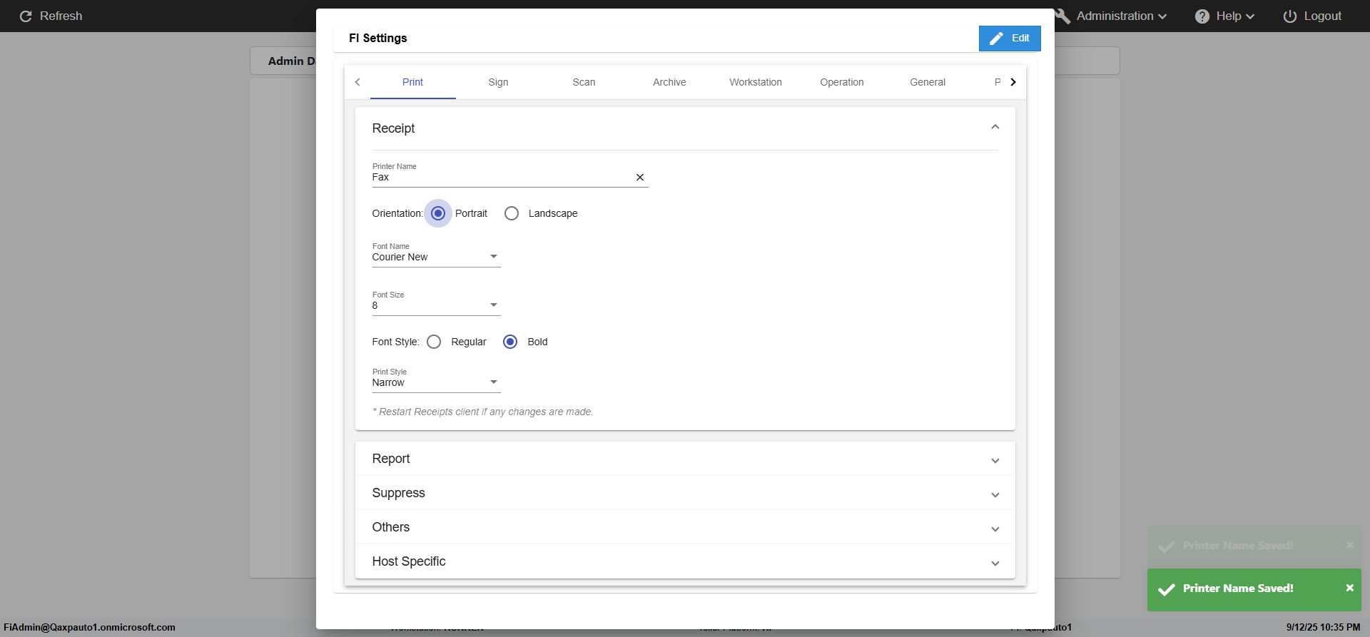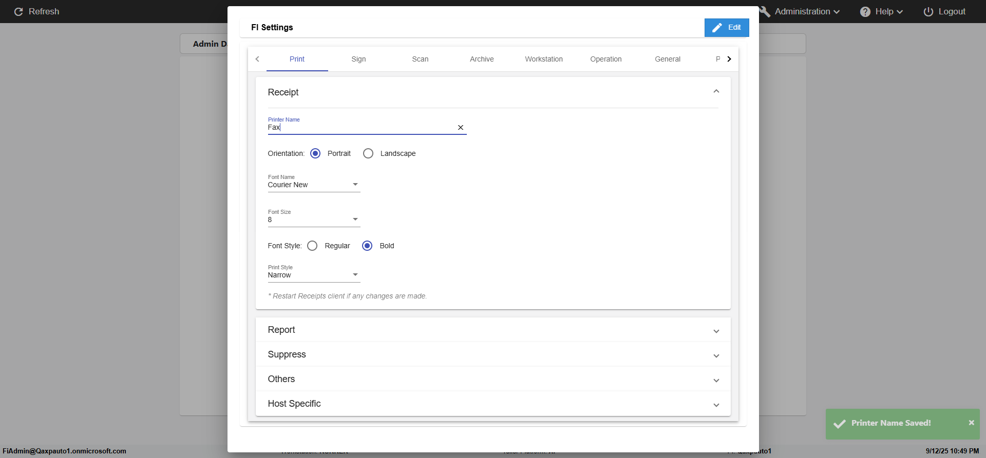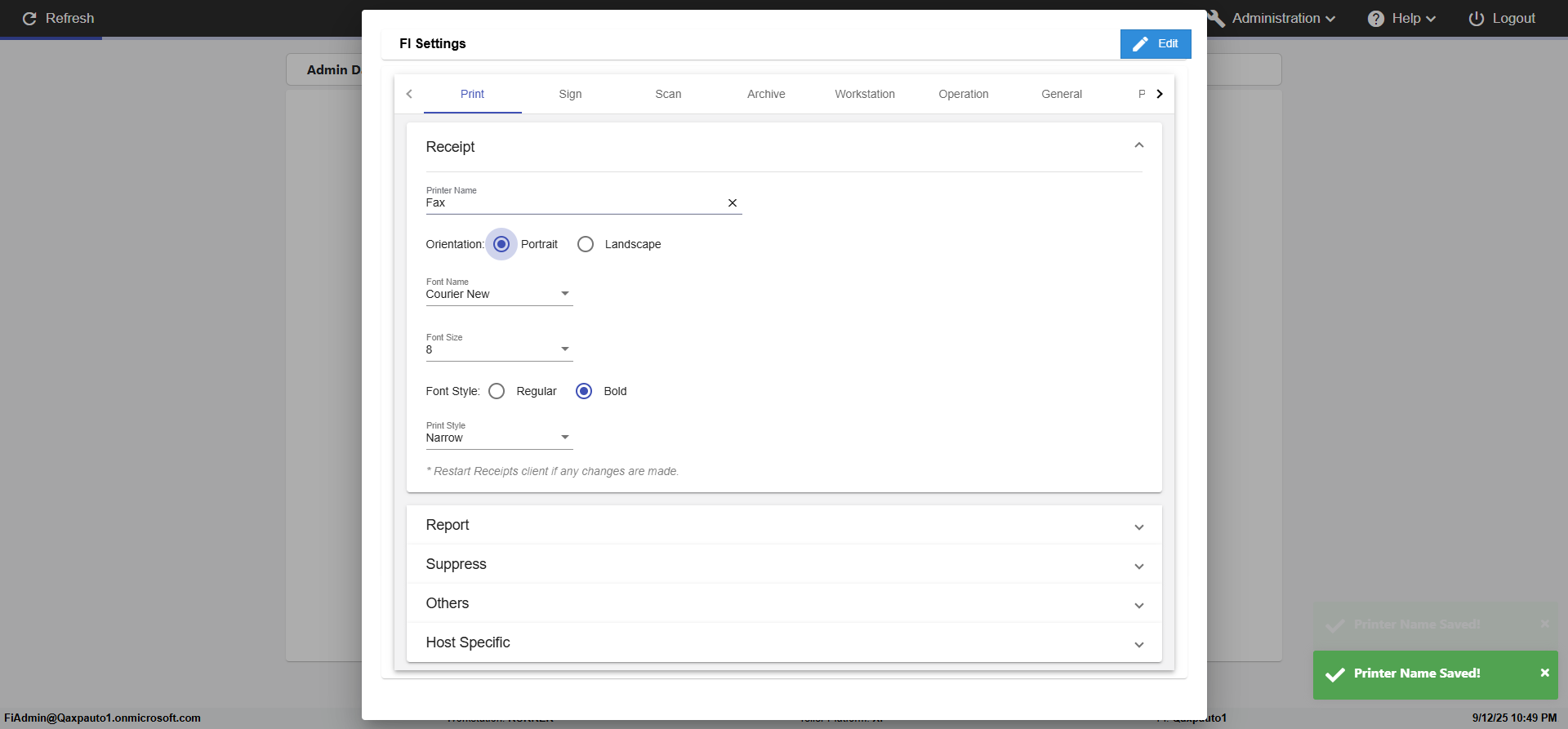 | {FromBranch=, Archived Transactions=, Description=verify print settings Admin Portal, Archive=, Operation=, print signatur=TRUE, Name=, Clear=, TestID=verifyFIPrintSettingsInAdmin, Phone=, MultipleWorkstation=, WorkstationName=, ToBranch=, WorkstationDeleteOption=, Subscription Names=, BranchName=, retention=, FilePath=, Agent=, UserPwd=iMM2022!, BranchDeleteOption=, Transtatus=Archived-false;Active-true;Error-false, Receipt=Printer Name-Fax;Orientation-Portrait;Name-Courier New;Size-8;Style-Bold,Narrow, Report=Printer Name-Fax;Orientation-Portrait;Name-Consolas;Size-10;Style-Bold, Index_Field_Name=, Agents=, IPFilter=, Text=, Hold Notice=, Suppress=Log1-false;Log2-false;CuAddress-false;Member Address-false, SchedualType=, Date=, Platfrom=, GroupId=, print Disburstments=FALSE, Role=, Brand=, SMTP=, Print signature line=print the sign, TimeZone=, Imaging System=, Header=, MultipleBranches=, Username=fiAdmin@Qaxpauto1.onmicrosoft.com, MappedOption=, Sign=, Scan=, PortNumber=} |