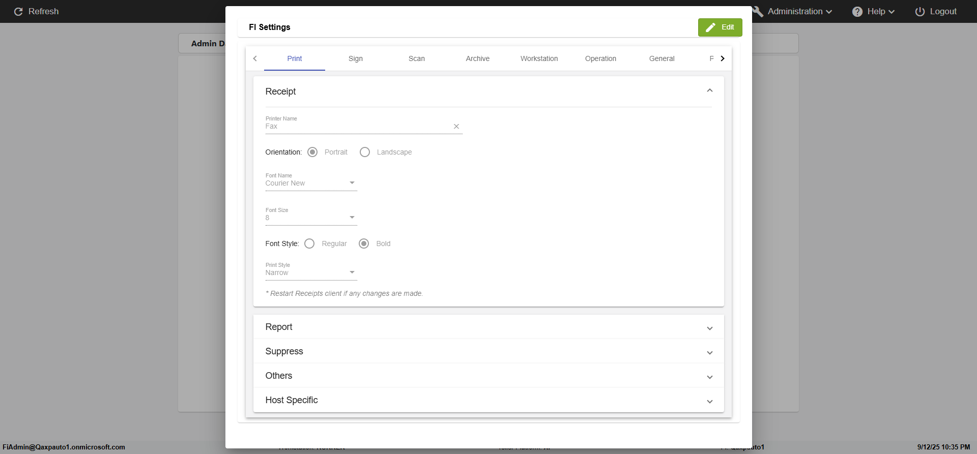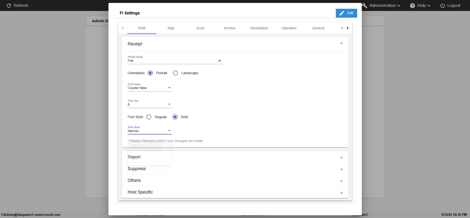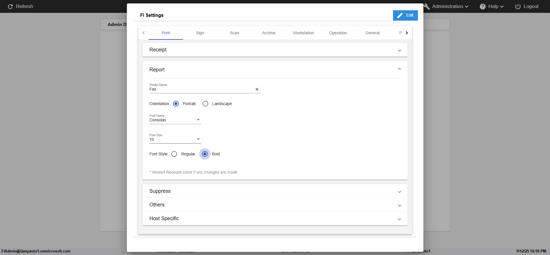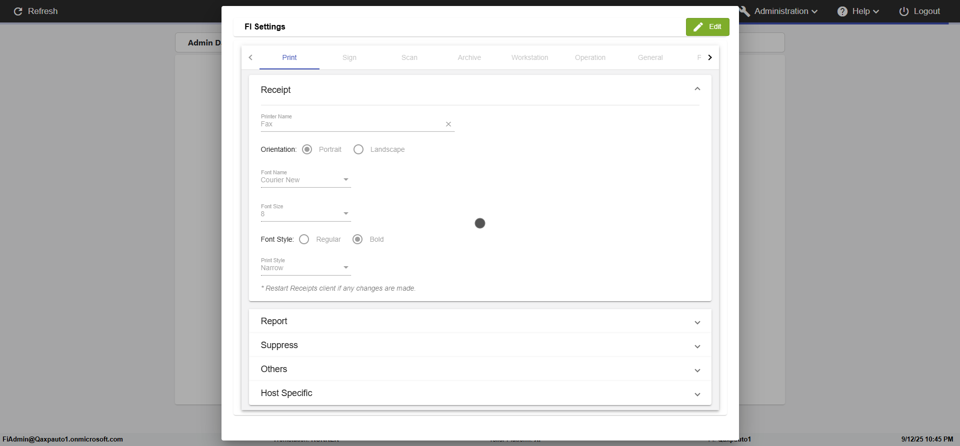 | {FromBranch=, Archived Transactions=, Description=verify print settings Admin Portal, Archive=, Operation=, print signatur=TRUE, Name=, Clear=, TestID=verifyFIPrintSettingsInAdmin, Phone=, MultipleWorkstation=, WorkstationName=, ToBranch=, WorkstationDeleteOption=, Subscription Names=, BranchName=, retention=, FilePath=, Agent=, UserPwd=iMM2022!, BranchDeleteOption=, Transtatus=Archived-false;Active-true;Error-false, Receipt=Printer Name-Fax;Orientation-Portrait;Name-Courier New;Size-8;Style-Bold,Narrow, Report=Printer Name-Fax;Orientation-Portrait;Name-Consolas;Size-10;Style-Bold, Index_Field_Name=, Agents=, IPFilter=, Text=, Hold Notice=, Suppress=Log1-false;Log2-false;CuAddress-false;Member Address-false, SchedualType=, Date=, Platfrom=, GroupId=, print Disburstments=FALSE, Role=, Brand=, SMTP=, Print signature line=print the sign, TimeZone=, Imaging System=, Header=, MultipleBranches=, Username=fiAdmin@Qaxpauto1.onmicrosoft.com, MappedOption=, Sign=, Scan=, PortNumber=} |