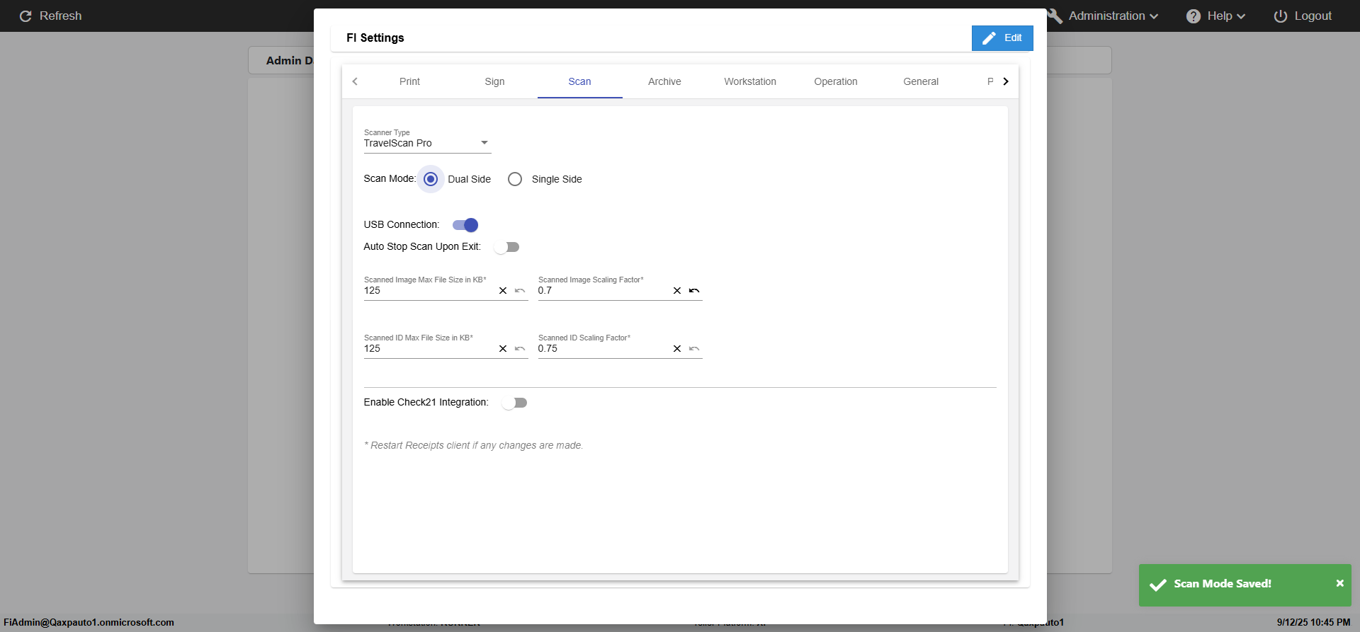| {FromBranch=, Archived Transactions=, Description=verify Scan Settings In Admin, Archive=, Operation=, print signatur=, Name=, Clear=, TestID=verifyFIScanSettingsInAdmin, Phone=, MultipleWorkstation=, WorkstationName=, ToBranch=, WorkstationDeleteOption=, Subscription Names=, BranchName=, retention=, FilePath=, Agent=, UserPwd=iMM2022!, BranchDeleteOption=, Transtatus=Archived-false;Active-true;Error-false, Receipt=, Report=, Index_Field_Name=, Agents=, IPFilter=, Text=, Hold Notice=, Suppress=, SchedualType=, Date=, Platfrom=, GroupId=, print Disburstments=, Role=, Brand=Logo 1-src/main/resources/testdata/files/Log1.jpg;Logo 2-src/main/resources/testdata/files/Log2.jpg;Receipt Marketing Message-Receipt Marketing Message;CU Address-CU Address;Marketing Image-src/main/resources/testdata/files/Log2.jpg;, SMTP=, Print signature line=, TimeZone=, Imaging System=, Header=, MultipleBranches=, Username=fiAdmin@Qaxpauto1.onmicrosoft.com, MappedOption=, Sign=, Scan=Scanner Type-TravelScan Pro;Image Mode-DualSide;USB Connection-true;CK21 Integration-False;, PortNumber=} |