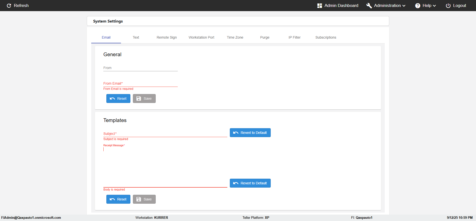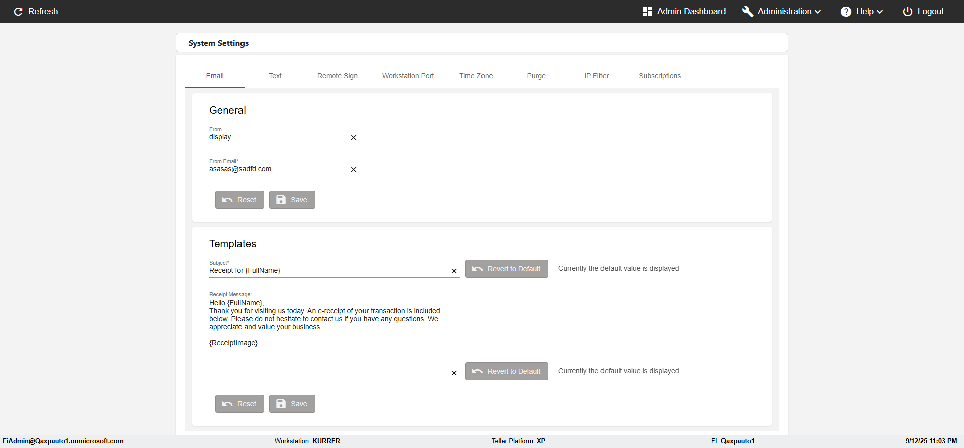 | {FromBranch=, Archived Transactions=, Description=verify Text Settings In Admin Teller Portal, Archive=, Operation=, print signatur=, Name=FIAdminGroup, Clear=, TestID=verifySystemSettingsTextTab, Phone=Please see receipt below, MultipleWorkstation=, WorkstationName=, ToBranch=, WorkstationDeleteOption=, Subscription Names=, BranchName=, retention=9, FilePath=, Agent=, UserPwd=iMM2022!, BranchDeleteOption=, Transtatus=Archived-false;Active-true;Error-false, Receipt=, Report=, Index_Field_Name=, Agents=, IPFilter=, Text=Please see receipt below, Hold Notice=, Suppress=, SchedualType=, Date=, Platfrom=, GroupId=, print Disburstments=, Role=, Brand=, SMTP=From Display Name-display;From Email-asasas@sadfd.com;Subject-Demo;Receipt Message-Please see ereceipt below. Thank you!, Print signature line=, TimeZone=Eastern Standard Time, Imaging System=, Header=, MultipleBranches=, Username=fiAdmin@Qaxpauto1.onmicrosoft.com, MappedOption=, Sign=, Scan=, PortNumber=9108} |