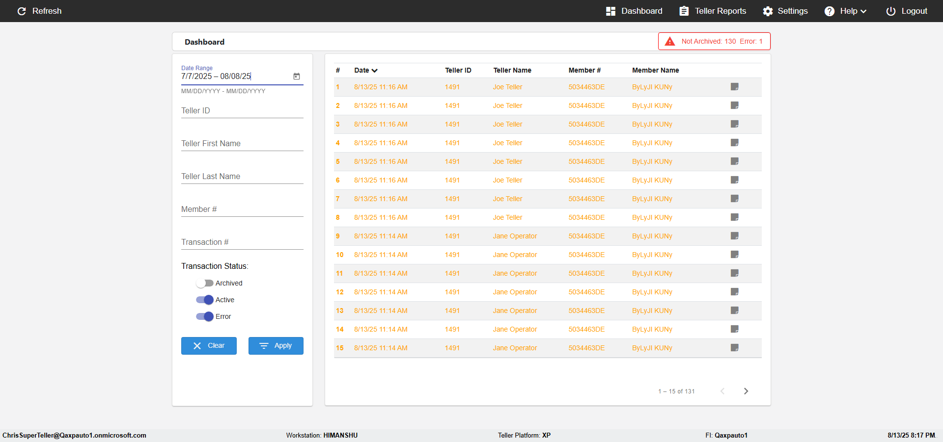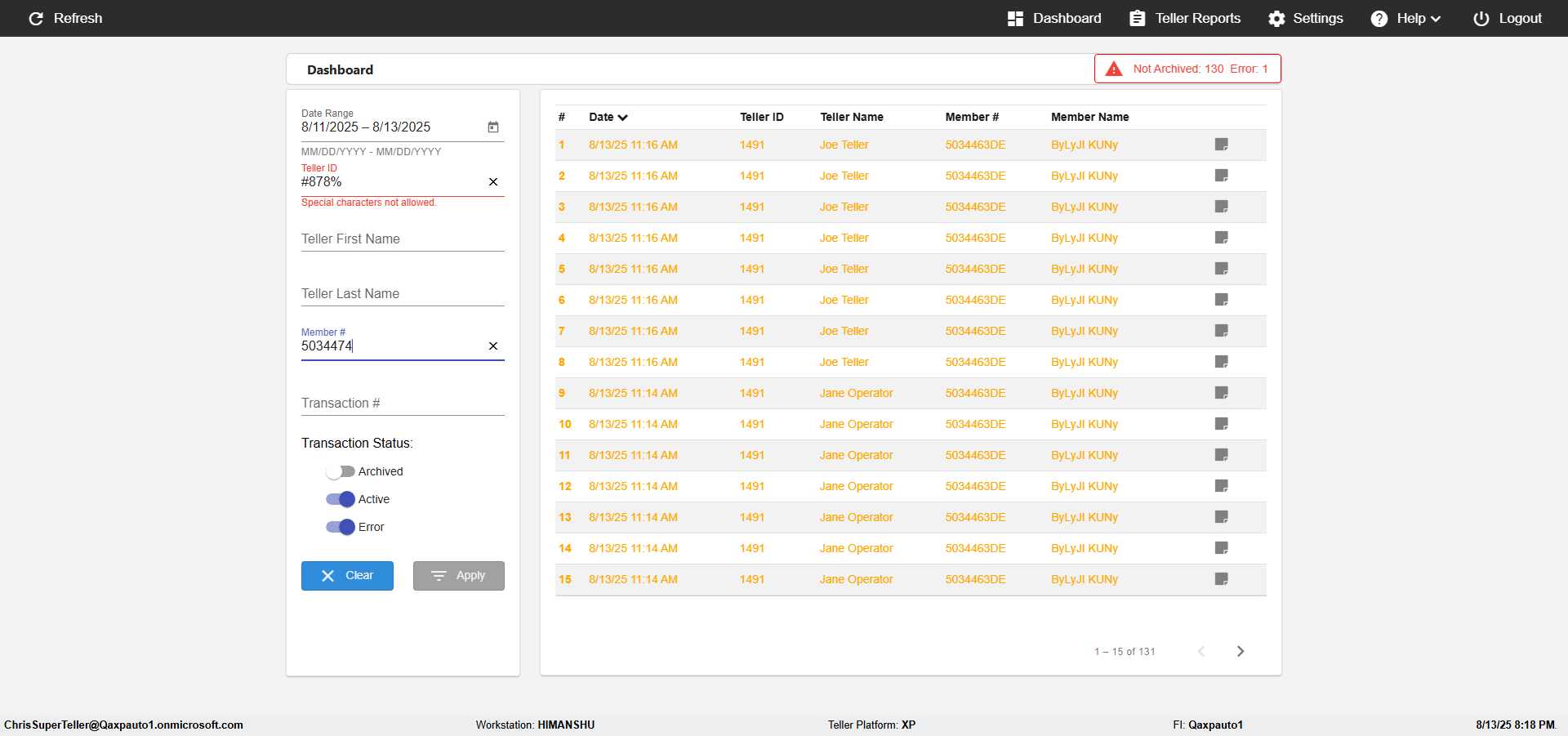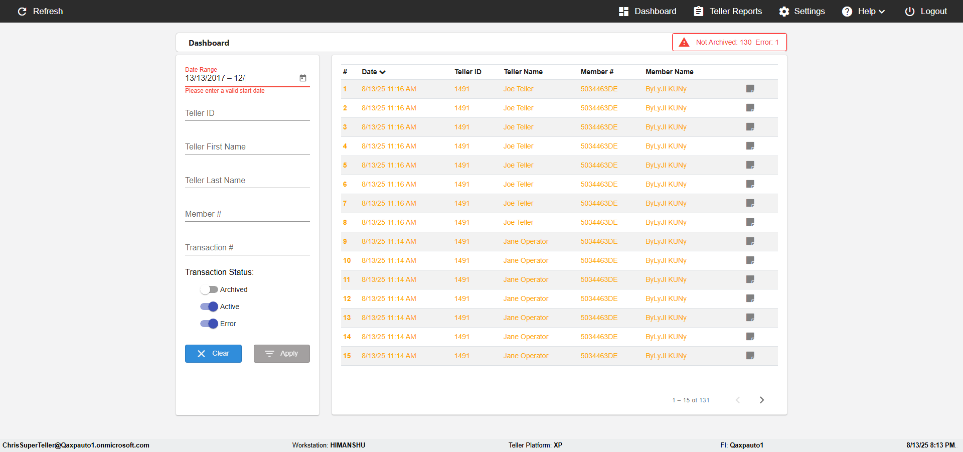 | verifyErrorMessagesInDashBoardPage: verify Error Messages In DashBoard Page with Teller First and Last name | |||