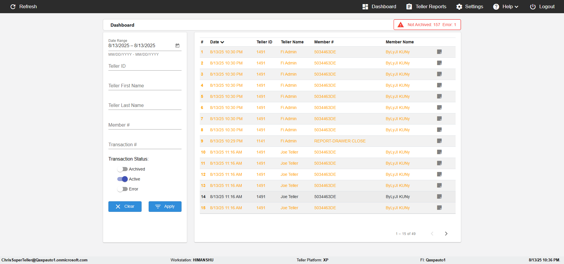 | 10:36:49 PM | Super Teller -Successfully verifed 'Date','Teller#','FirstName','LastName','Member ID','Transaction id','Archive Trancation','Apply','Clear' UI Elemnts in the 'Dashboard' page [ScreenShot] | |