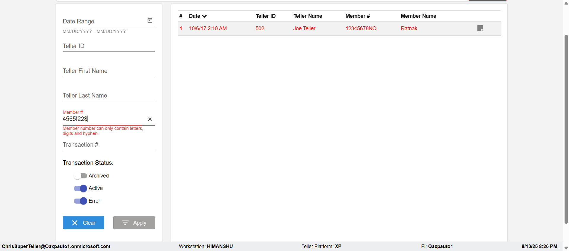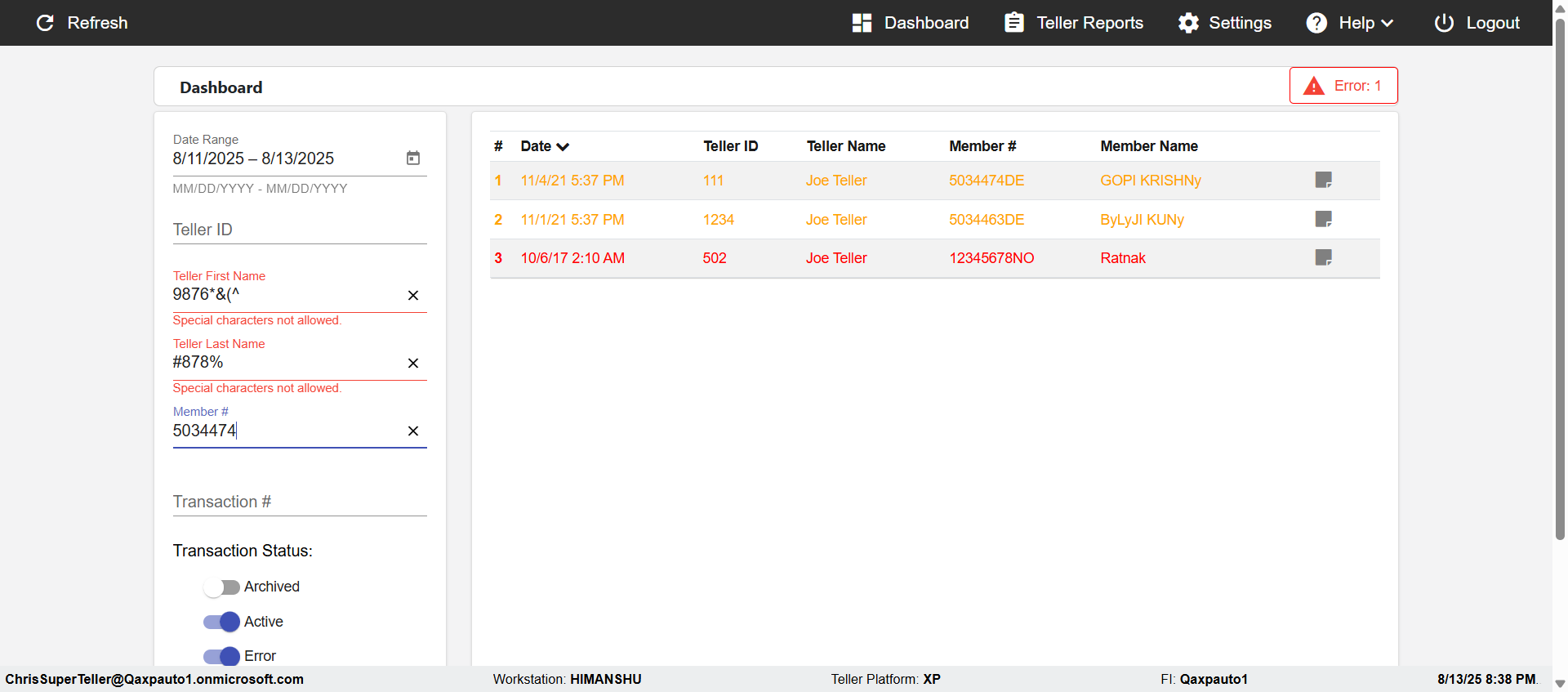 | 08:26:29 pm | Expected: verify the Error message in Dashboard Page:Member number can only contain letters, digits and hyphen. Actual(Passed): Successfully verified the Error message in configvalue Page:Member number can only contain letters, digits and hyphen. [ScreenShot] |