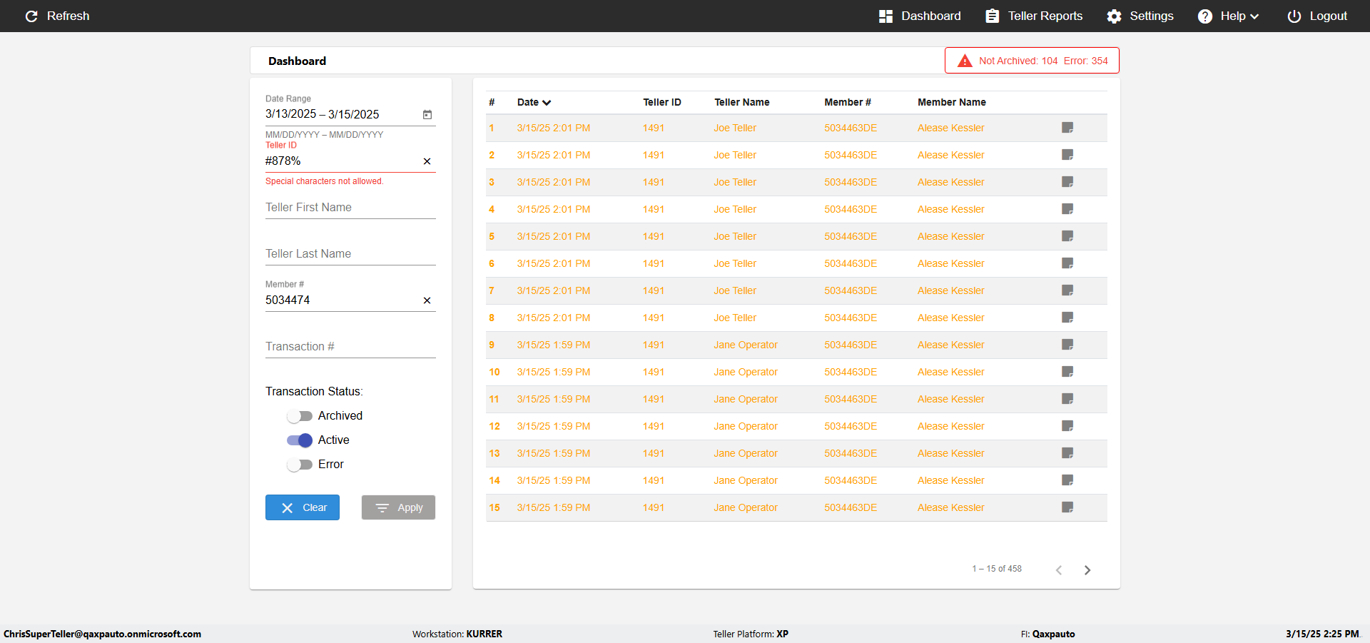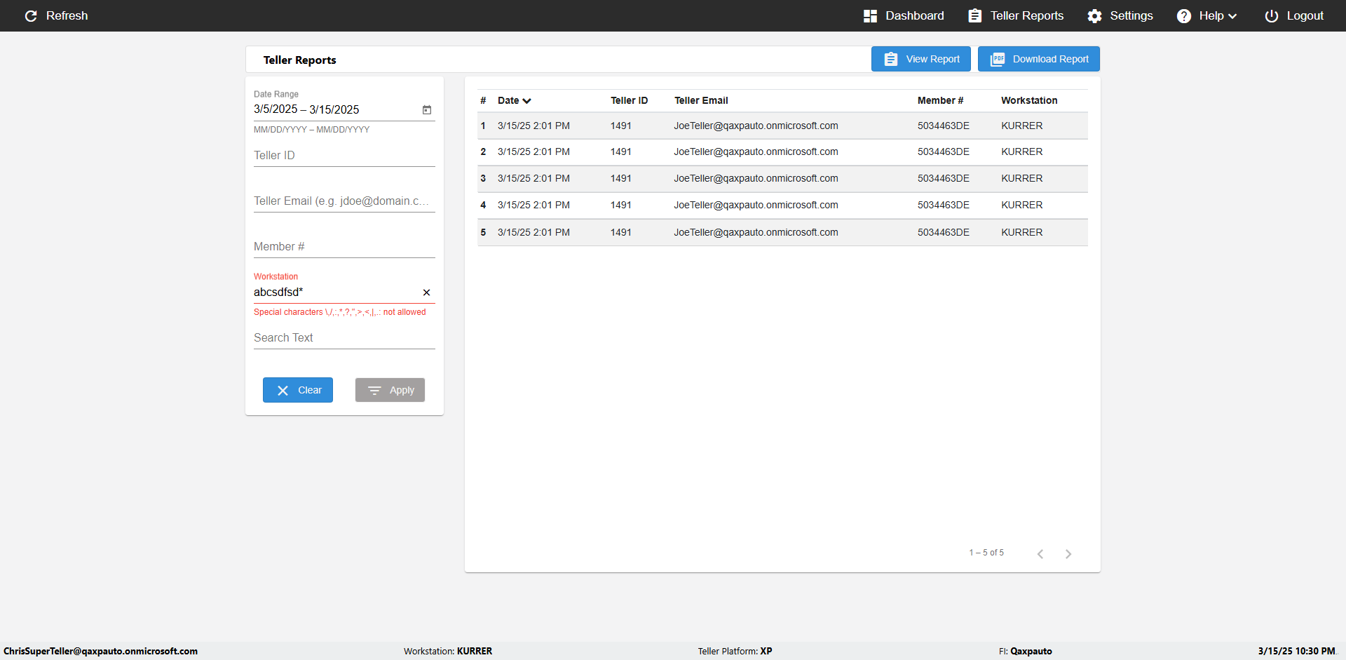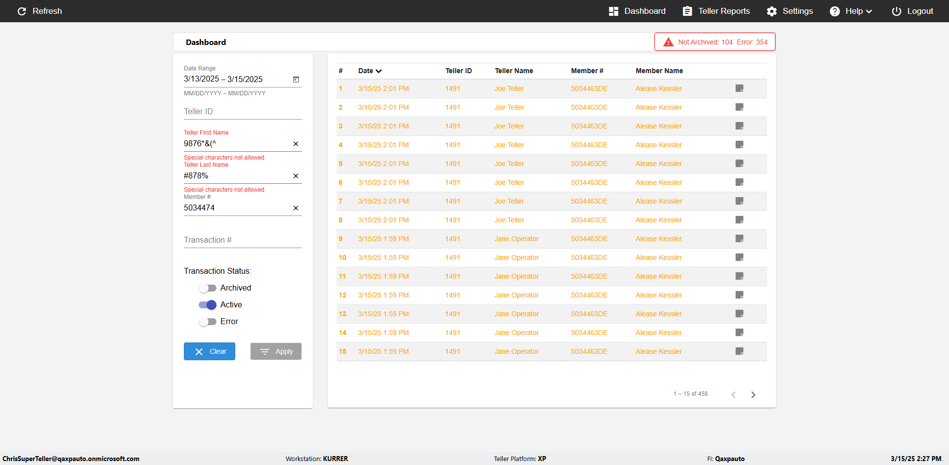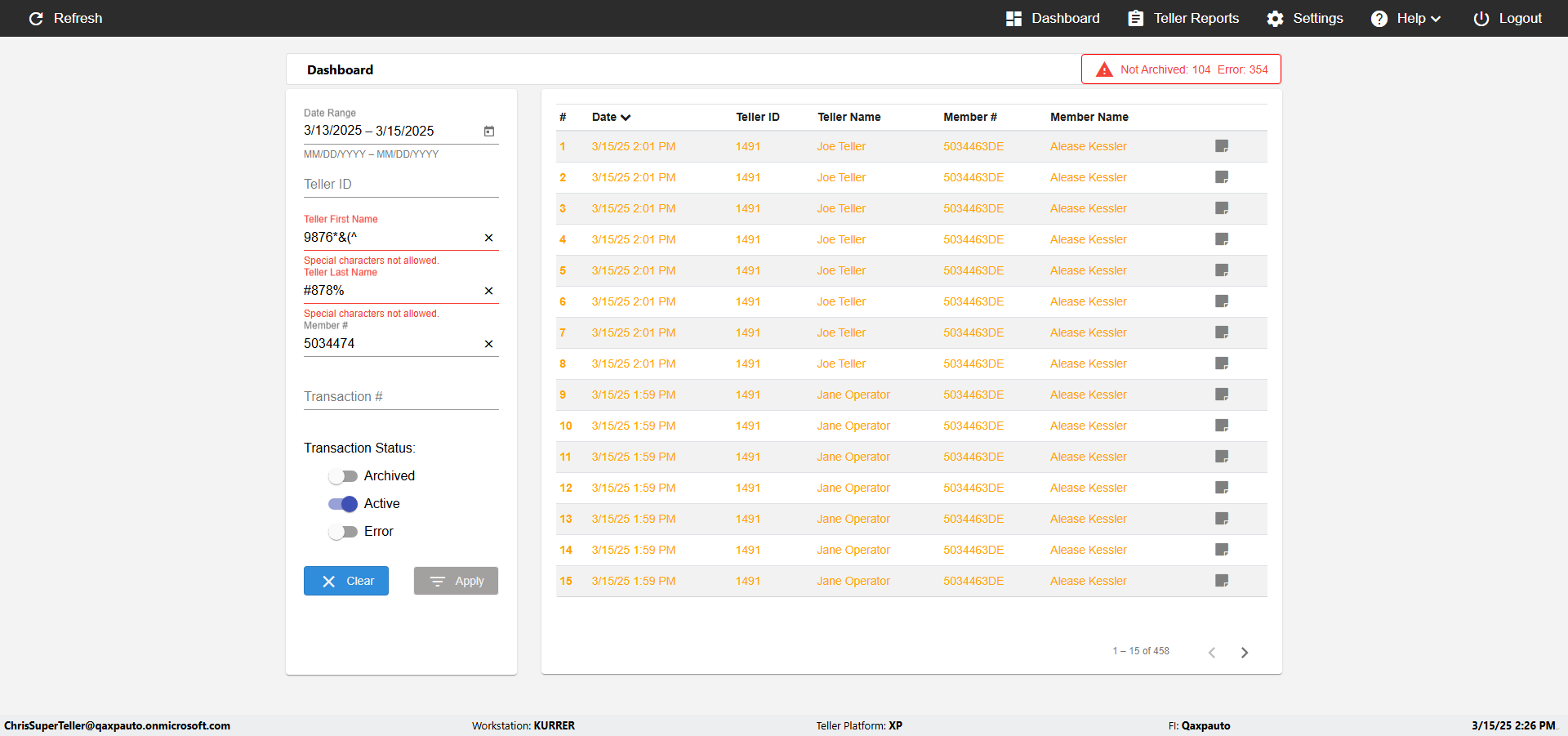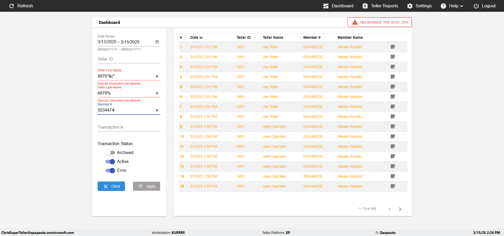 | {UserPwd=iMM2022!, Description=verify Error Messages in Report Page for Teller ID, Teller ID=%&^heg, errorMessage=Special characters not allowed., Teller Email=, View=, Date=, Clear=, Workstation=, errorint=1, TestID=verifyErrorMessagesInReports, Transaction=, Header=, Username=ChrisSuperTeller@Qaxpauto.onmicrosoft.com, Export=, Member #=, Search Text=, Level=} |