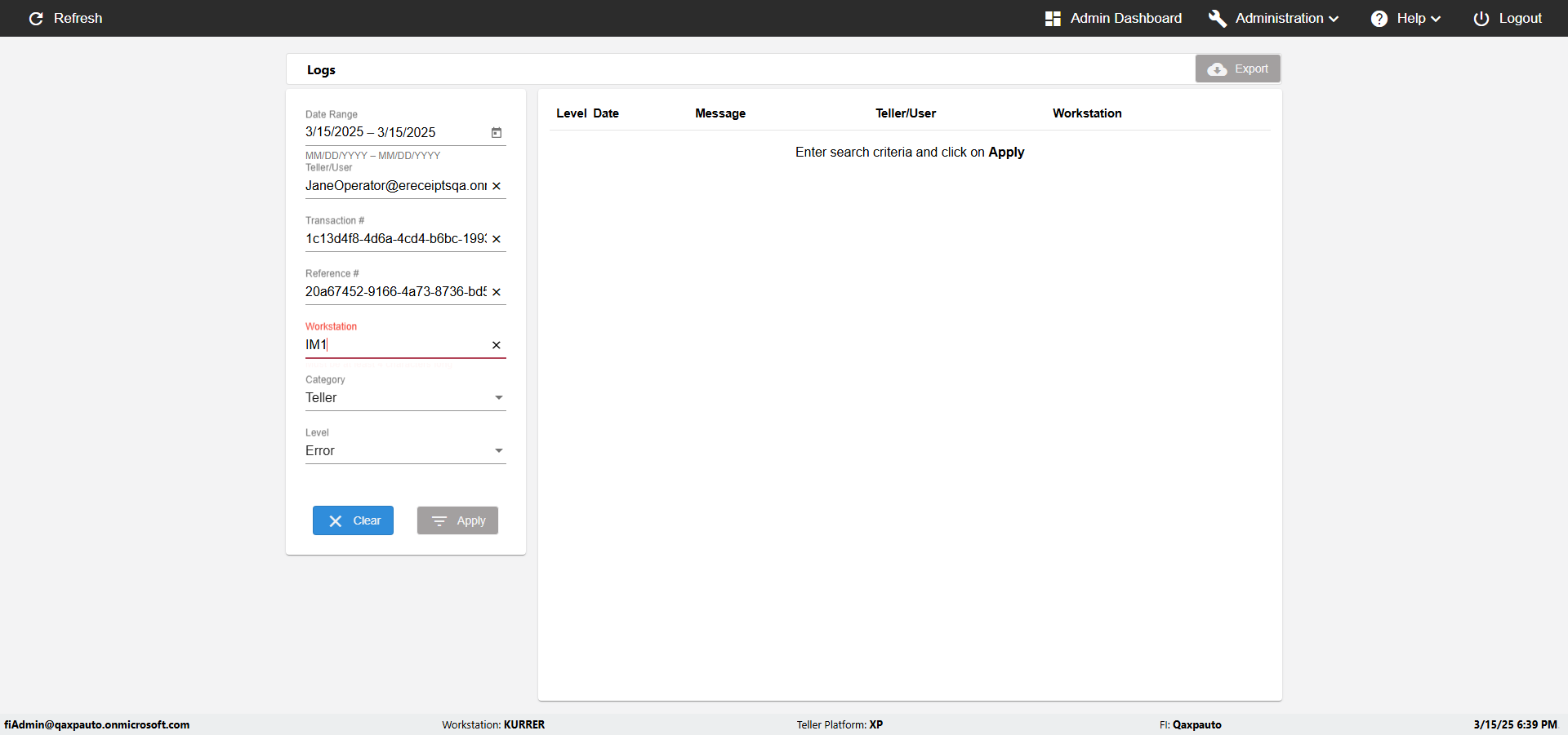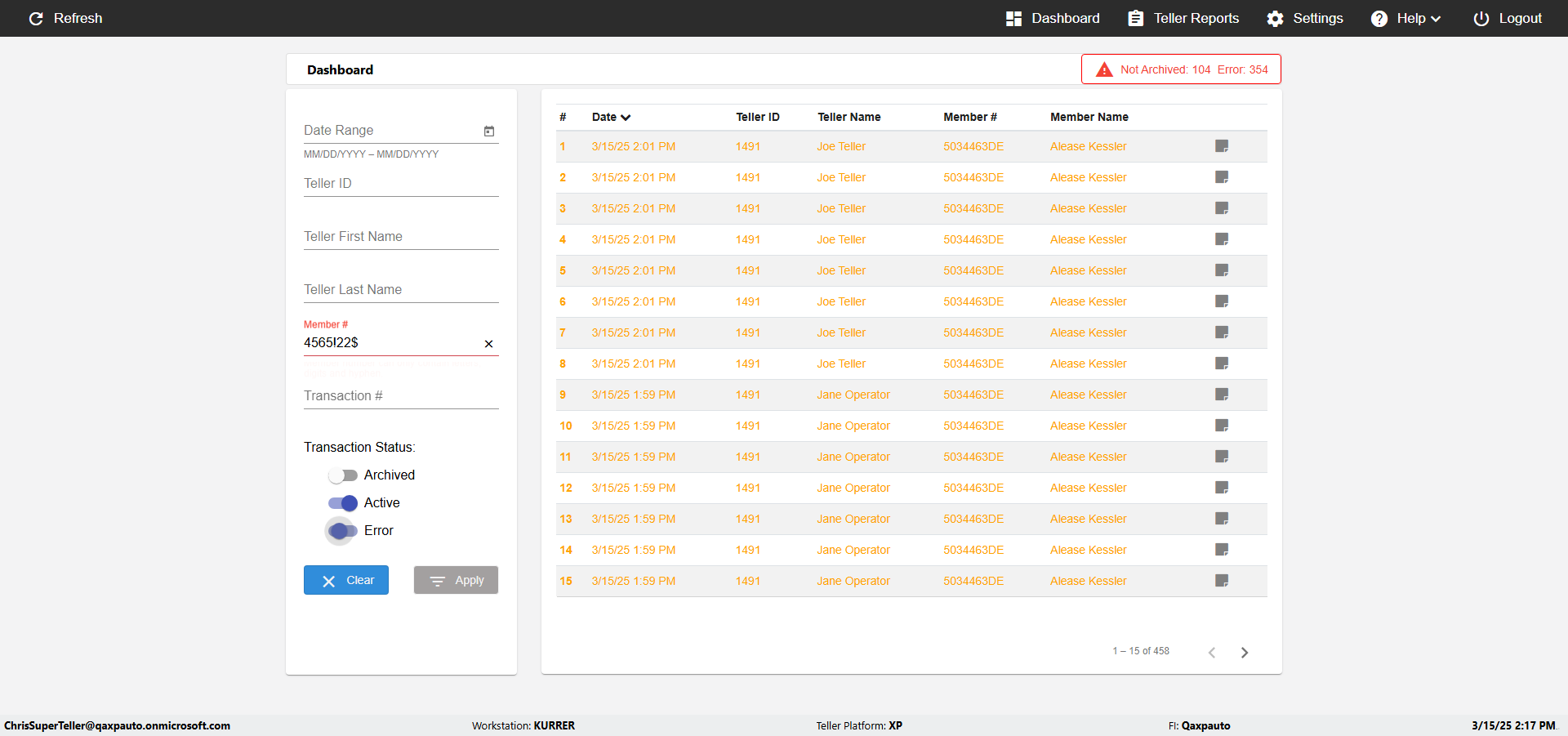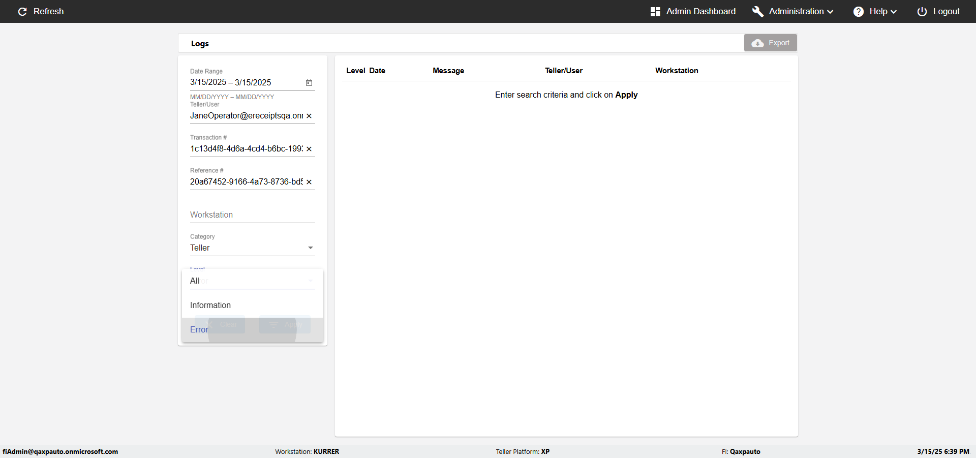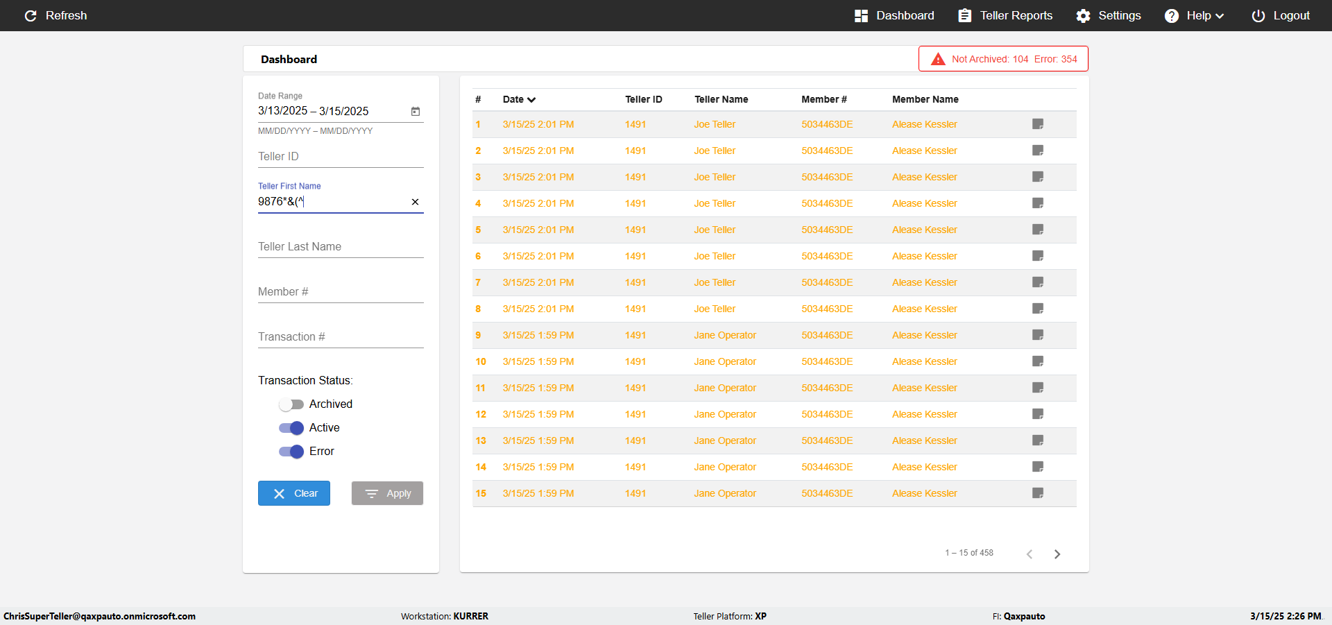 | {UserPwd=iMM2022!, Description=verify Error Messages in Report Page for Teller ID, Teller ID=%&^heg, errorMessage=Special characters not allowed., Teller Email=, View=, Date=, Clear=, Workstation=, errorint=1, TestID=verifyErrorMessagesInReports, Transaction=, Header=, Username=ChrisSuperTeller@Qaxpauto.onmicrosoft.com, Export=, Member #=, Search Text=, Level=} |