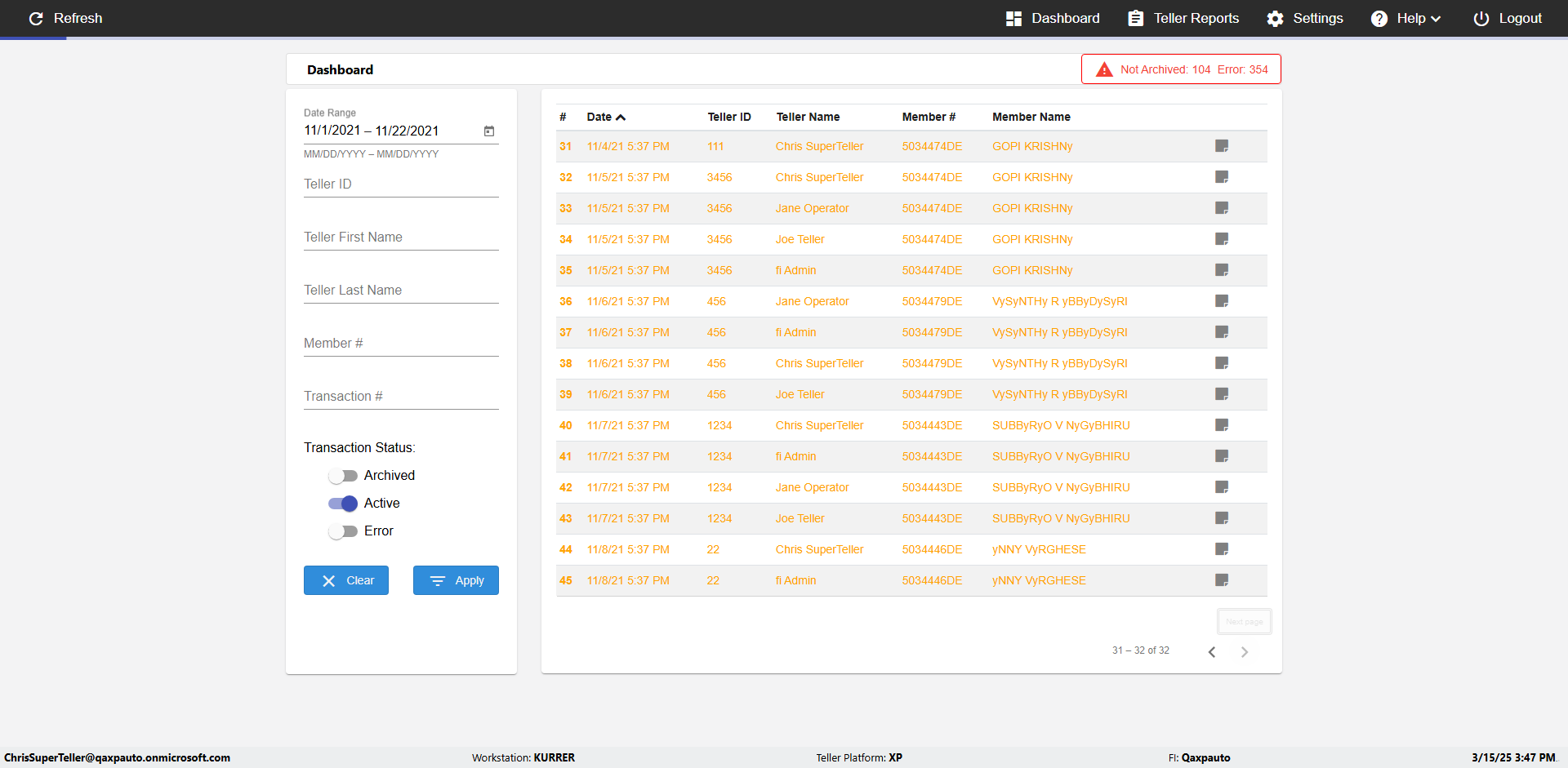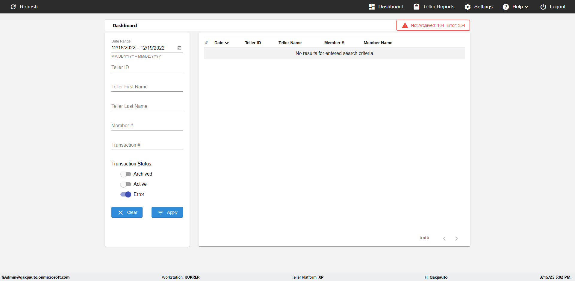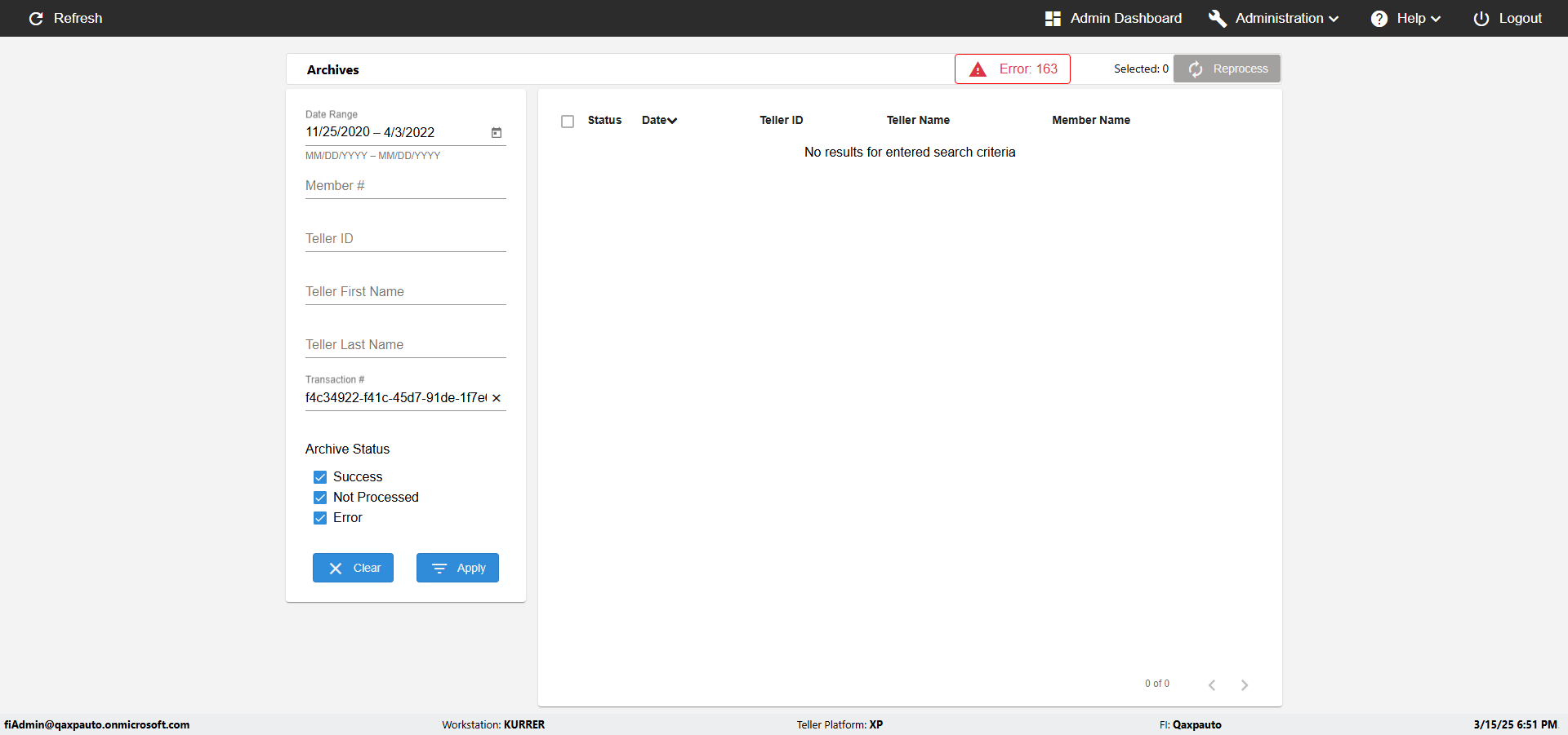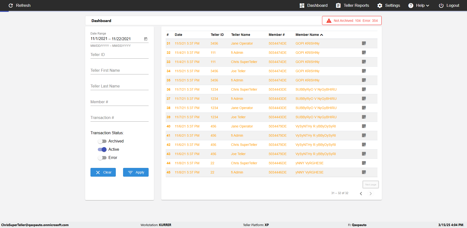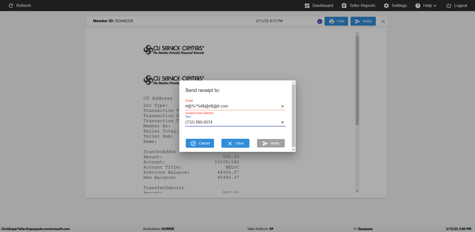 | {UserPwd=iMM2022!, Description=verify Error Messages in Report Page for Teller ID, Teller ID=%&^heg, errorMessage=Special characters not allowed., Teller Email=, View=, Date=, Clear=, Workstation=, errorint=1, TestID=verifyErrorMessagesInReports, Transaction=, Header=, Username=ChrisSuperTeller@Qaxpauto.onmicrosoft.com, Export=, Member #=, Search Text=, Level=} |