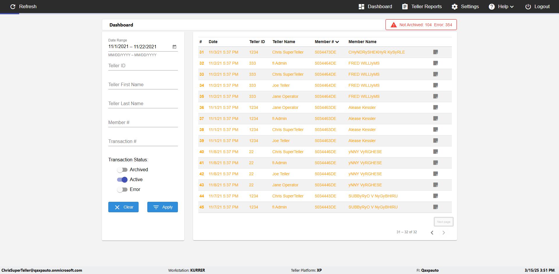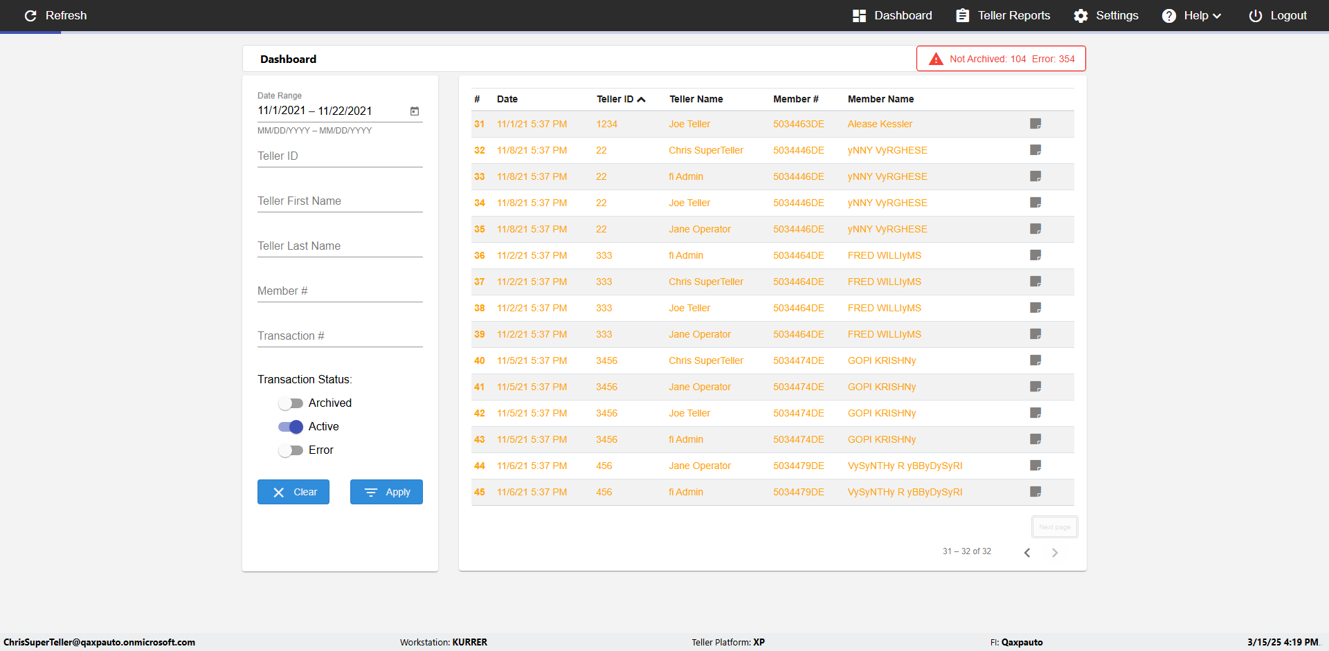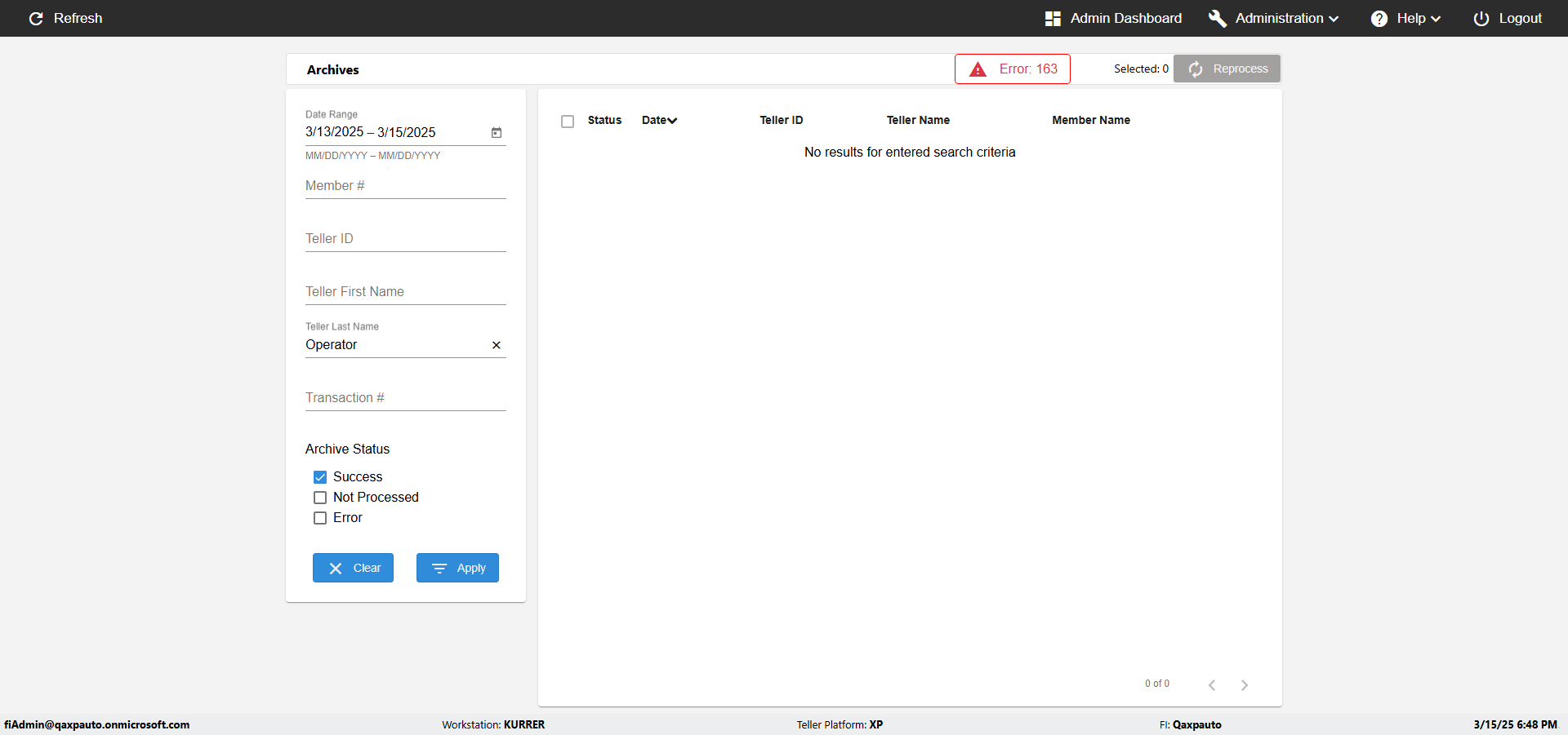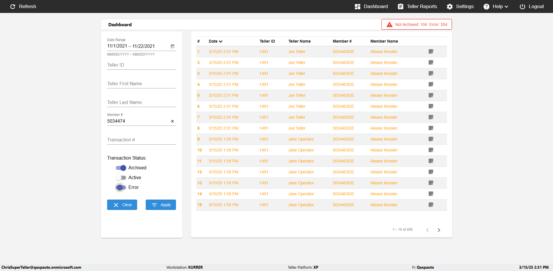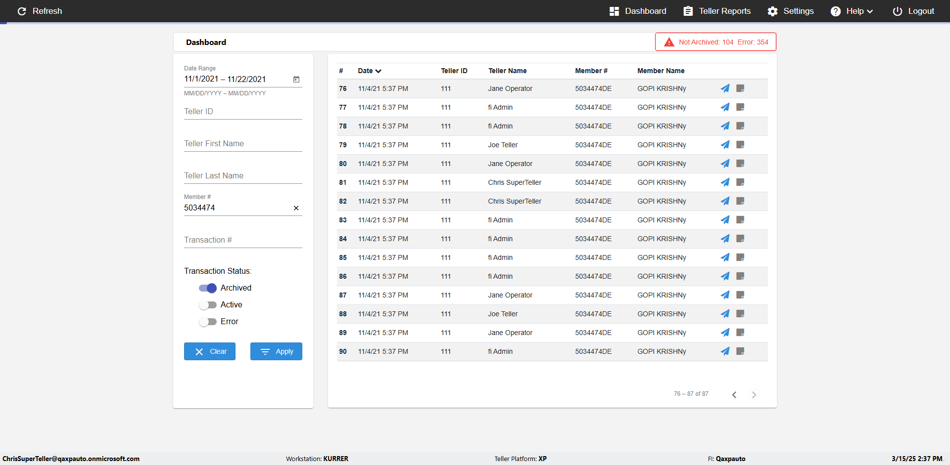 | {UserPwd=iMM2022!, Description=verify Error Messages in Report Page for Teller ID, Teller ID=%&^heg, errorMessage=Special characters not allowed., Teller Email=, View=, Date=, Clear=, Workstation=, errorint=1, TestID=verifyErrorMessagesInReports, Transaction=, Header=, Username=ChrisSuperTeller@Qaxpauto.onmicrosoft.com, Export=, Member #=, Search Text=, Level=} |