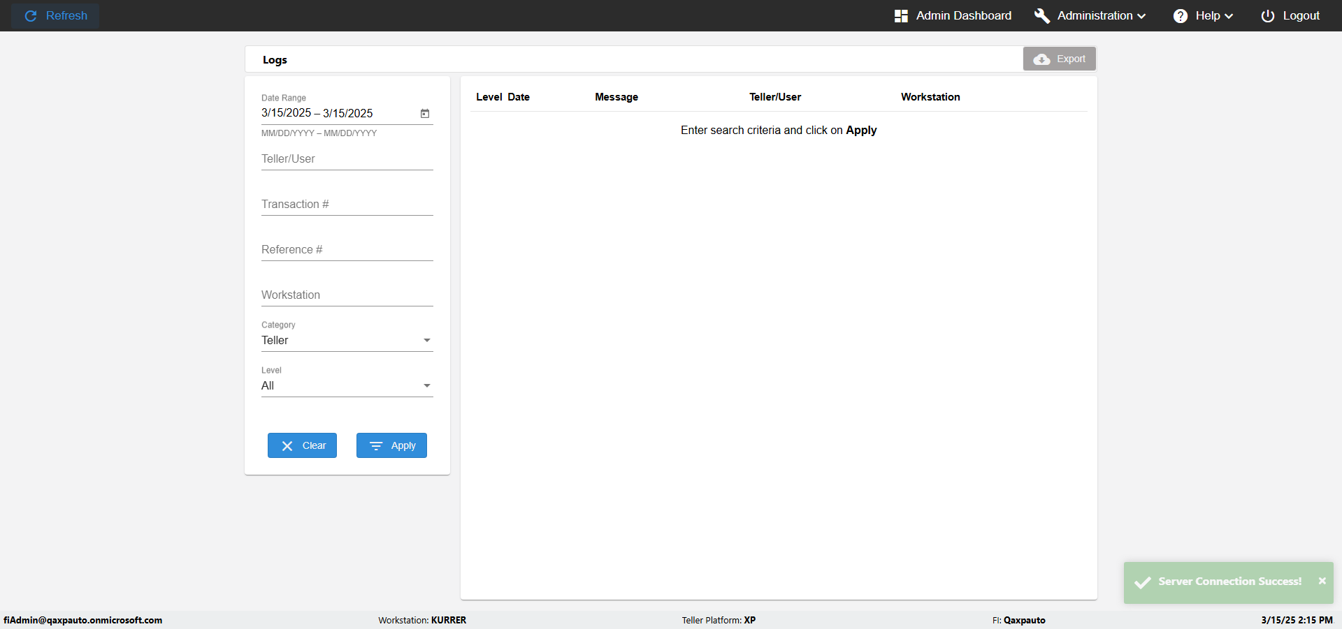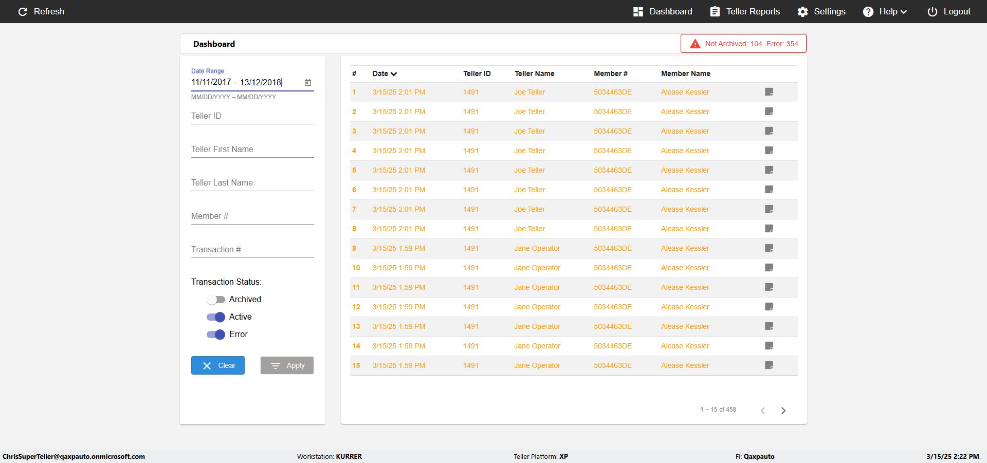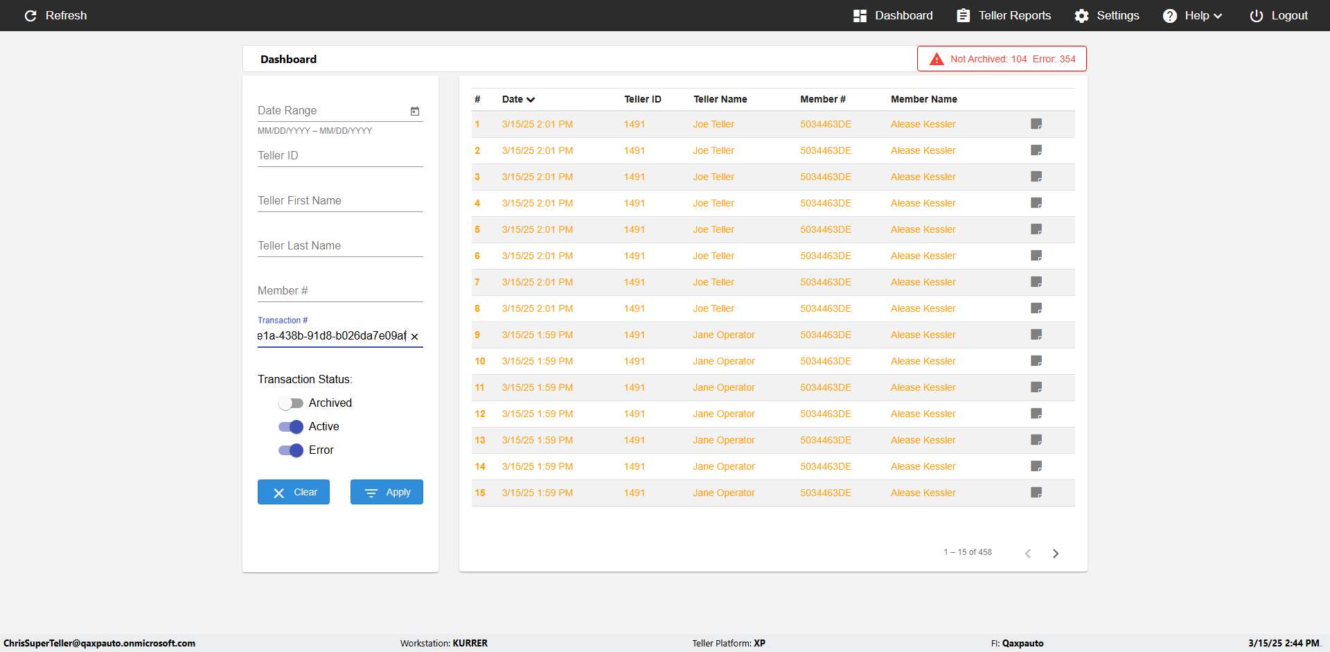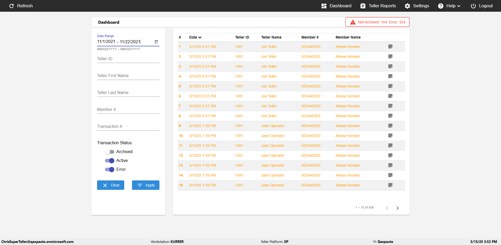 | {UserPwd=iMM2022!, Description=verify Error Messages in Report Page for Teller ID, Teller ID=%&^heg, errorMessage=Special characters not allowed., Teller Email=, View=, Date=, Clear=, Workstation=, errorint=1, TestID=verifyErrorMessagesInReports, Transaction=, Header=, Username=ChrisSuperTeller@Qaxpauto.onmicrosoft.com, Export=, Member #=, Search Text=, Level=} |