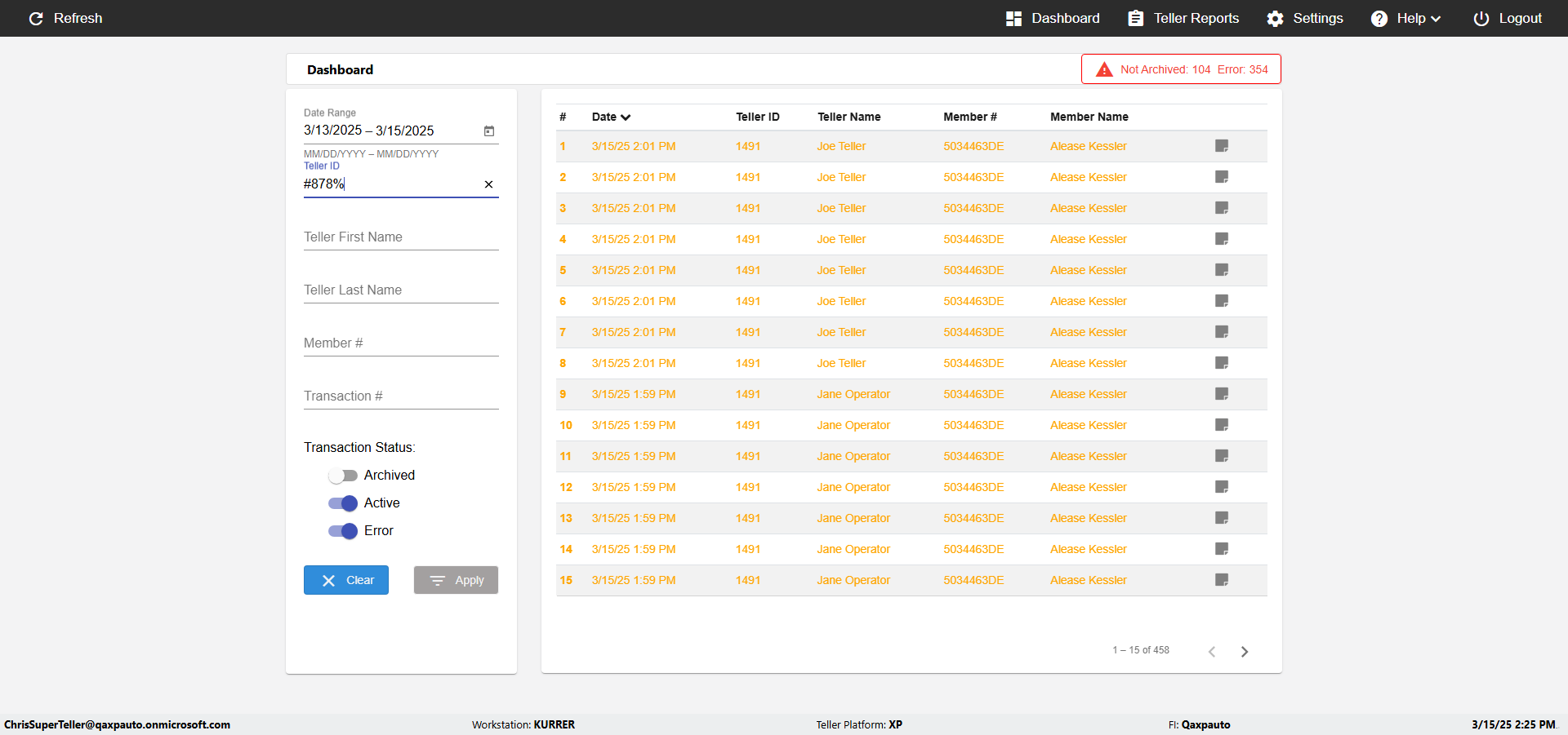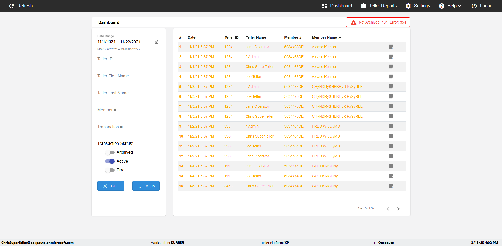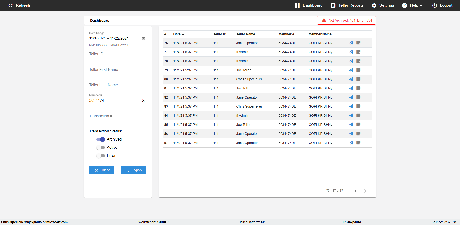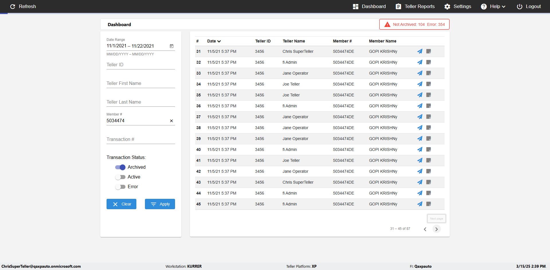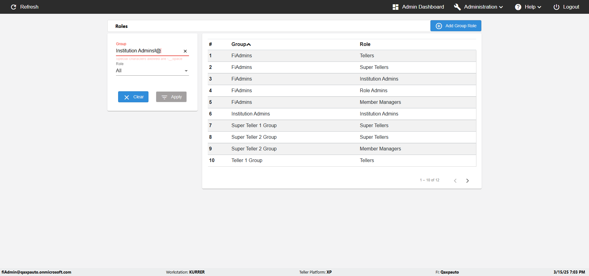 | {UserPwd=iMM2022!, Description=verify Error Messages in Report Page for Teller ID, Teller ID=%&^heg, errorMessage=Special characters not allowed., Teller Email=, View=, Date=, Clear=, Workstation=, errorint=1, TestID=verifyErrorMessagesInReports, Transaction=, Header=, Username=ChrisSuperTeller@Qaxpauto.onmicrosoft.com, Export=, Member #=, Search Text=, Level=} |