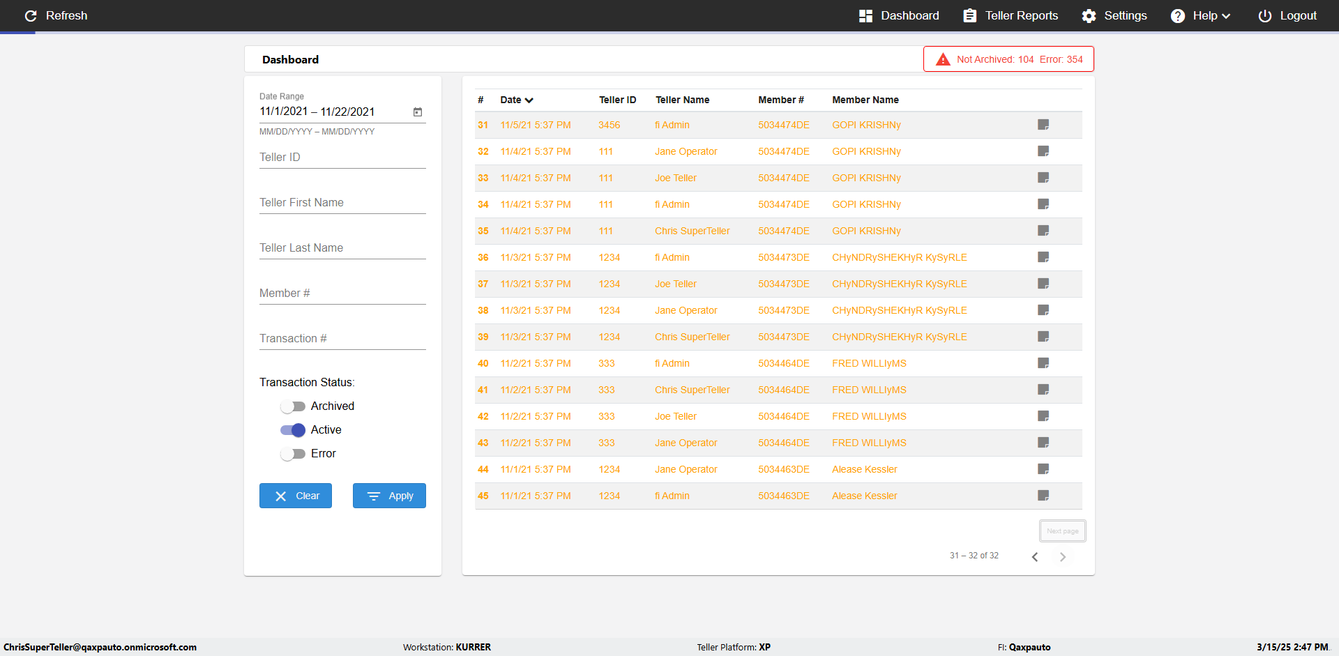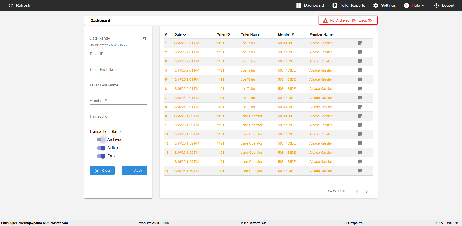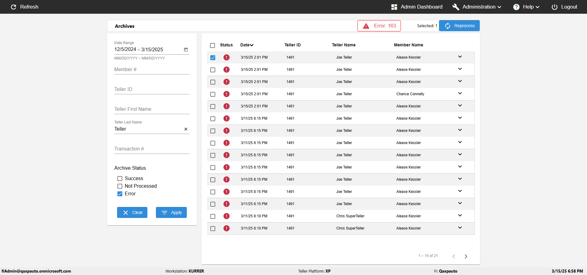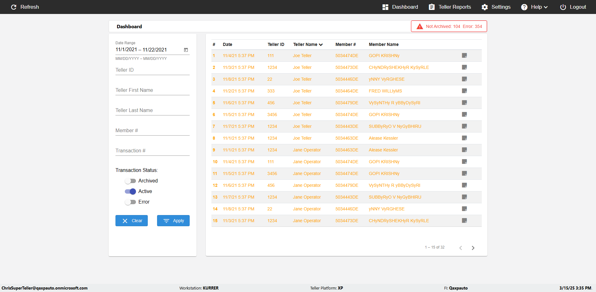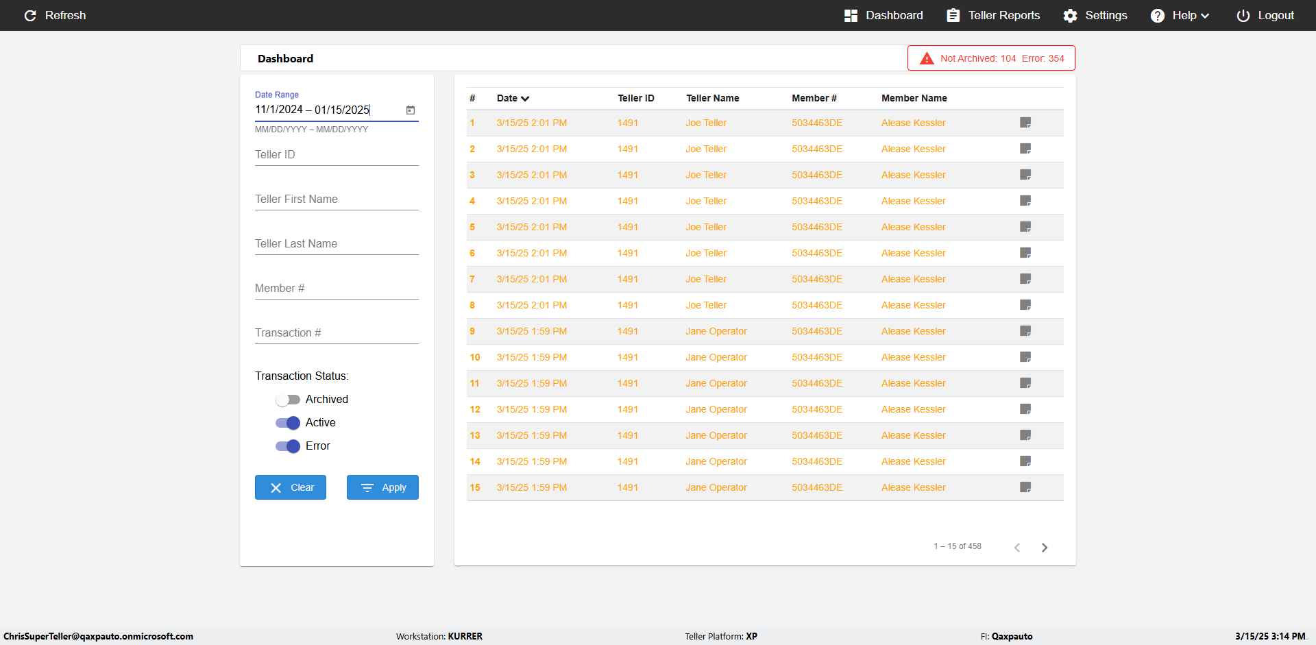 | {UserPwd=iMM2022!, Description=verify Error Messages in Report Page for Teller ID, Teller ID=%&^heg, errorMessage=Special characters not allowed., Teller Email=, View=, Date=, Clear=, Workstation=, errorint=1, TestID=verifyErrorMessagesInReports, Transaction=, Header=, Username=ChrisSuperTeller@Qaxpauto.onmicrosoft.com, Export=, Member #=, Search Text=, Level=} |