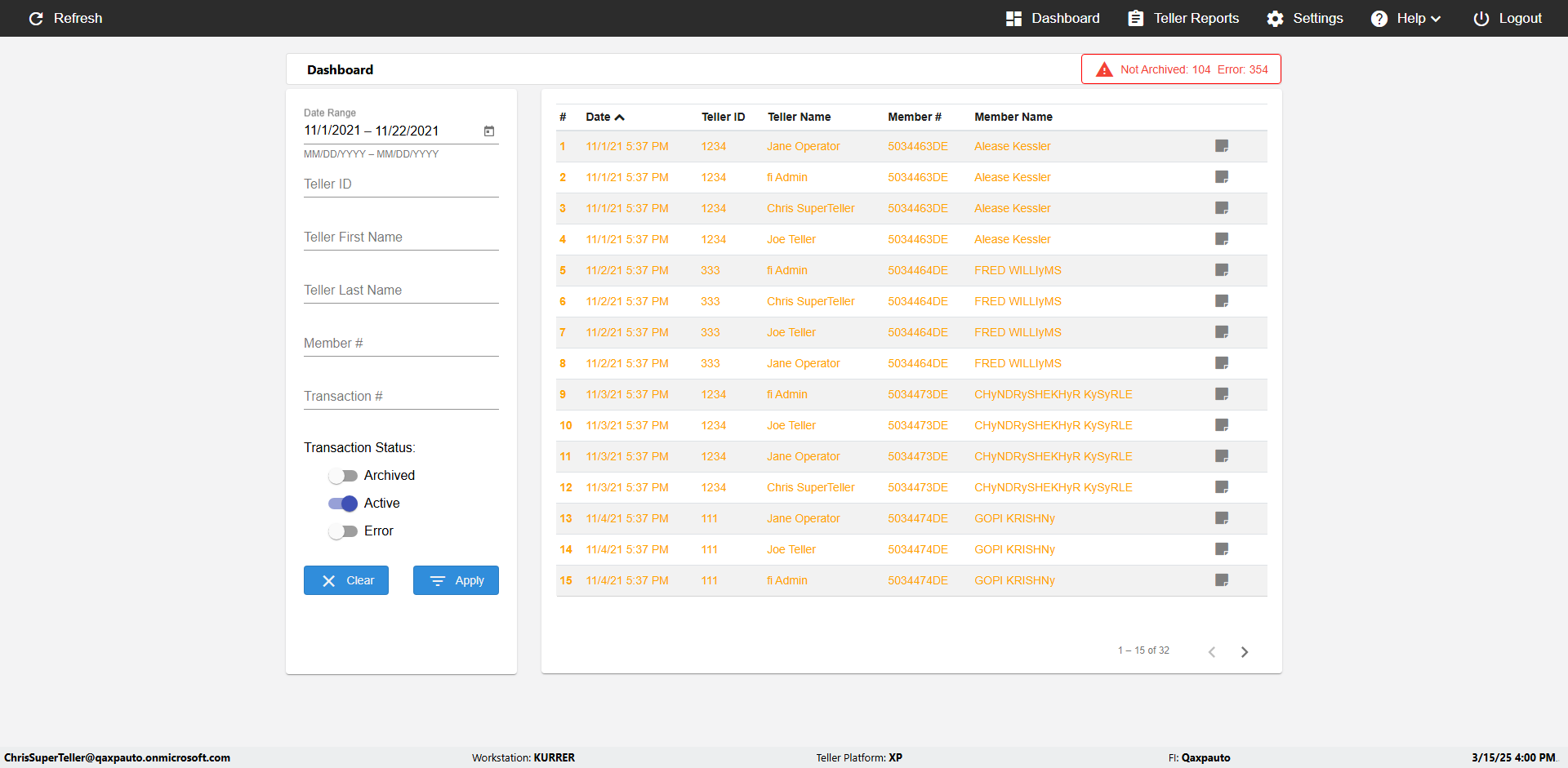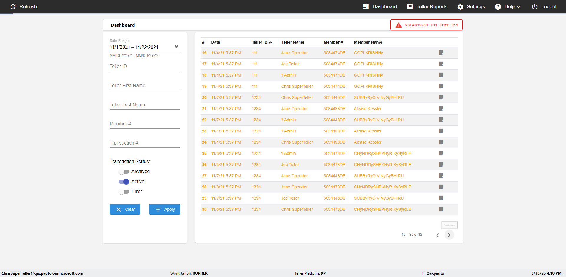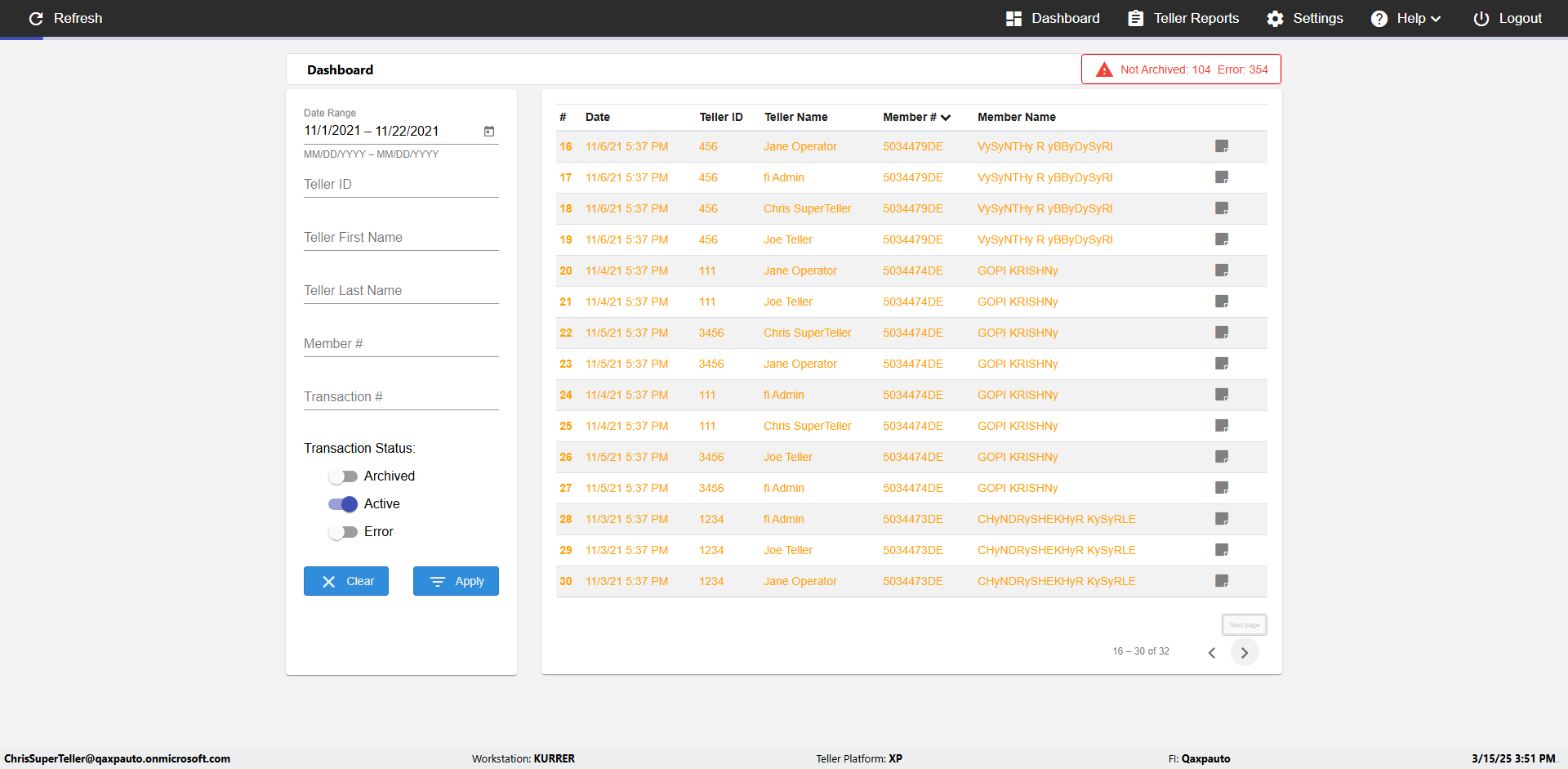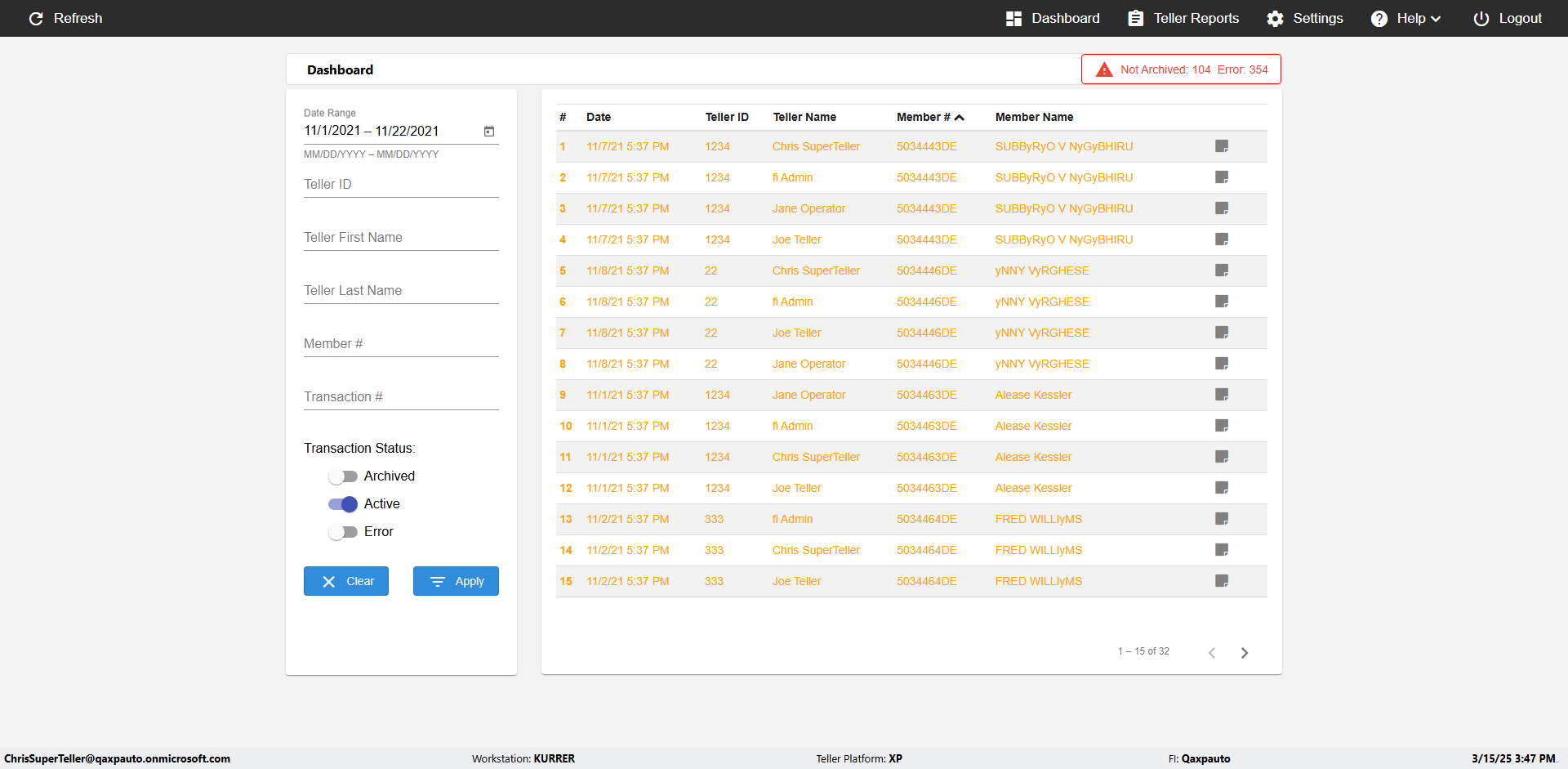 | {UserPwd=iMM2022!, Description=verify Error Messages in Report Page for Teller ID, Teller ID=%&^heg, errorMessage=Special characters not allowed., Teller Email=, View=, Date=, Clear=, Workstation=, errorint=1, TestID=verifyErrorMessagesInReports, Transaction=, Header=, Username=ChrisSuperTeller@Qaxpauto.onmicrosoft.com, Export=, Member #=, Search Text=, Level=} |