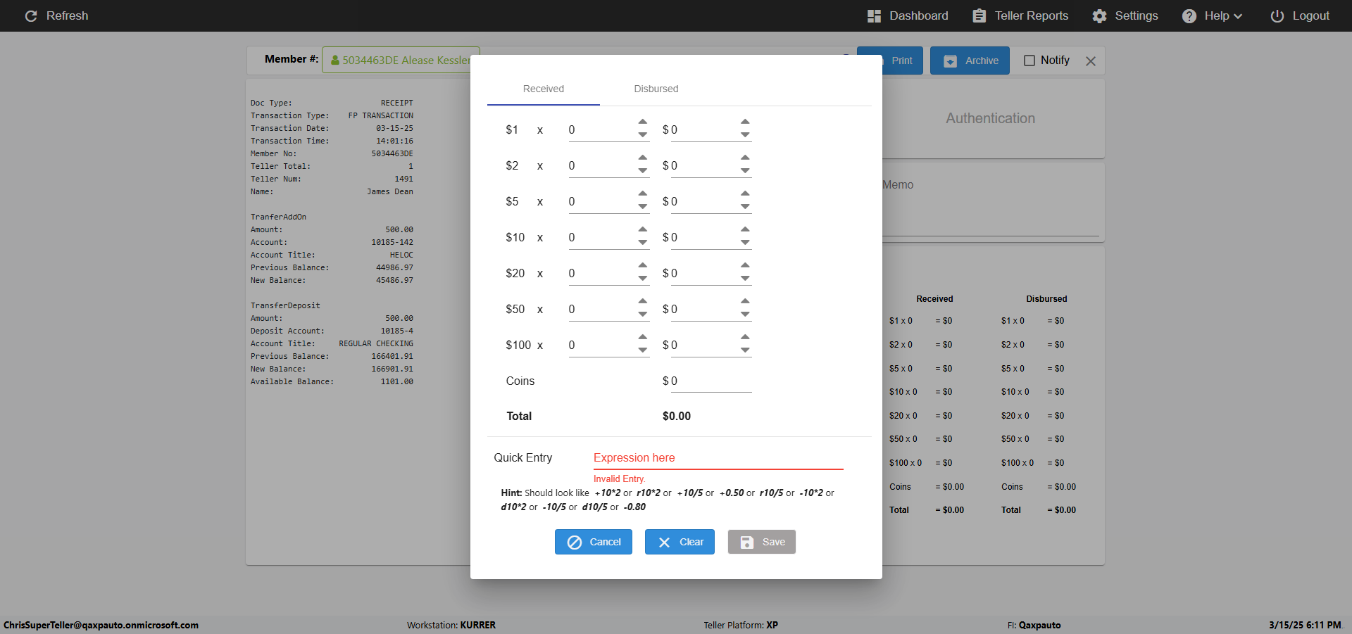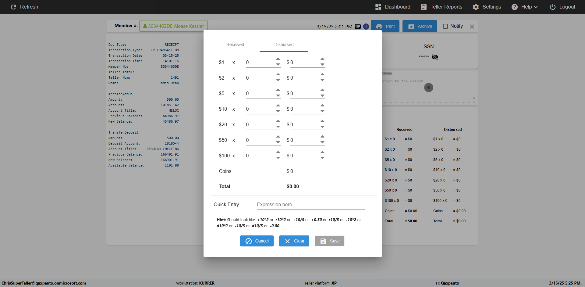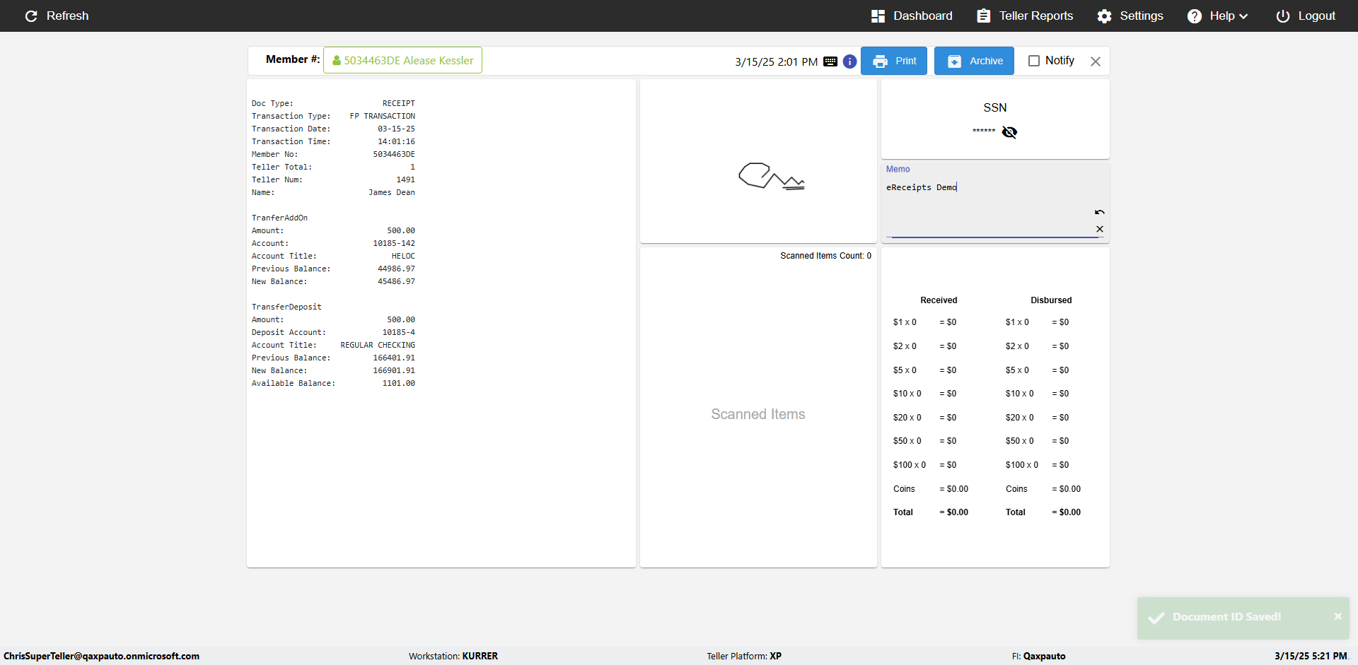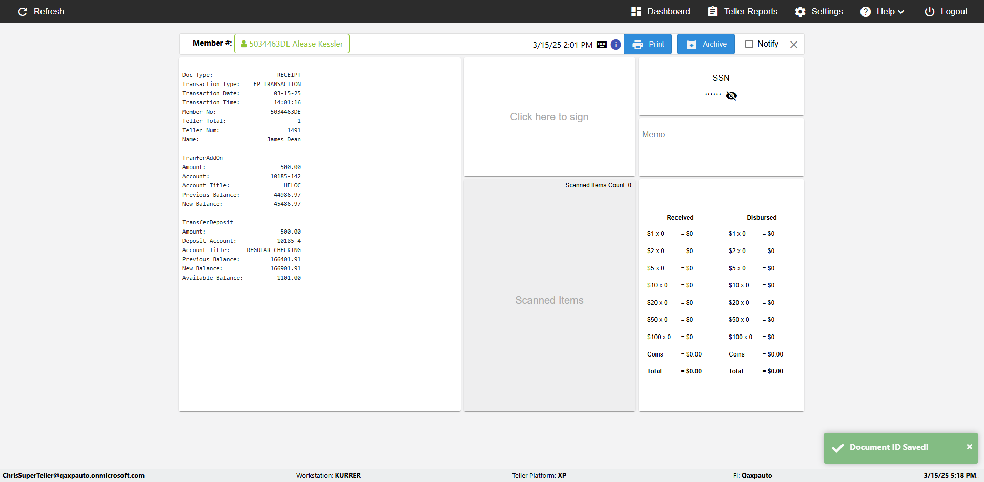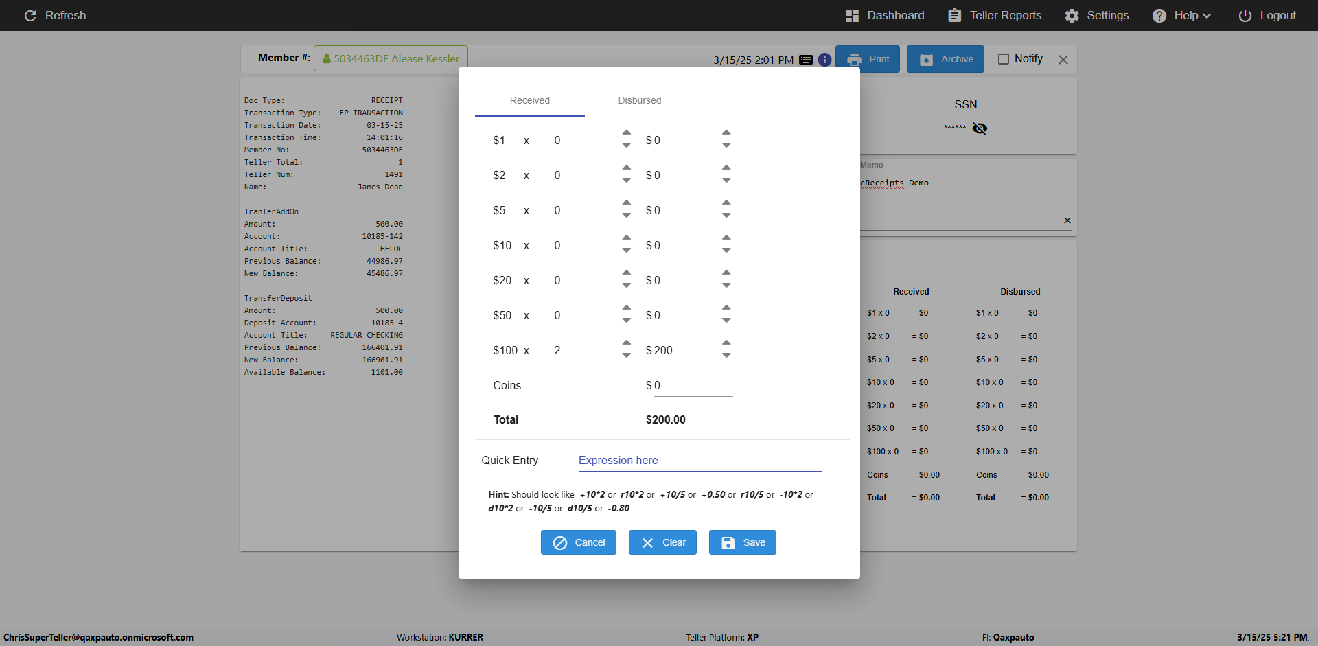 | {Toggel=, Archived Transactions=yes, Description=verify End TO End Test OF Normal Teller In Ereceipt Page, Email=FALSE, Archive=TRUE, Document Type=SSN, Notify=TRUE, SignatureTab=Touch,, DisbursedExpression=|-10*5, Operation=, Teller LastName=, Disbursed cash=1-1|2-2|5-2|10-1|20-2|50-1|100-1|Coins-3, errorint=, TestID=verifyEndTOEndTestOFNormalTellerInEreceipt, Print=FALSE, DisbursedExpressionValue=FALSE, Phone=(555) 021-3315, ReceivedCashValue=FALSE, Member=, UserPwd=iMM2022!, Transtatus=Archived-false;Active-true;Error-false, Docment ID=216554, Teller=, Teller FirstName=, errorMessage=, ReceivedExpressionValue=TRUE, Date=, Platfrom=, Received cash=1-1|2-2|5-2|10-1|20-2|50-1|100-1|Coins-3, Transaction=, Header=, Expression=, Username=ChrisSuperTeller@Qaxpauto.onmicrosoft.com, DisbursedCashValue=TRUE, FullName=, ReceivedExpression=|+100*2, SMS=FALSE, Memo=eReceipts Demo} |
