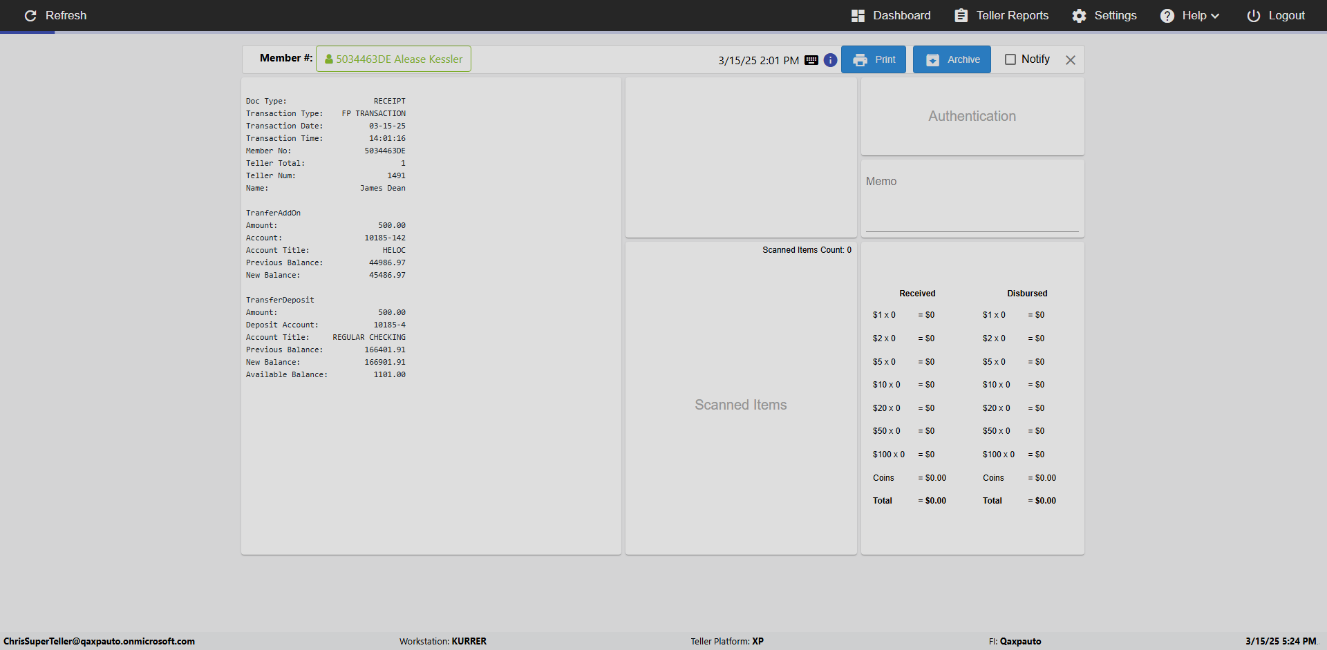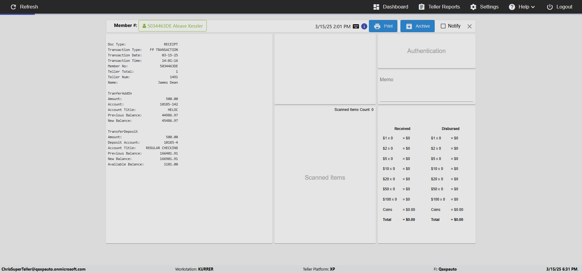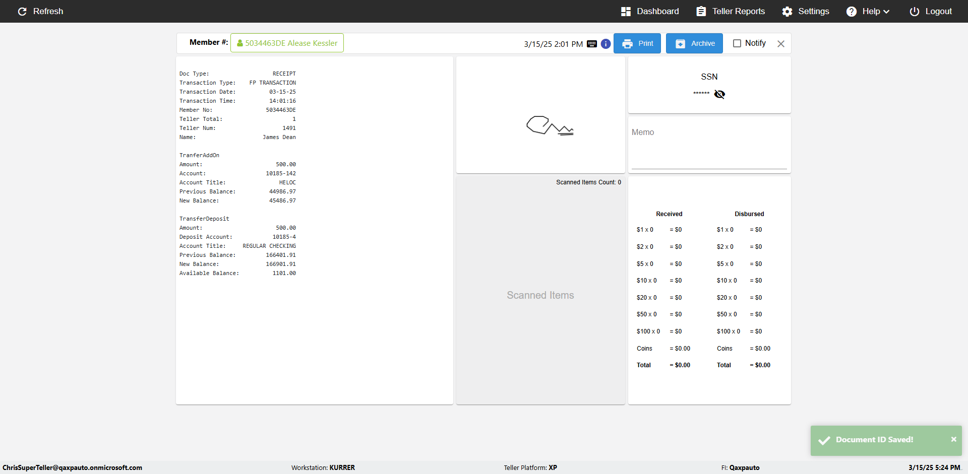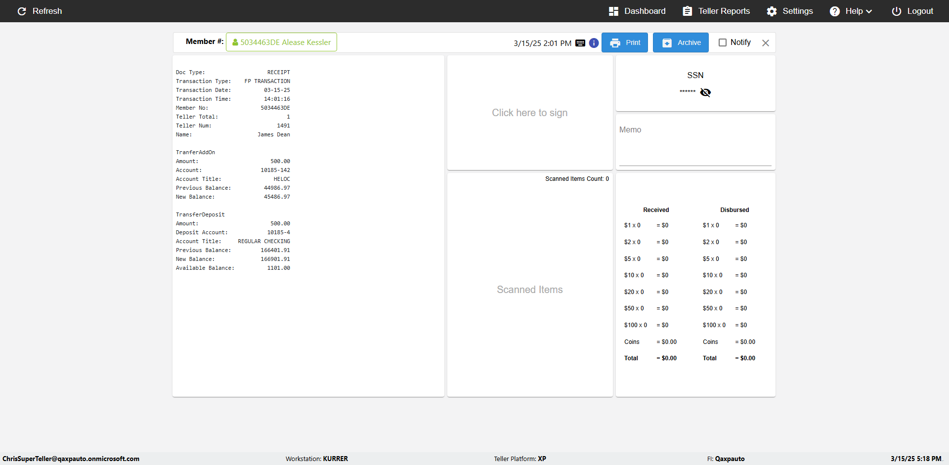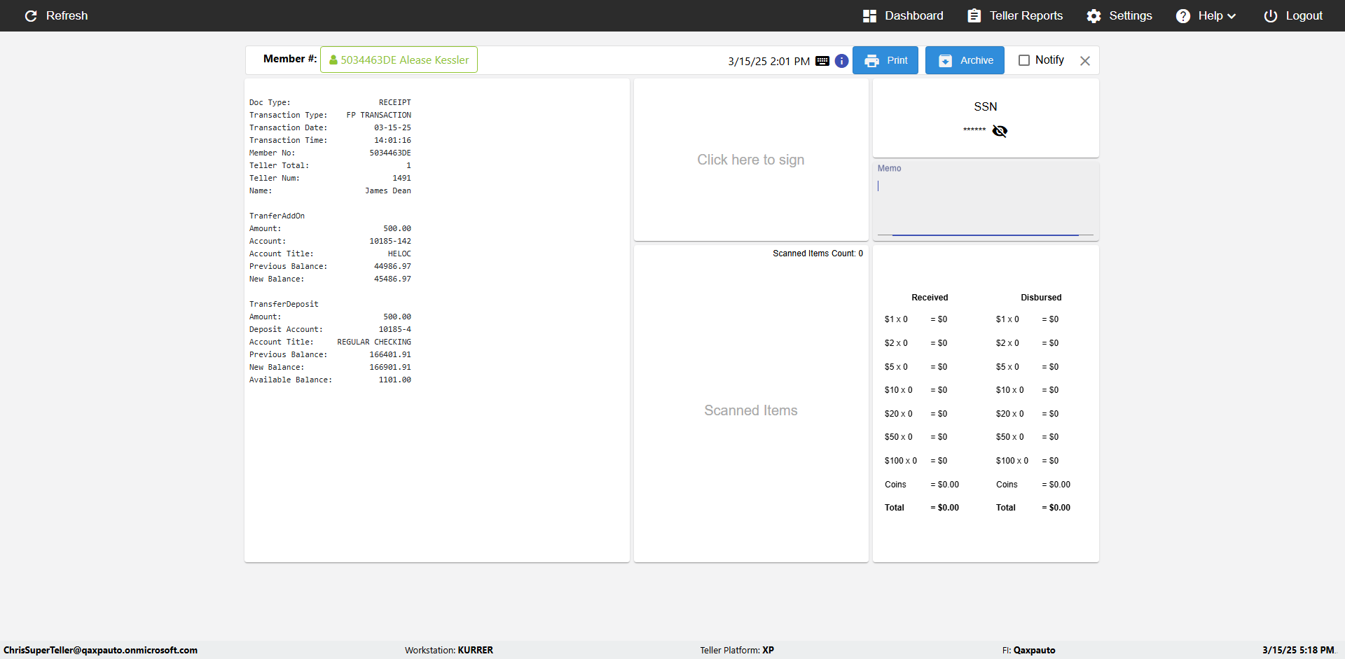 | {Toggel=, Archived Transactions=yes, Description=verify End TO End Test OF Normal Teller In Ereceipt Page, Email=FALSE, Archive=TRUE, Document Type=SSN, Notify=TRUE, SignatureTab=Touch,, DisbursedExpression=|-10*5, Operation=, Teller LastName=, Disbursed cash=1-1|2-2|5-2|10-1|20-2|50-1|100-1|Coins-3, errorint=, TestID=verifyEndTOEndTestOFNormalTellerInEreceipt, Print=FALSE, DisbursedExpressionValue=FALSE, Phone=(555) 021-3315, ReceivedCashValue=FALSE, Member=, UserPwd=iMM2022!, Transtatus=Archived-false;Active-true;Error-false, Docment ID=216554, Teller=, Teller FirstName=, errorMessage=, ReceivedExpressionValue=TRUE, Date=, Platfrom=, Received cash=1-1|2-2|5-2|10-1|20-2|50-1|100-1|Coins-3, Transaction=, Header=, Expression=, Username=ChrisSuperTeller@Qaxpauto.onmicrosoft.com, DisbursedCashValue=TRUE, FullName=, ReceivedExpression=|+100*2, SMS=FALSE, Memo=eReceipts Demo} |
