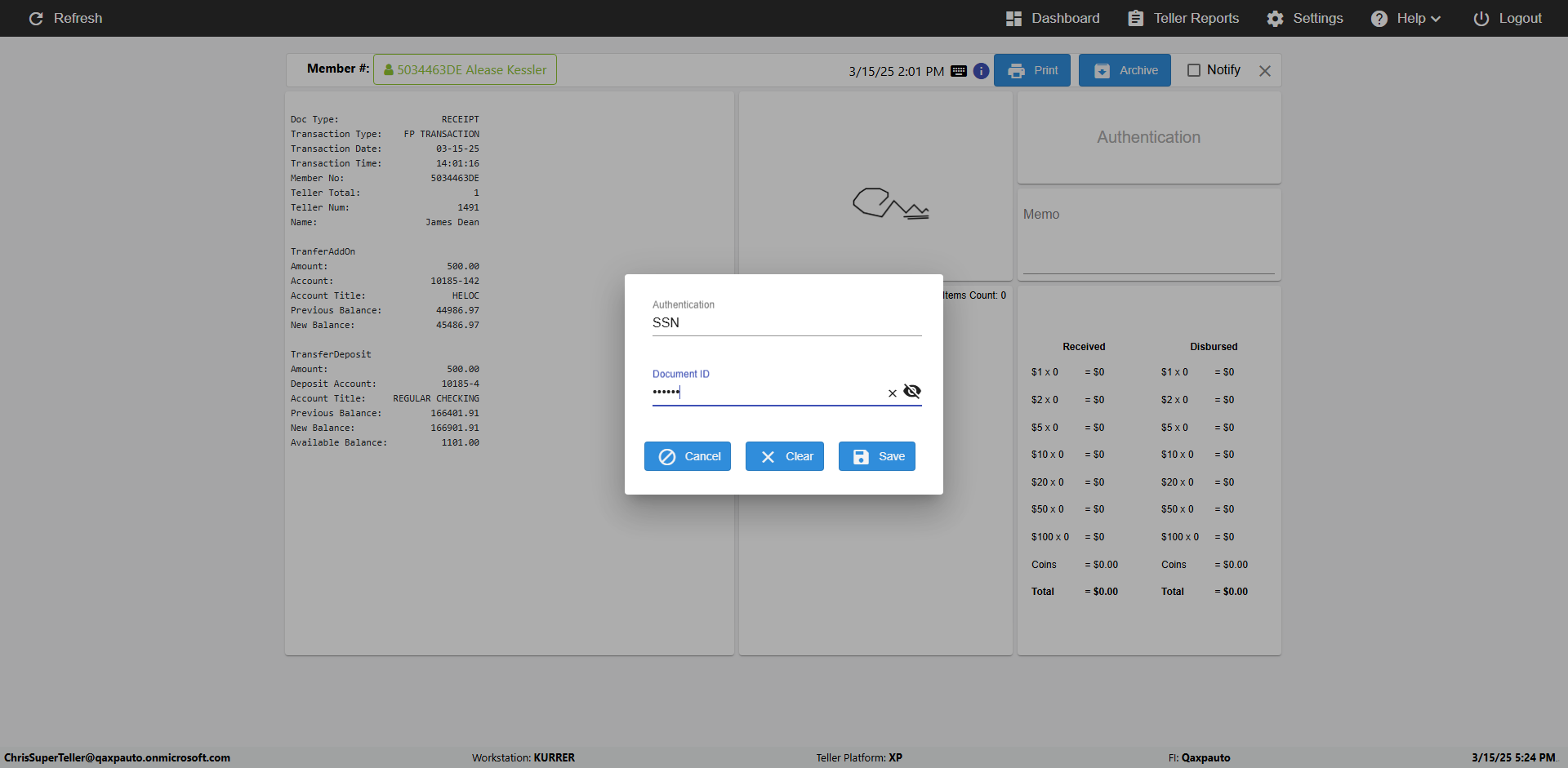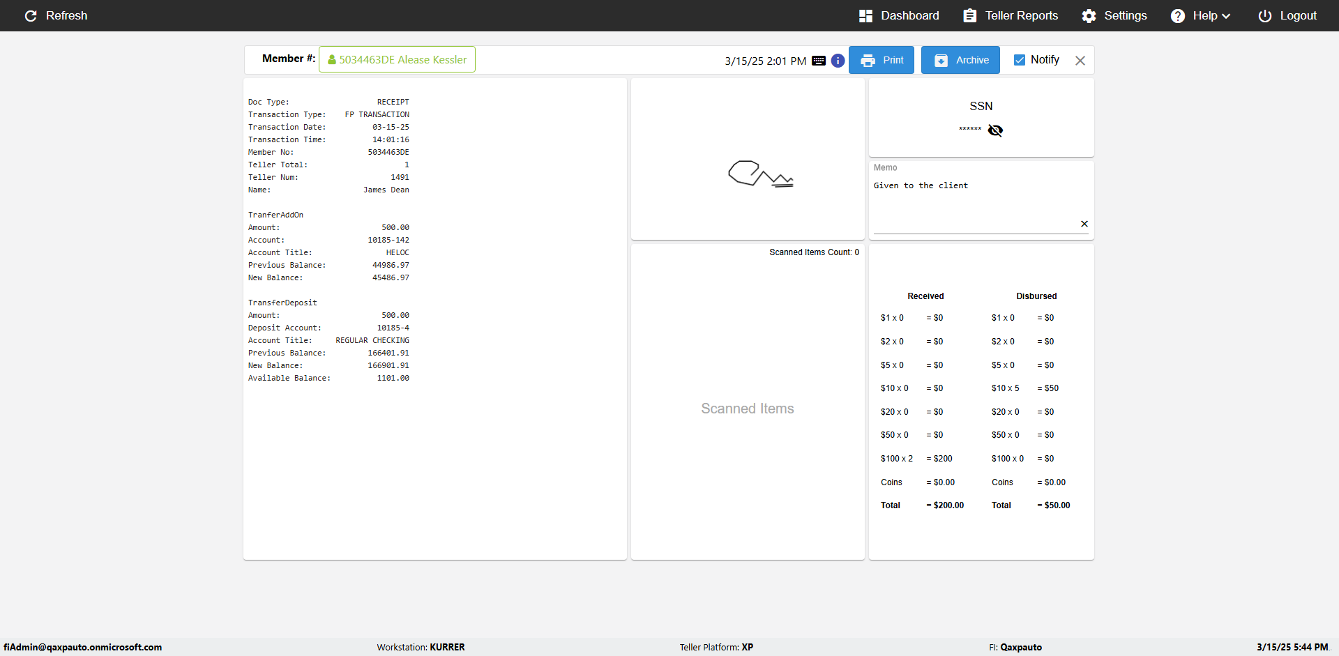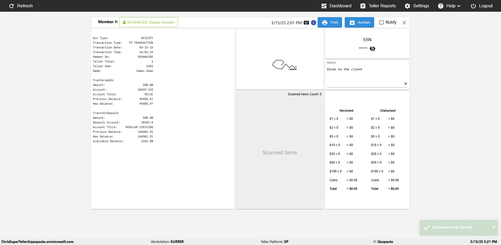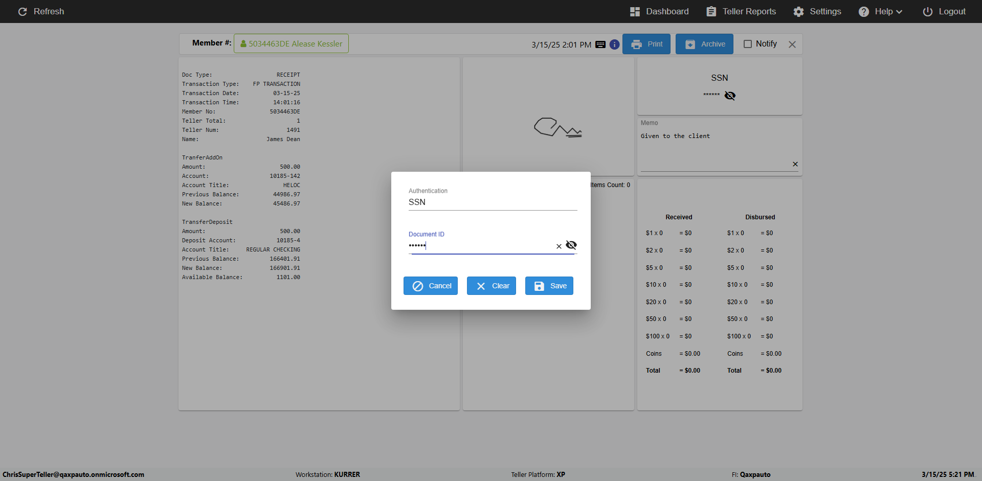 | {Toggel=, Archived Transactions=no, Description=, Email=, Archive=, Document Type=SSN, Notify=, SignatureTab=, DisbursedExpression=, Operation=, Teller LastName=, Disbursed cash=, errorint=, TestID=verifyAuthenticationMemoAndScannedItemscardInReceiptPage, Print=, DisbursedExpressionValue=, Phone=, ReceivedCashValue=, Member=, UserPwd=iMM2022!, Transtatus=Archived-false;Active-true;Error-false, Docment ID=216554, Teller=, Teller FirstName=, errorMessage=, ReceivedExpressionValue=, Date=, Platfrom=, Received cash=, Transaction=, Header=, Expression=, Username=ChrisSuperTeller@Qaxpauto.onmicrosoft.com, DisbursedCashValue=, FullName=, ReceivedExpression=, SMS=, Memo=Given to the client} |