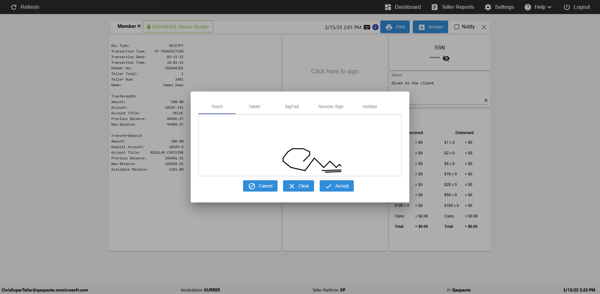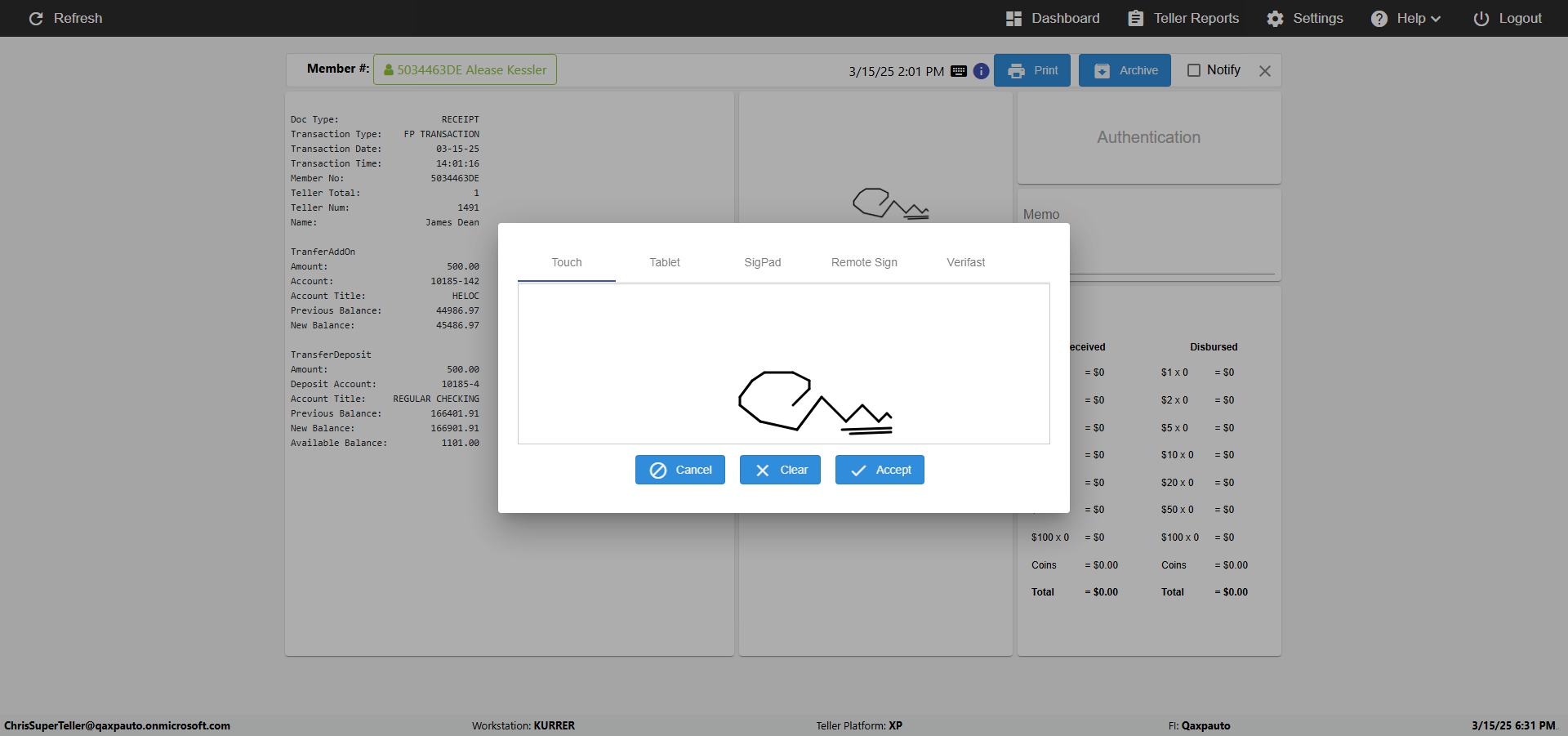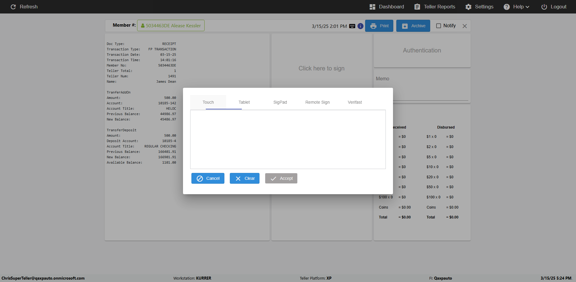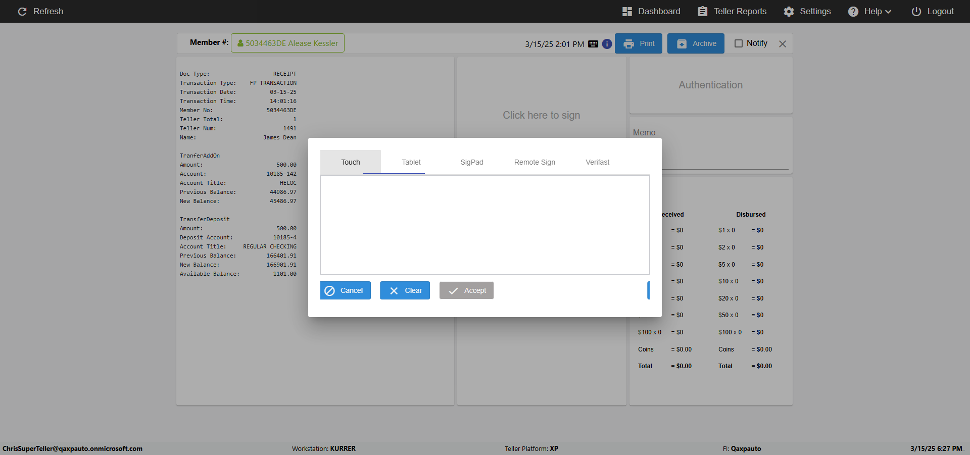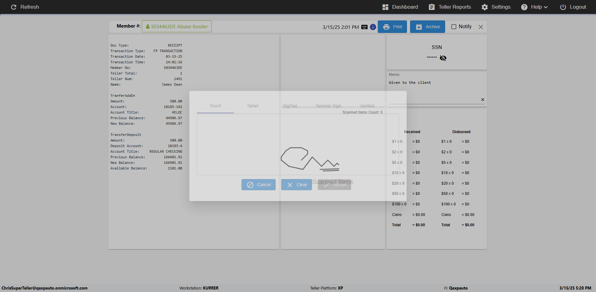 | {Toggel=, Archived Transactions=no, Description=verify touch signature in Receipt Page, Email=FALSE, Archive=FALSE, Document Type=, Notify=TRUE, SignatureTab=Touch,, DisbursedExpression=|-10*5, Operation=, Teller LastName=, Disbursed cash=, errorint=, TestID=verifyTouchSignatureEreceipt, Print=FALSE, DisbursedExpressionValue=TRUE, Phone=, ReceivedCashValue=FALSE, Member=, UserPwd=iMM2022!, Transtatus=Archived-false;Active-true;Error-false, Docment ID=, Teller=, Teller FirstName=Joe, errorMessage=, ReceivedExpressionValue=TRUE, Date=, Platfrom=, Received cash=, Transaction=, Header=, Expression=, Username=ChrisSuperTeller@Qaxpauto.onmicrosoft.com, DisbursedCashValue=FALSE, FullName=, ReceivedExpression=|+100*2, SMS=FALSE, Memo=} |