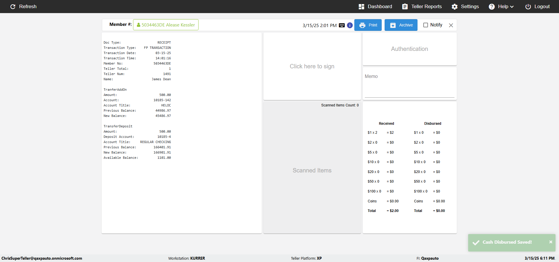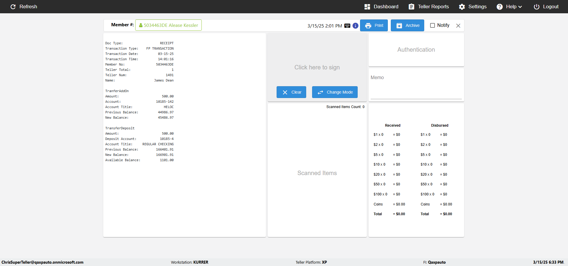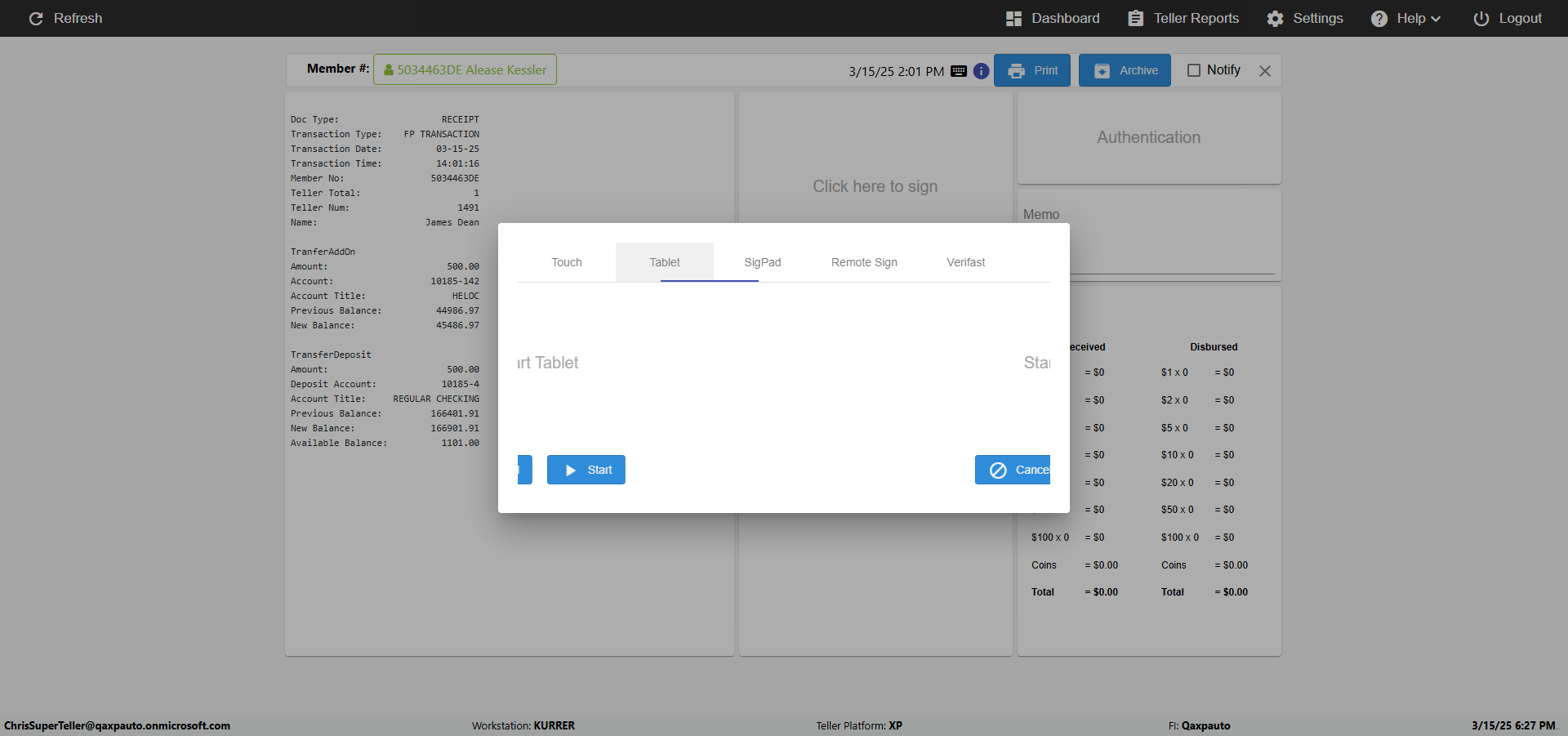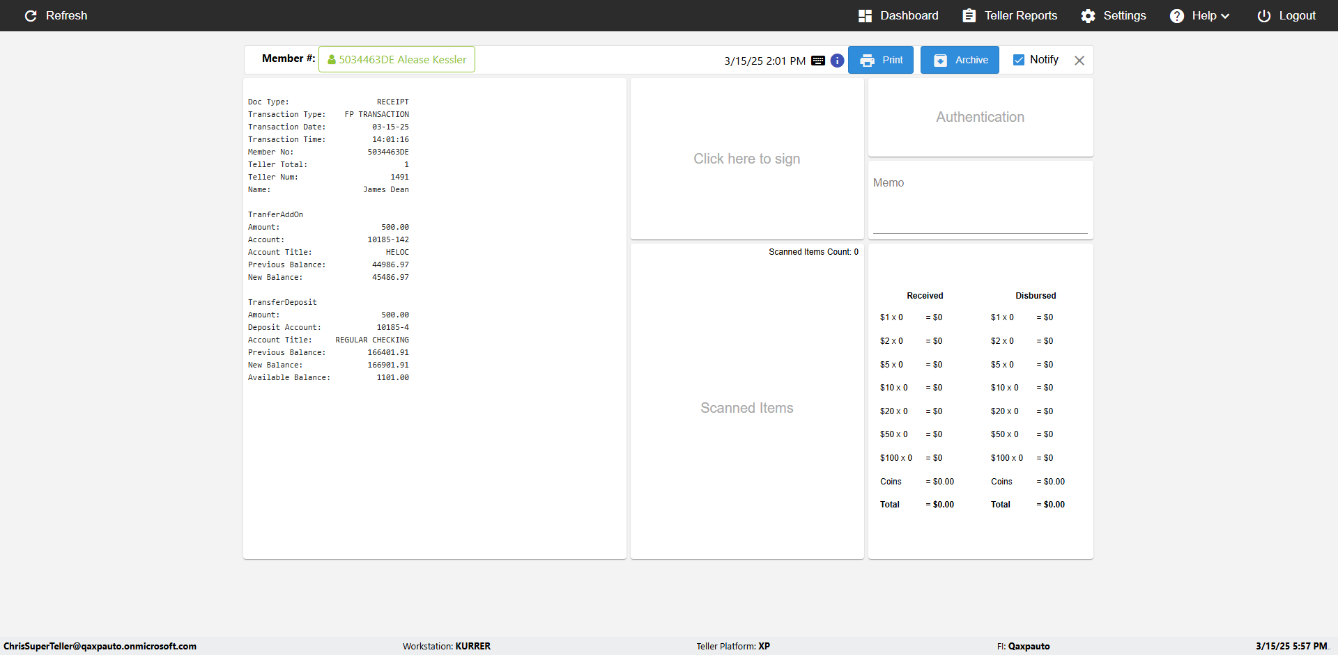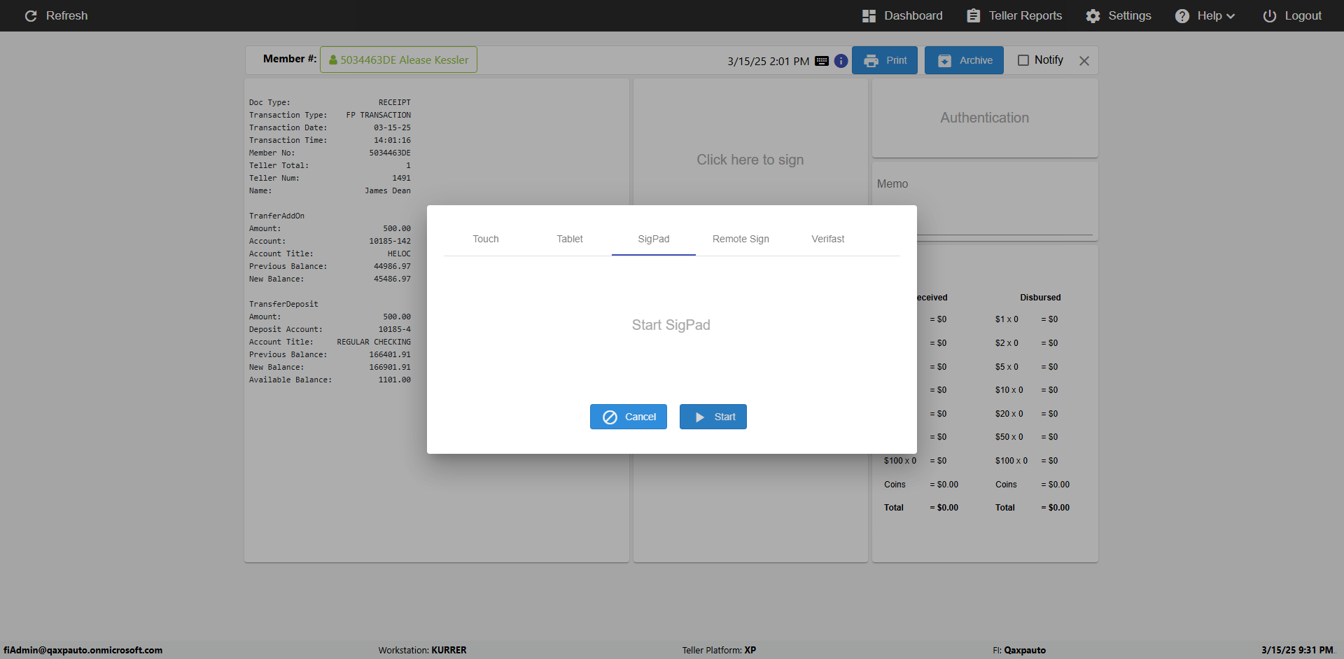 | {Toggel=, Archived Transactions=no, Description=verify touch signature in Receipt Page, Email=FALSE, Archive=FALSE, Document Type=, Notify=TRUE, SignatureTab=Touch,, DisbursedExpression=|-10*5, Operation=, Teller LastName=, Disbursed cash=, errorint=, TestID=verifyTouchSignatureEreceipt, Print=FALSE, DisbursedExpressionValue=TRUE, Phone=, ReceivedCashValue=FALSE, Member=, UserPwd=iMM2022!, Transtatus=Archived-false;Active-true;Error-false, Docment ID=, Teller=, Teller FirstName=Joe, errorMessage=, ReceivedExpressionValue=TRUE, Date=, Platfrom=, Received cash=, Transaction=, Header=, Expression=, Username=ChrisSuperTeller@Qaxpauto.onmicrosoft.com, DisbursedCashValue=FALSE, FullName=, ReceivedExpression=|+100*2, SMS=FALSE, Memo=} |