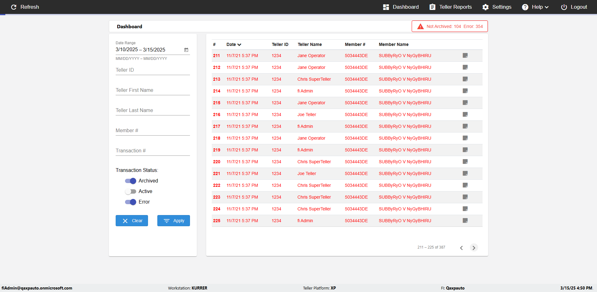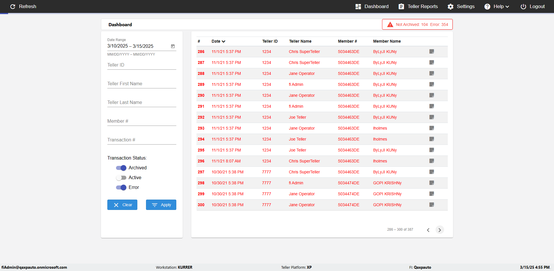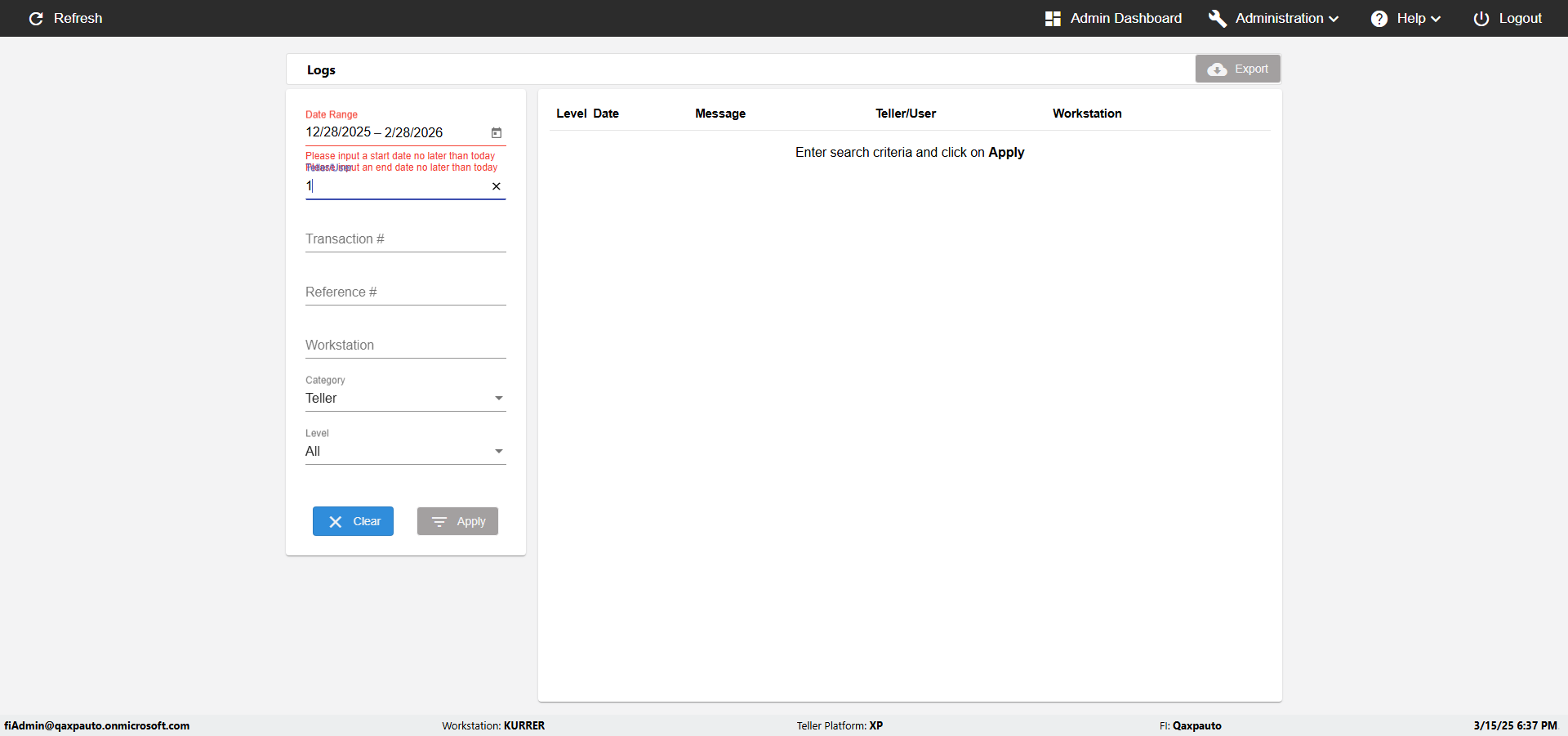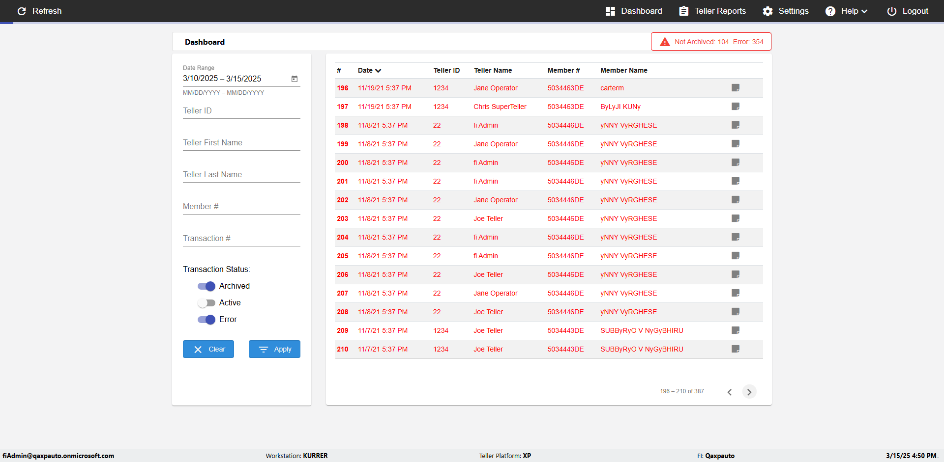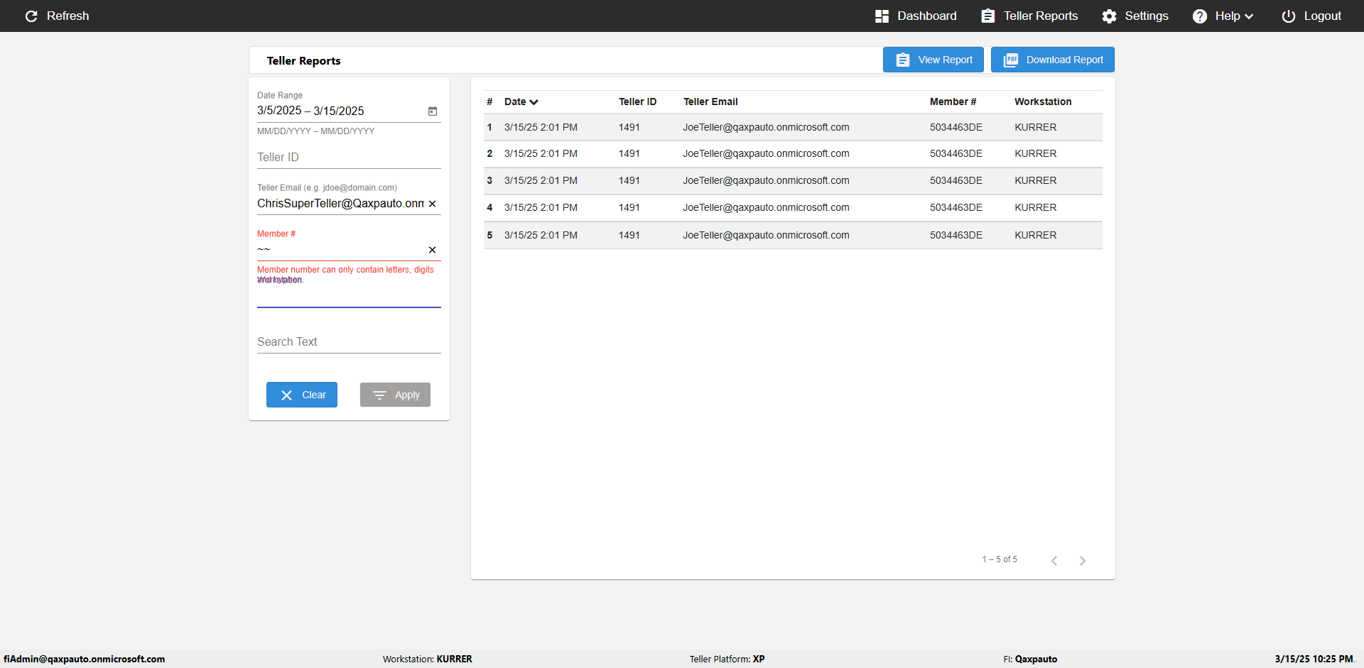 | {UserPwd=iMM2022!, Description=verify Error Messages in Report Page for Date, Teller ID=, errorMessage=Date cannot exceed 7 days after today.;Date cannot exceed 7 days after today., Teller Email=, View=, Date=12/28/2025 - 2/28/2026, Clear=, Workstation=, errorint=2, TestID=verifyErrorMessagesInReports, Transaction=, Header=, Username=ChrisSuperTeller@Qaxpauto.onmicrosoft.com, Export=, Member #=, Search Text=, Level=} |