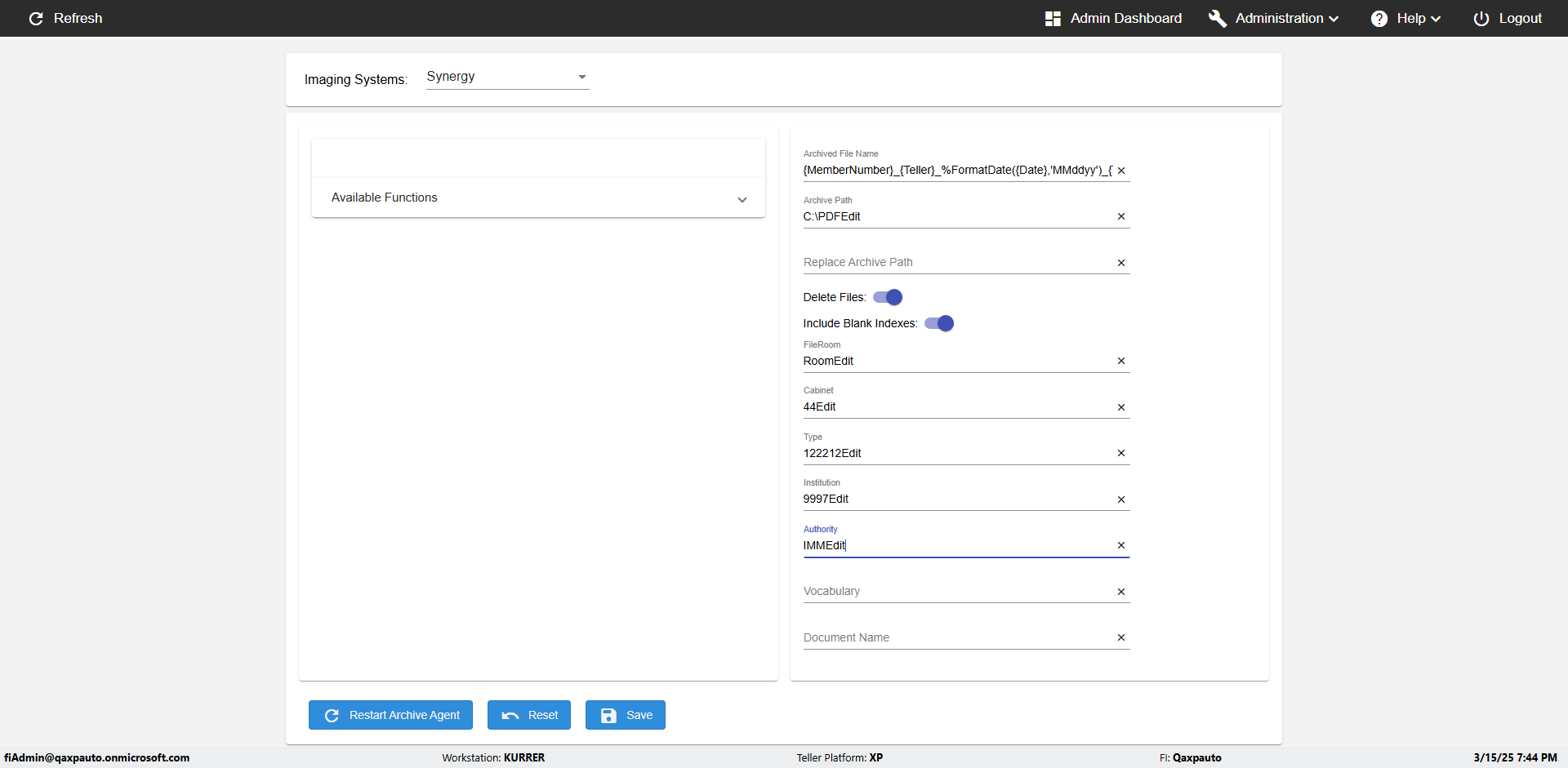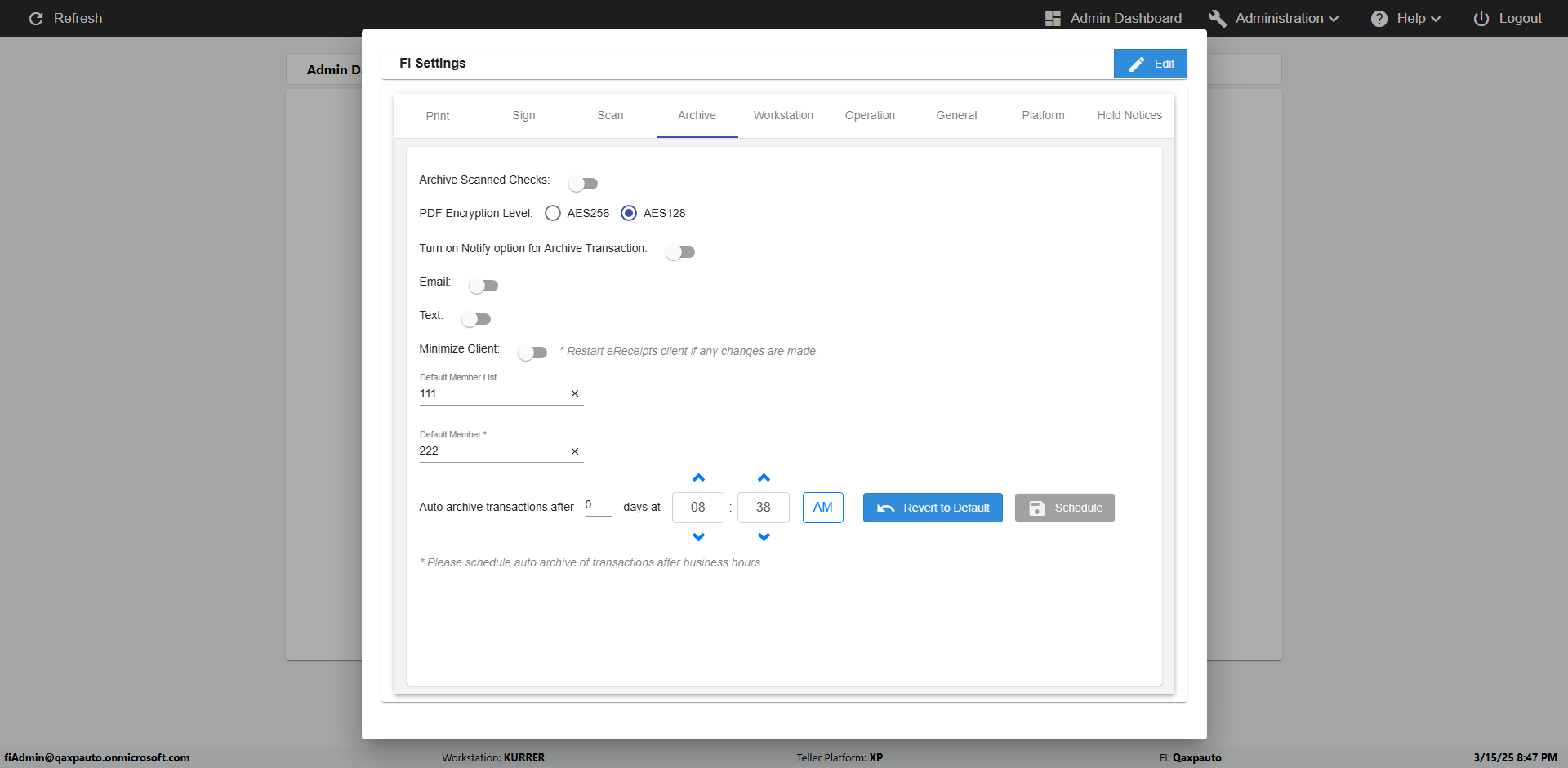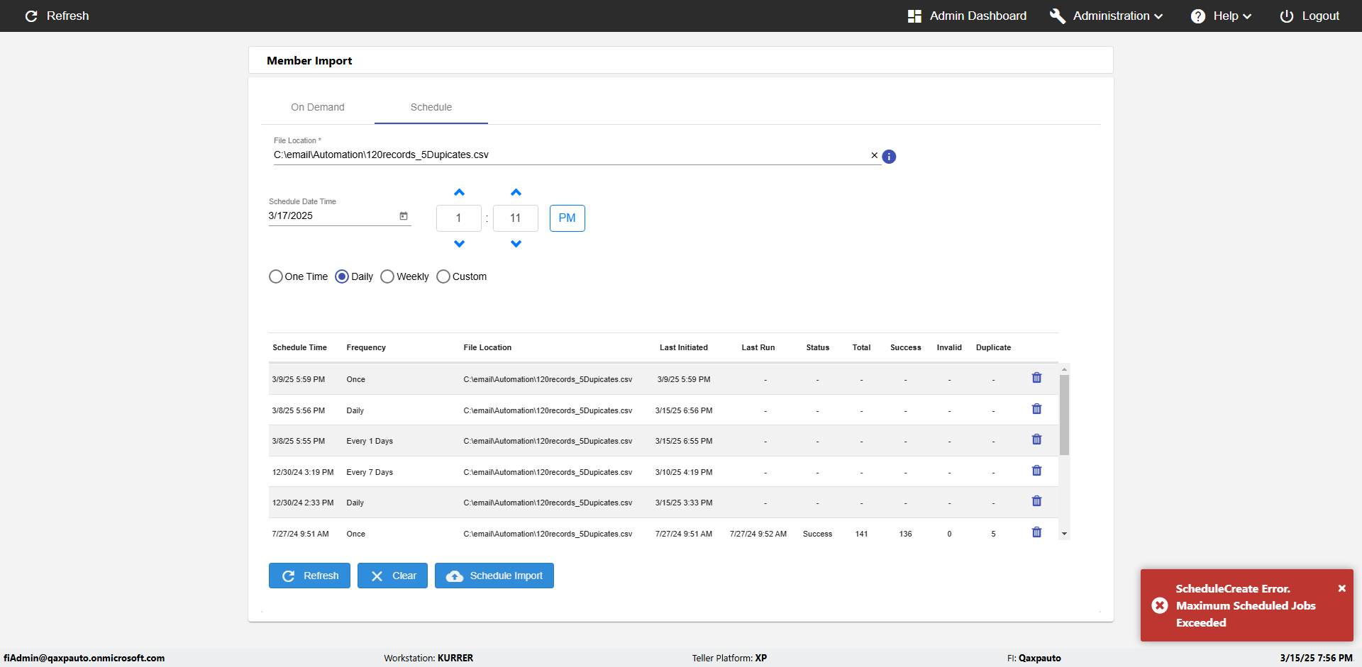 | {Archived Transactions=, Archive=, print signatur=, Name=, MultipleWorkstation=, WorkstationDeleteOption=, BranchName=, Agent=, UserPwd=iMM2022!, BranchDeleteOption=, Receipt=, Role=, Brand=, Print signature line=, TimeZone=, Header=, MappedOption=, Scan=, PortNumber=, FromWks=, FromBranch=, Description=verify the Member import Schedule PAge Defaults, weeks=, Operation=, Clear=, TestID=verifyMemberImportSchedulePageDefaults_ER2257, Phone=, WorkstationName=, ToBranch=, ToWks=, Subscription Names=, FilePath=src/main/resources/testdata/data/DashBoard.csv, Transtatus=Archived-false;Active-true;Error-false, Report=, Index_Field_Name=, Agents=, Text=, Hold Notice=, Suppress=, SchedualType=Daily,, Date=, Platfrom=, GroupId=, print Disburstments=, SMTP=, Imaging System=, MultipleBranches=, Username=fiAdmin@Qaxpauto.onmicrosoft.com, Sign=} |
