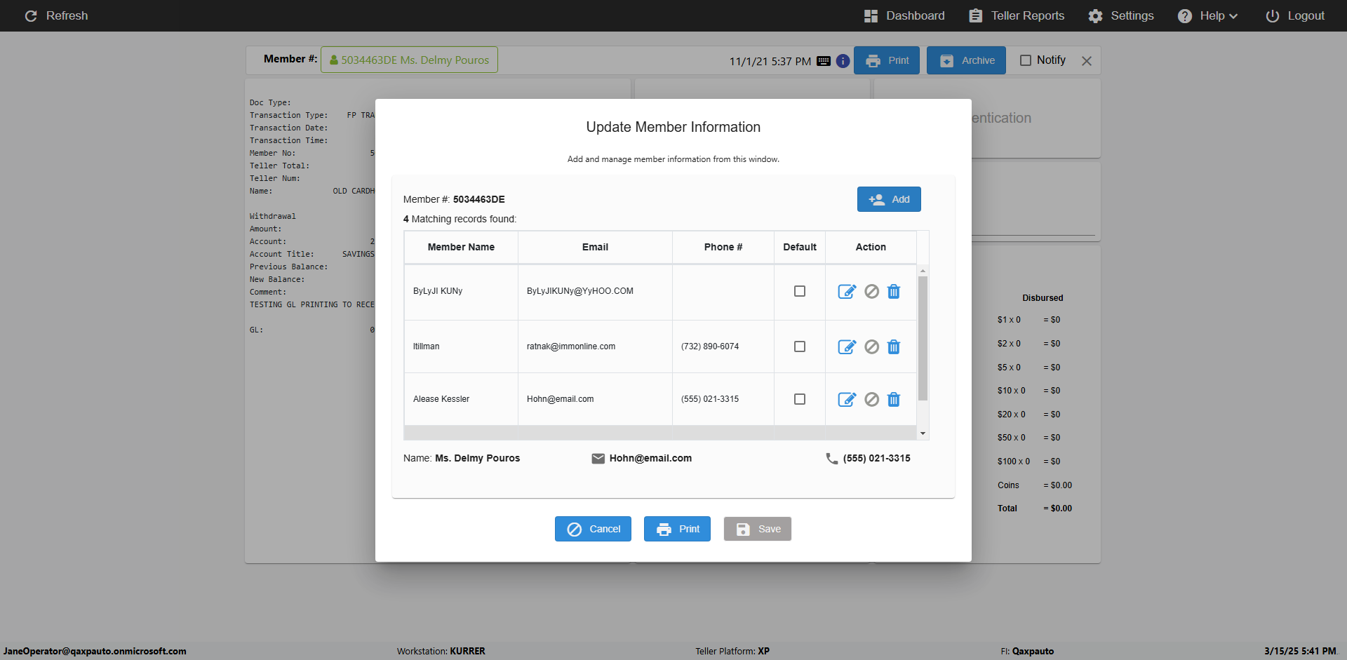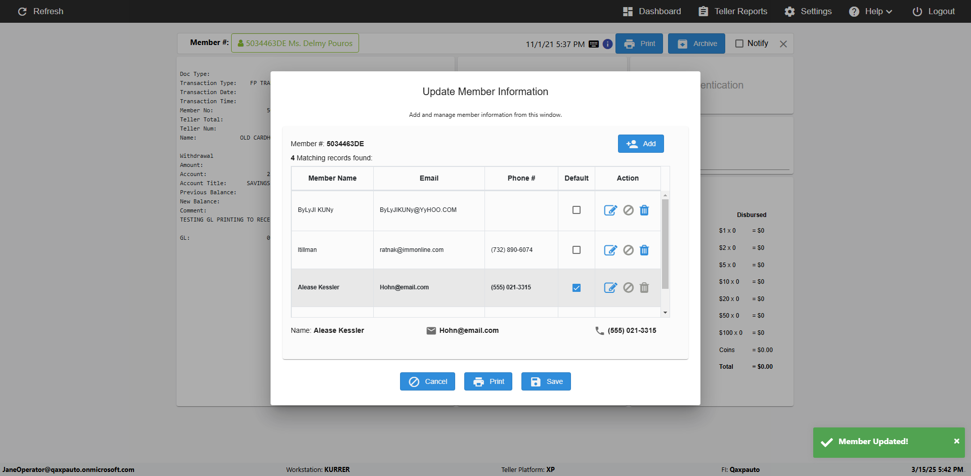 | {Toggel=TRUE, Archived Transactions=no, Description=verify MemberID And Archive Information Update (duplicate), Email=Hohn@email.com, Archive=, Document Type=, Notify=, SignatureTab=, DisbursedExpression=, Operation=, Teller LastName=, Disbursed cash=, errorint=, TestID=verifyMemberAddUpdateContactInfo, Print=, DisbursedExpressionValue=, Phone=(555) 021-3315, ReceivedCashValue=, Member=5034463, UserPwd=iMM2022!, Transtatus=Archived-false;Active-true;Error-false, Docment ID=, Teller=, Teller FirstName=, errorMessage=, ReceivedExpressionValue=, Date=11/01/2021 - 11/20/2021, Platfrom=, Received cash=, Transaction=, Header=, Expression=, Username=JaneOperator@Qaxpauto.onmicrosoft.com, DisbursedCashValue=, FullName=John, ReceivedExpression=, SMS=, Memo=} |