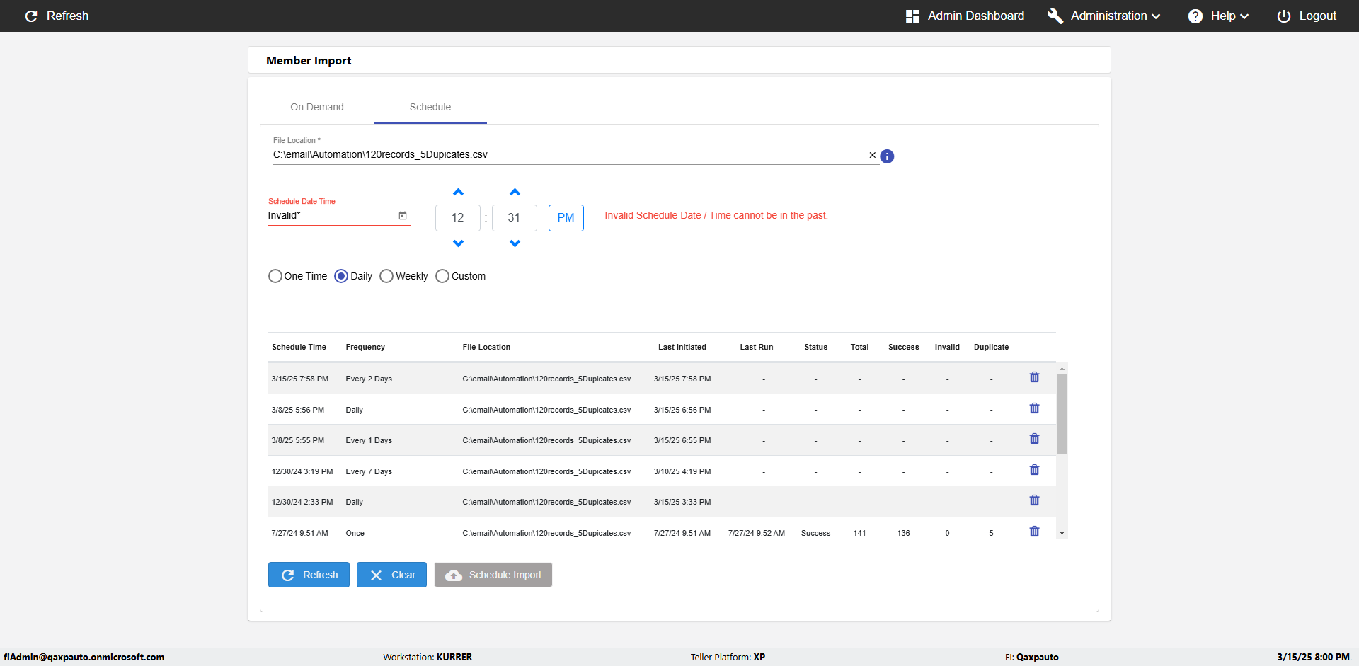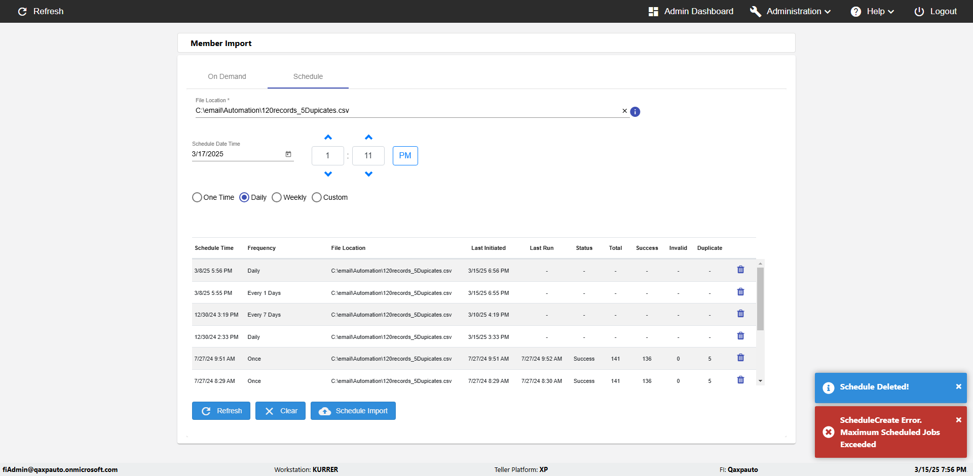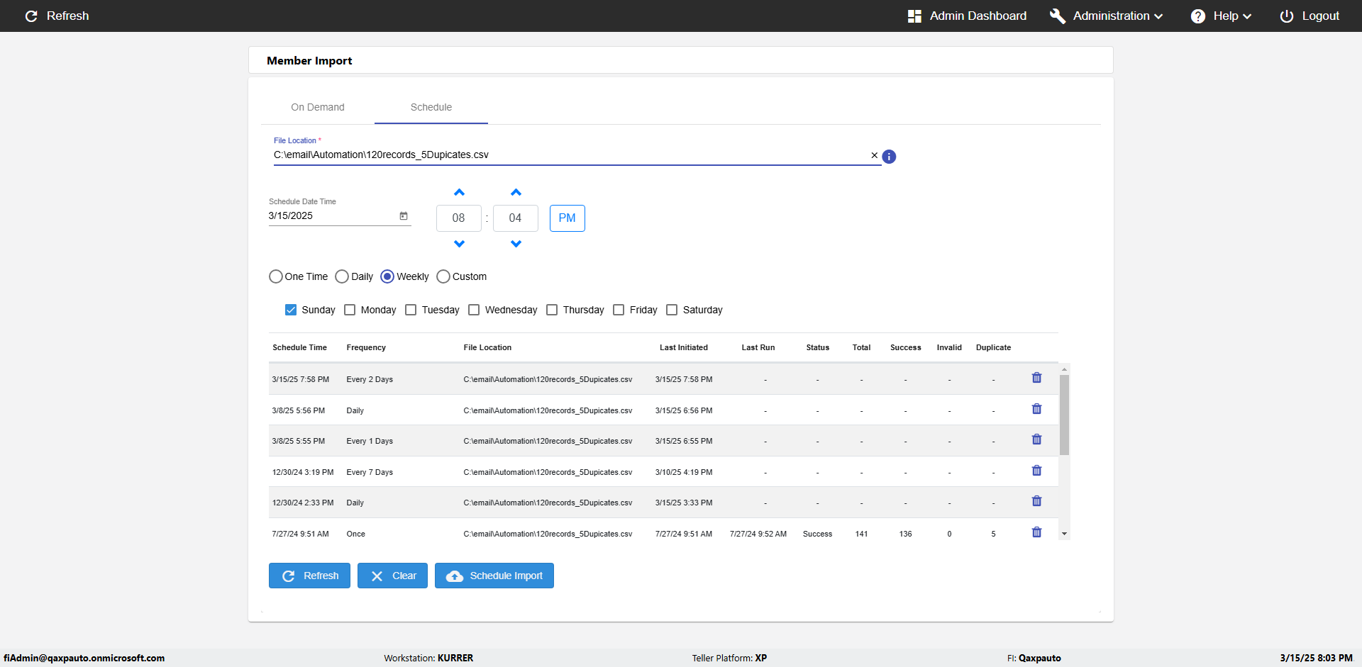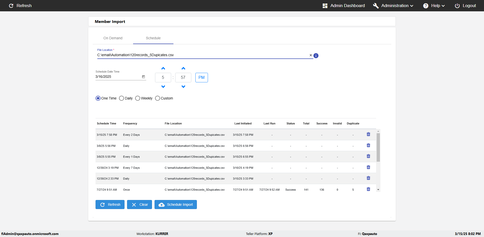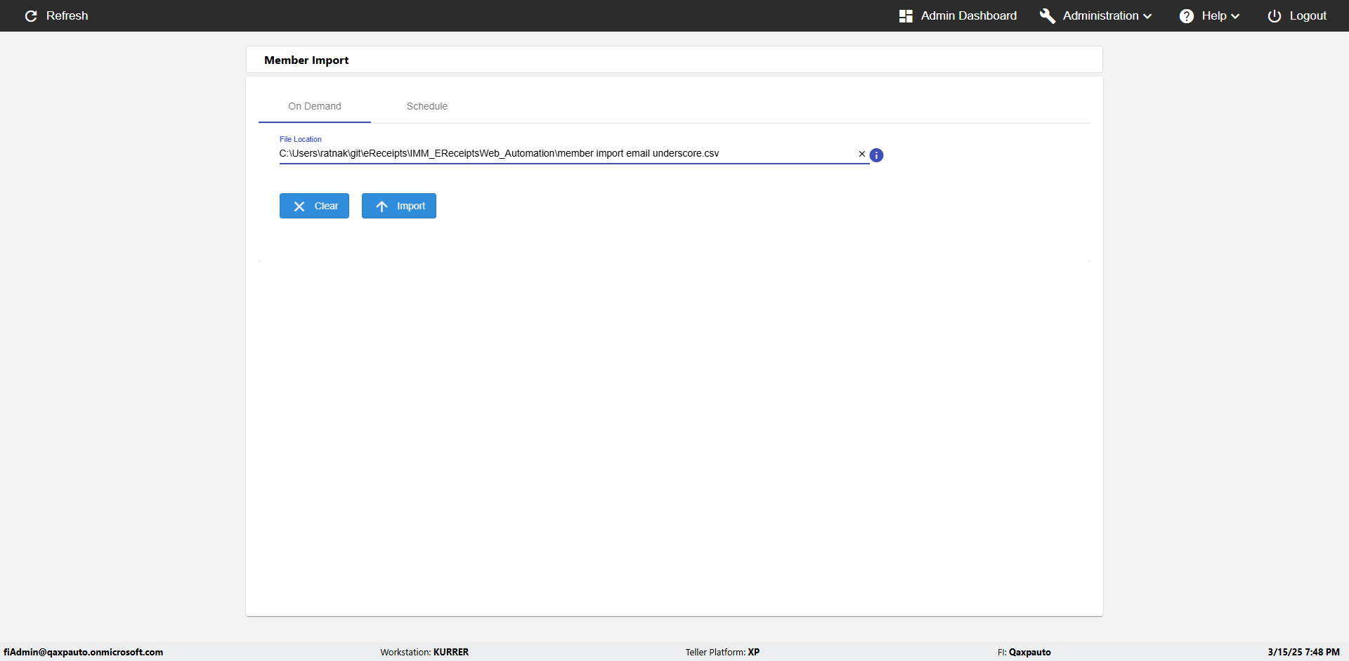 | {Archived Transactions=, Archive=, print signatur=, Name=, MultipleWorkstation=, WorkstationDeleteOption=, BranchName=, Agent=, UserPwd=iMM2022!, BranchDeleteOption=, Receipt=, Role=, Brand=, Print signature line=, TimeZone=, Header=, MappedOption=, Scan=, PortNumber=, FromWks=, FromBranch=, Description=verify Member Import 'Schedule' Page, weeks=, Operation=, Clear=, TestID=verifyMemberImportSchedulePage, Phone=, WorkstationName=, ToBranch=, ToWks=, Subscription Names=, FilePath=C:\email\Automation\120records_5Dupicates.csv, Transtatus=Archived-false;Active-true;Error-false, Report=, Index_Field_Name=, Agents=, Text=, Hold Notice=, Suppress=, SchedualType=Daily,, Date=, Platfrom=, GroupId=, print Disburstments=, SMTP=, Imaging System=, MultipleBranches=, Username=fiAdmin@Qaxpauto.onmicrosoft.com, Sign=} |