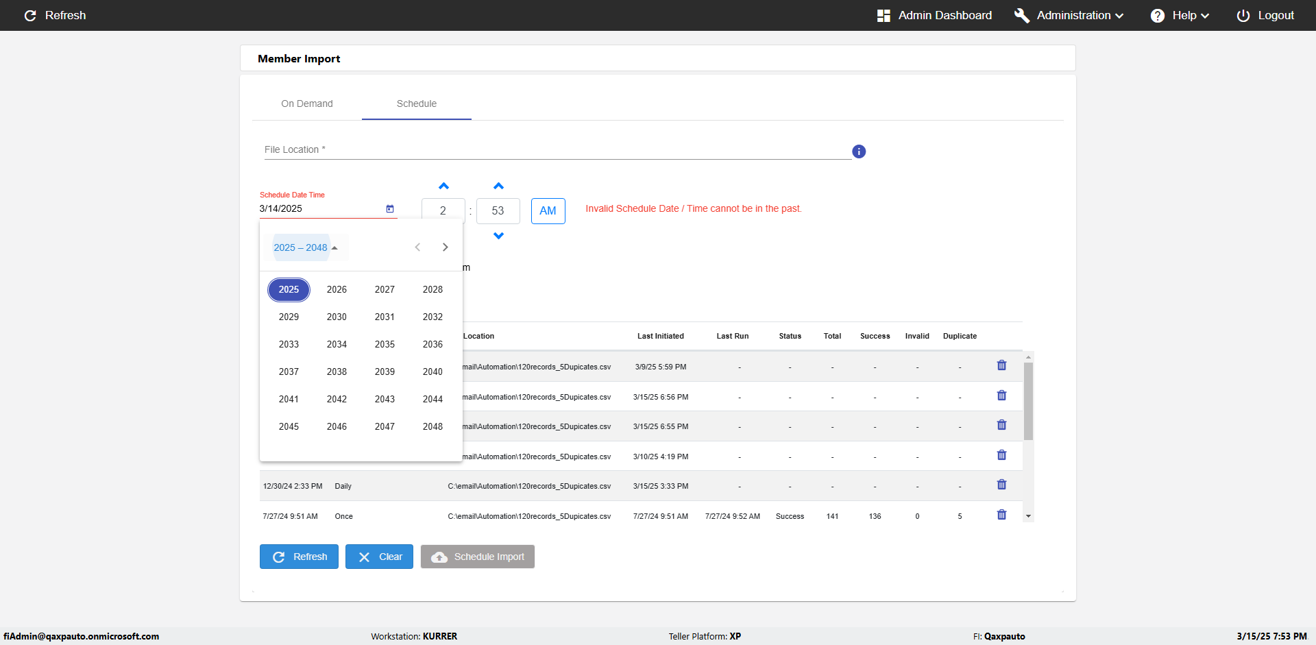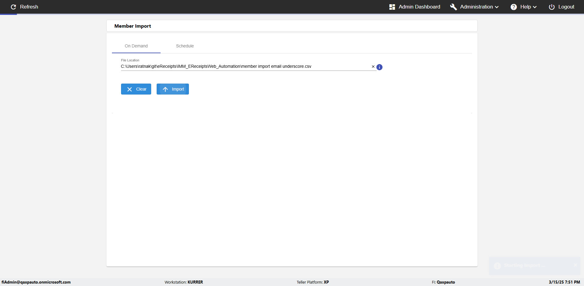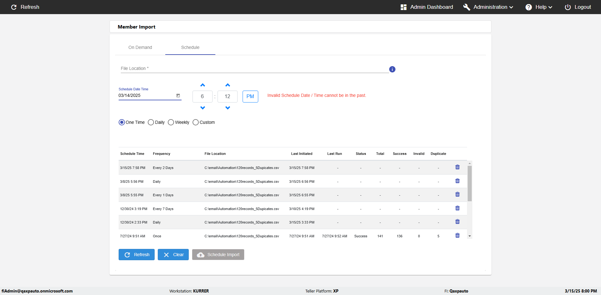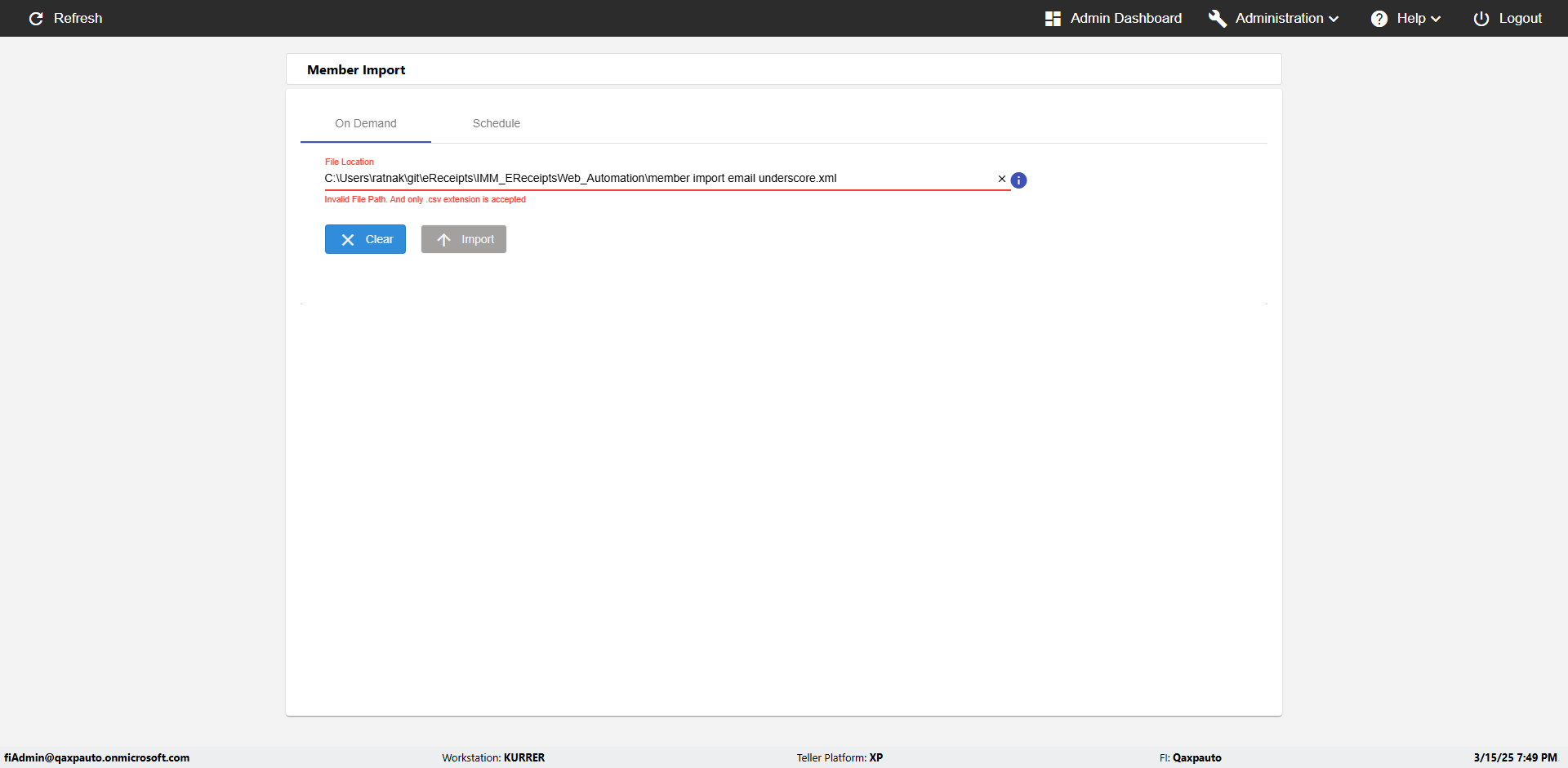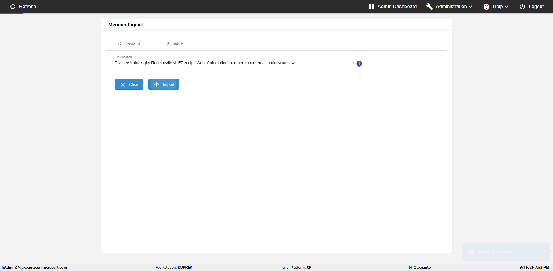 | {Archived Transactions=, Archive=, print signatur=, Name=, MultipleWorkstation=, WorkstationDeleteOption=, BranchName=, Agent=, UserPwd=iMM2022!, BranchDeleteOption=, Receipt=, Role=, Brand=, Print signature line=, TimeZone=, Header=, MappedOption=, Scan=, PortNumber=, FromWks=, FromBranch=, Description=verify Member Import 'Schedule' Page, weeks=, Operation=, Clear=, TestID=verifyMemberImportSchedulePage, Phone=, WorkstationName=, ToBranch=, ToWks=, Subscription Names=, FilePath=C:\email\Automation\120records_5Dupicates.csv, Transtatus=Archived-false;Active-true;Error-false, Report=, Index_Field_Name=, Agents=, Text=, Hold Notice=, Suppress=, SchedualType=Daily,, Date=, Platfrom=, GroupId=, print Disburstments=, SMTP=, Imaging System=, MultipleBranches=, Username=fiAdmin@Qaxpauto.onmicrosoft.com, Sign=} |