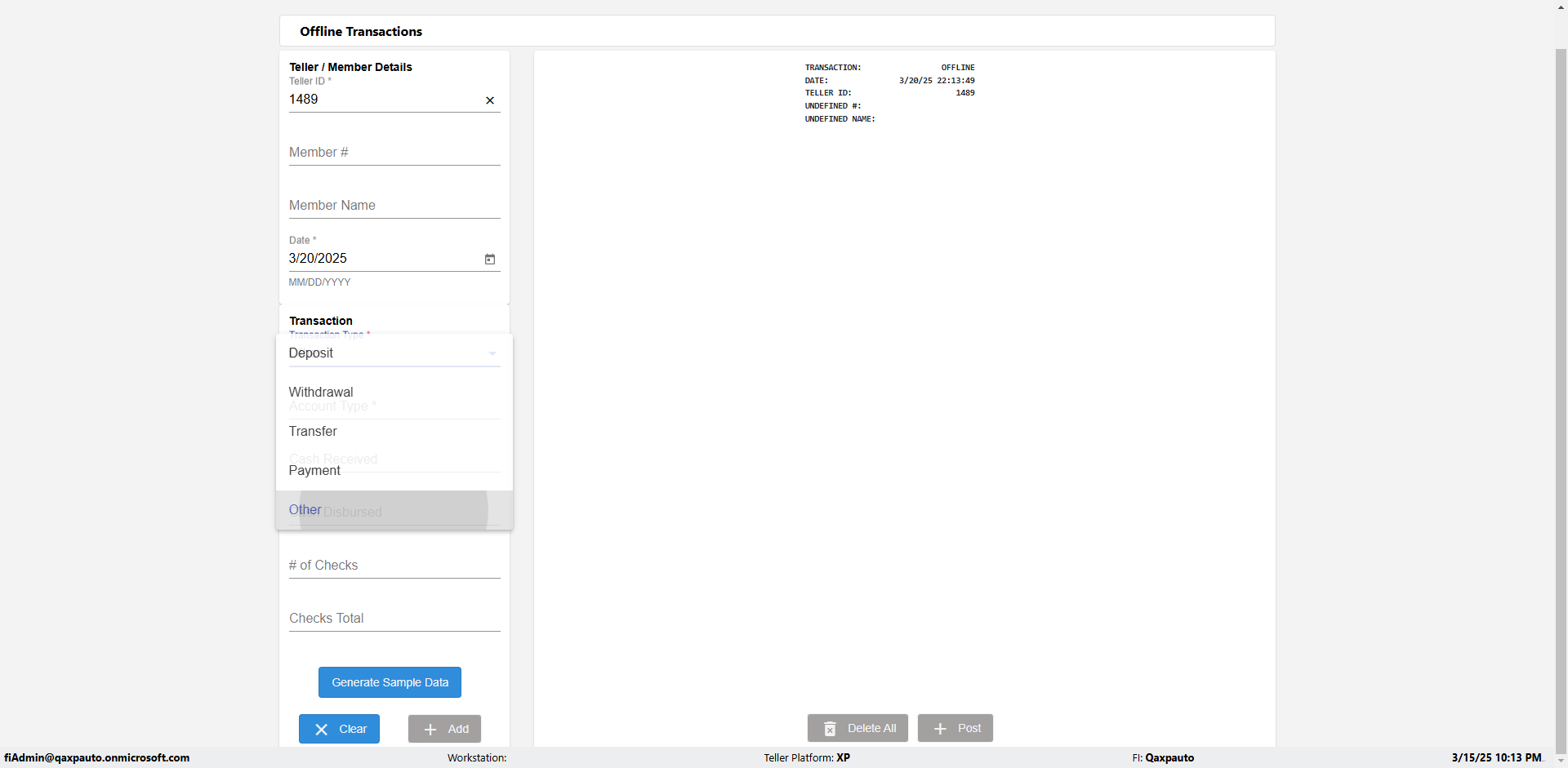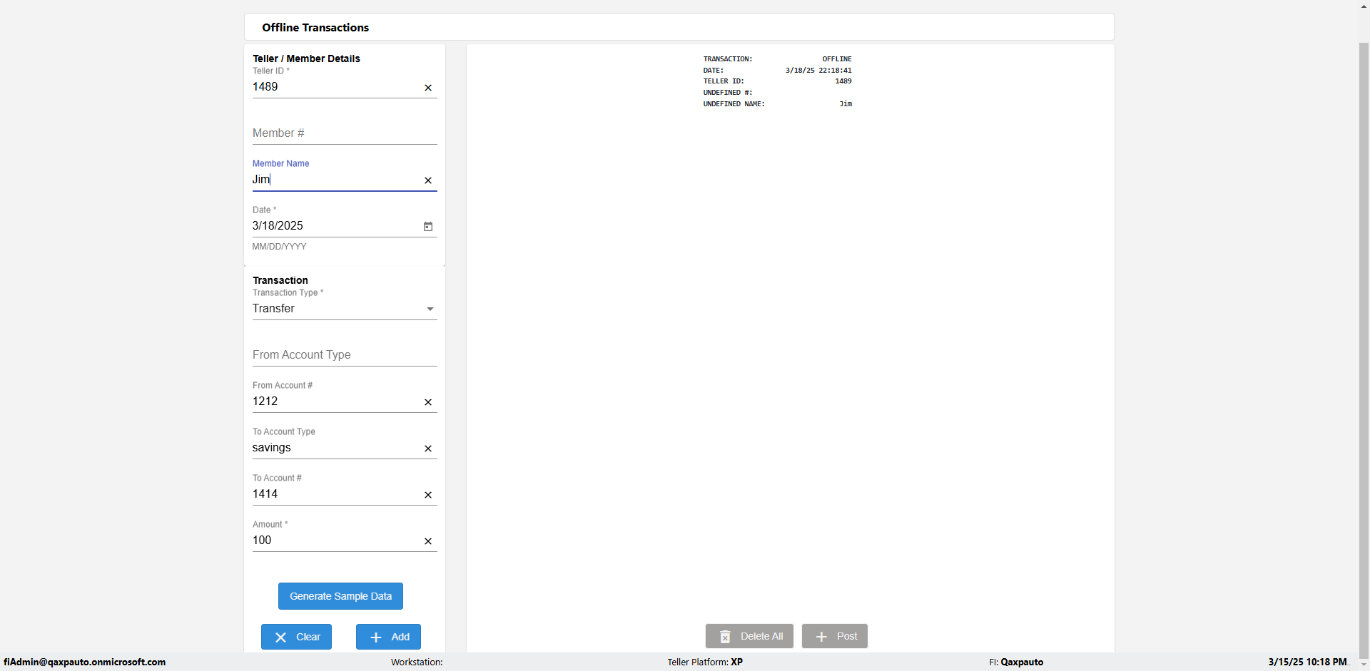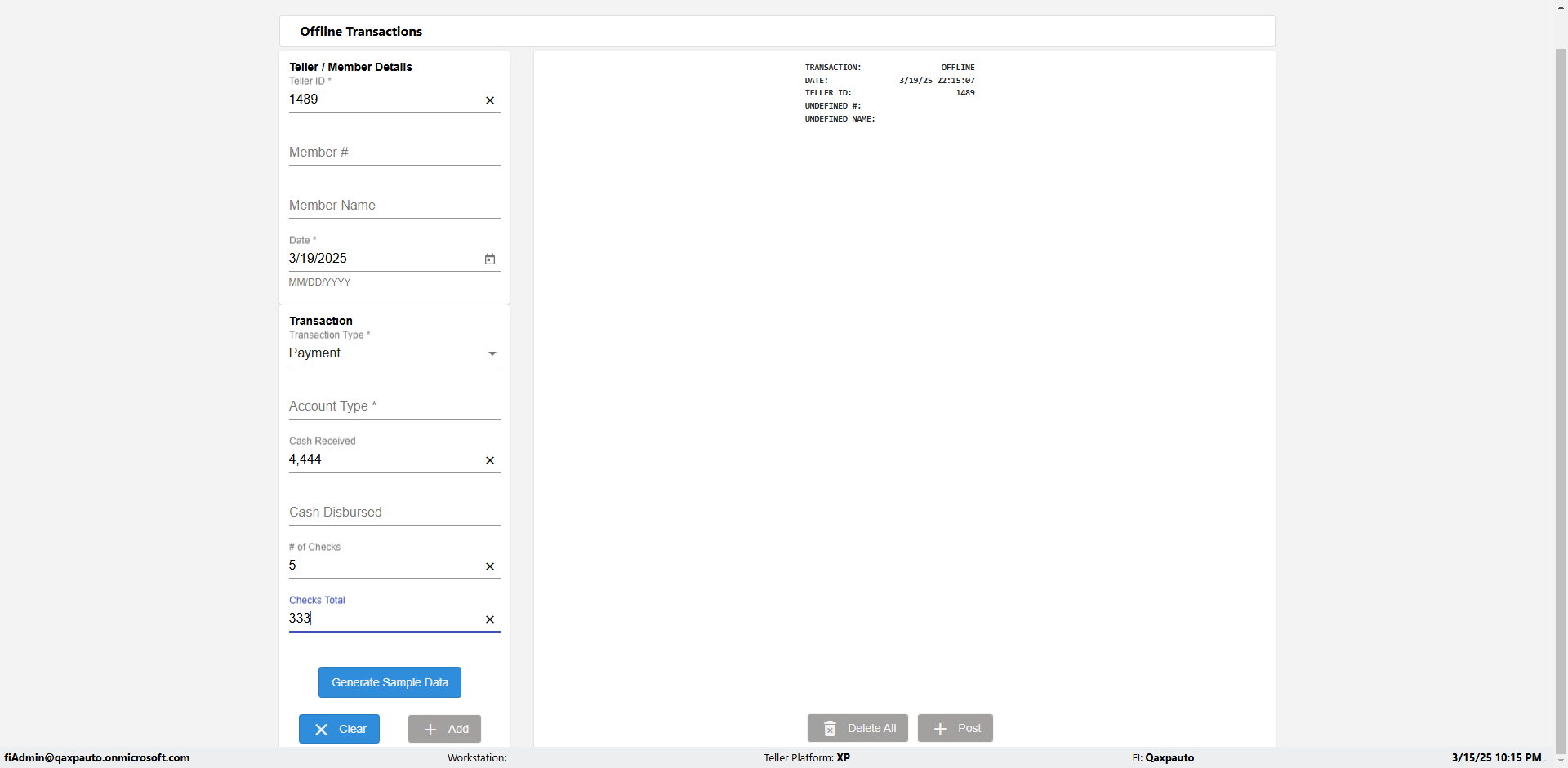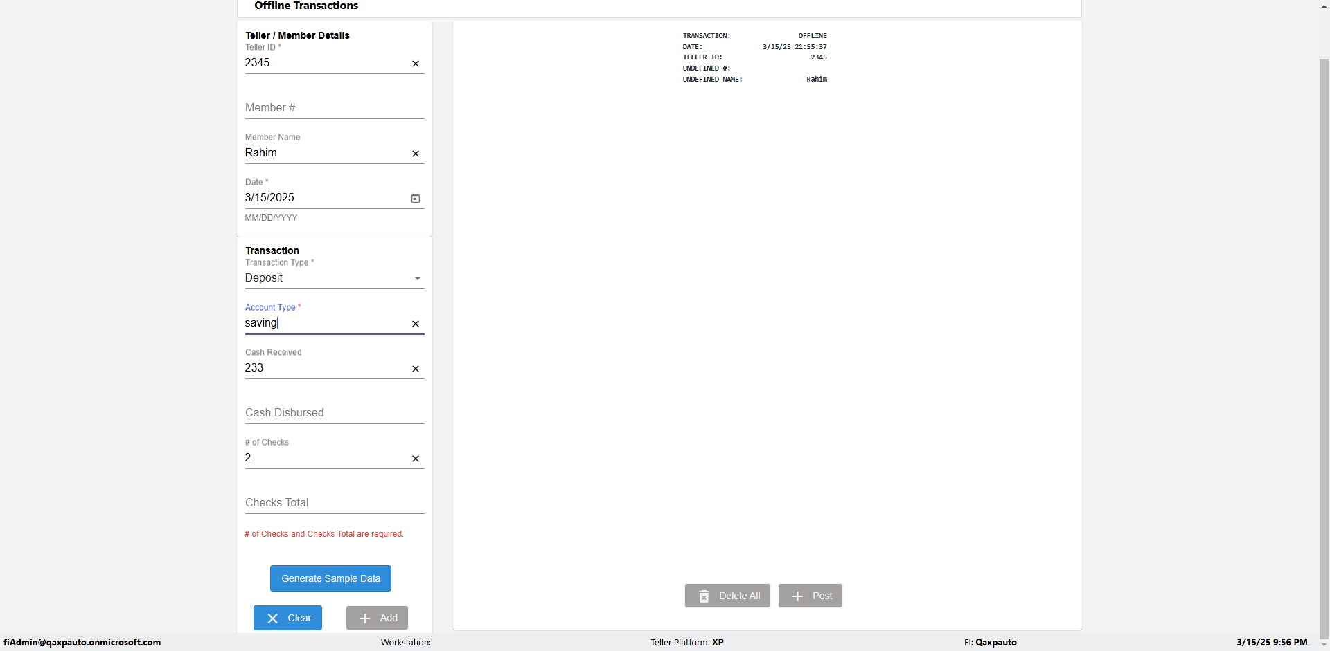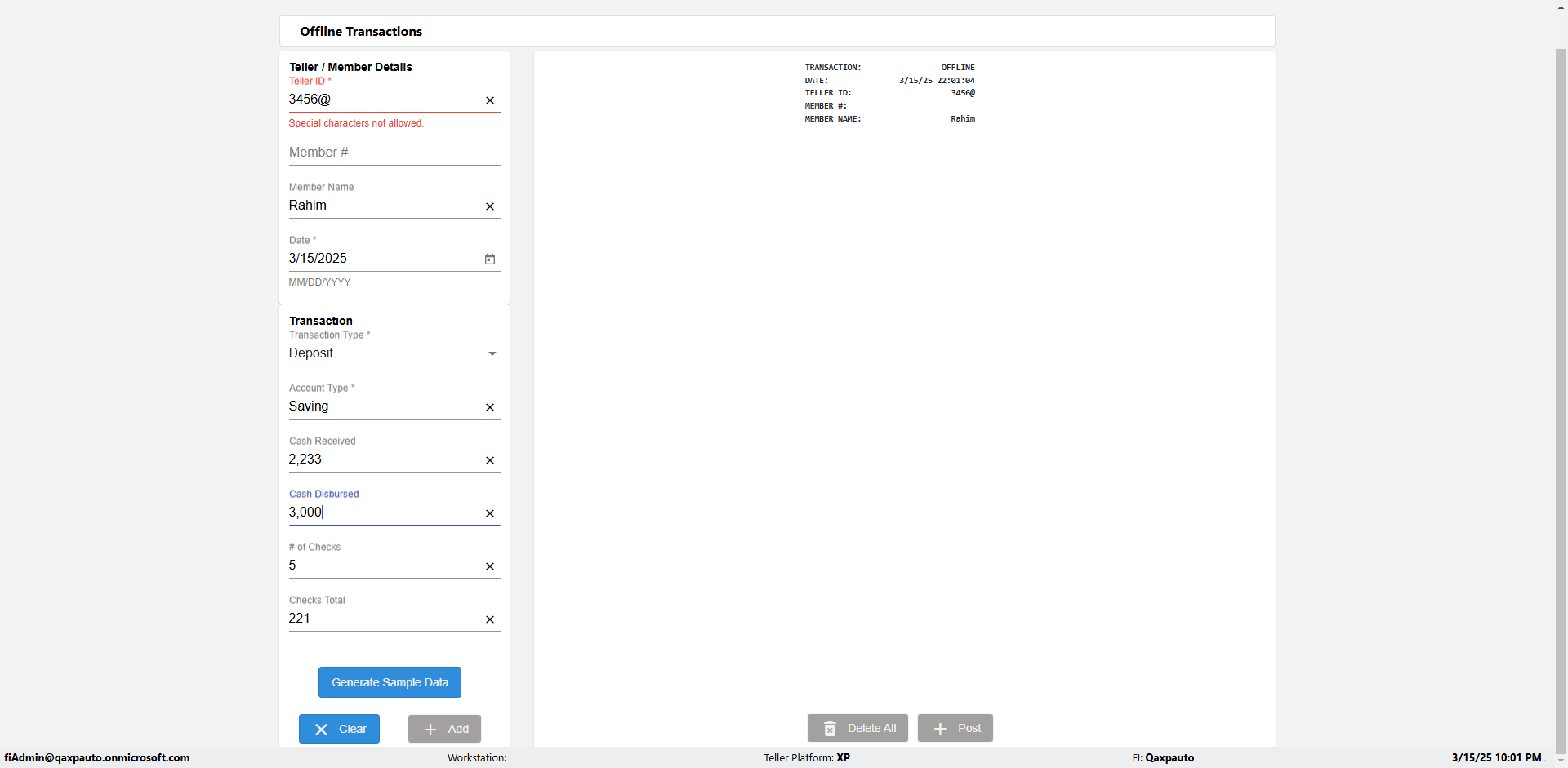| {Description=Verify generate sample data in Offline Transaction demo, From Account #=1212, Teller ID=1488, To Account #=1414, Amount=565, errorMessage=, Transaction Type=Deposit, userpwd=iMM2022!, # of Checks=5, Member#=8888, Member Name=Alla, Cash Received=5000, From Account Type=checking, Date=3, To Account Type=savings, errorint=, TestID=verifyOfflineTranGenerateSample, offlineurl=/offlinereceipt/demo, Cash Disbursed=3000, Account Type=Checking, Checks Total=999, username=fiAdmin@Qaxpauto.onmicrosoft.com} |
