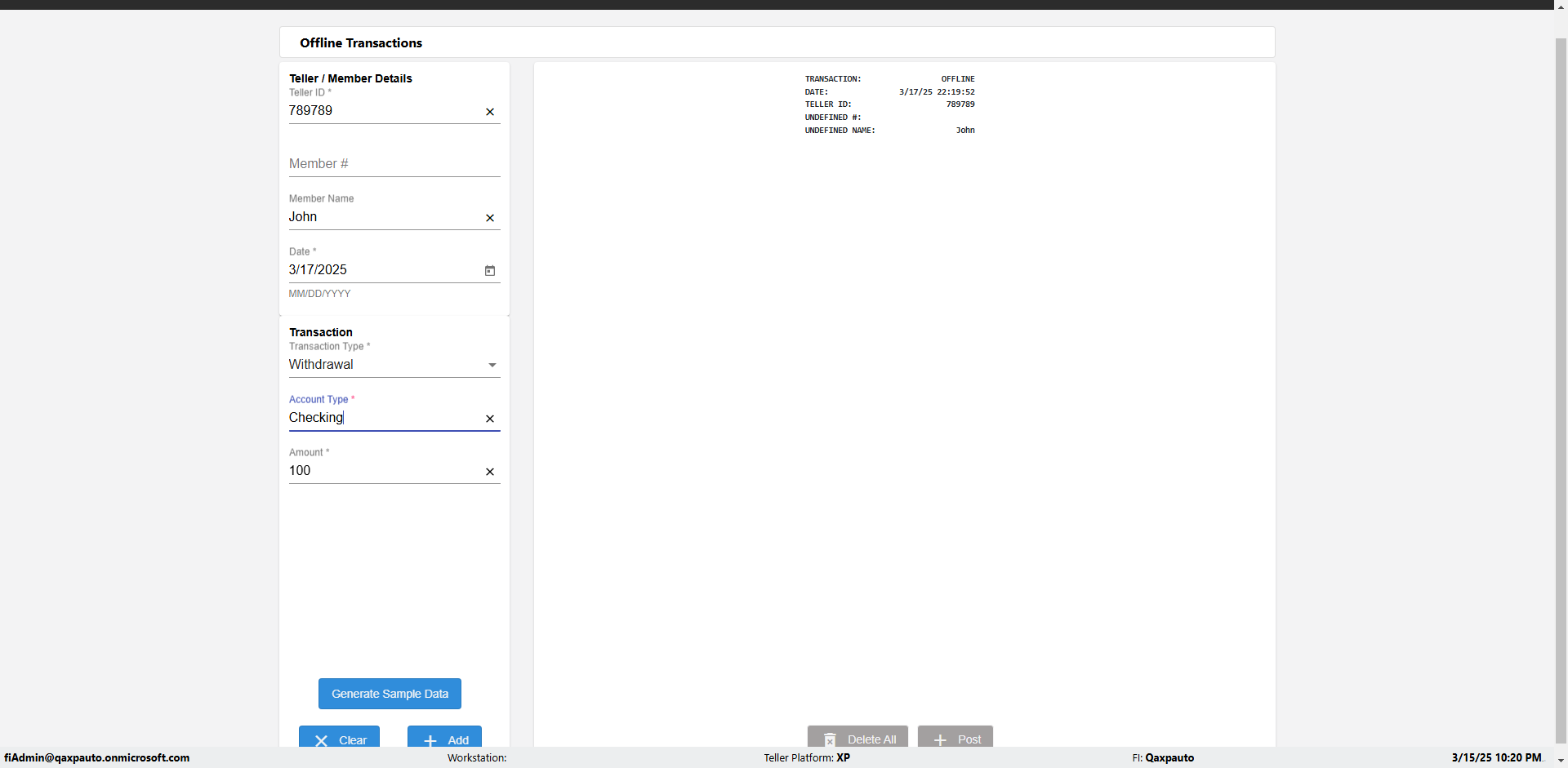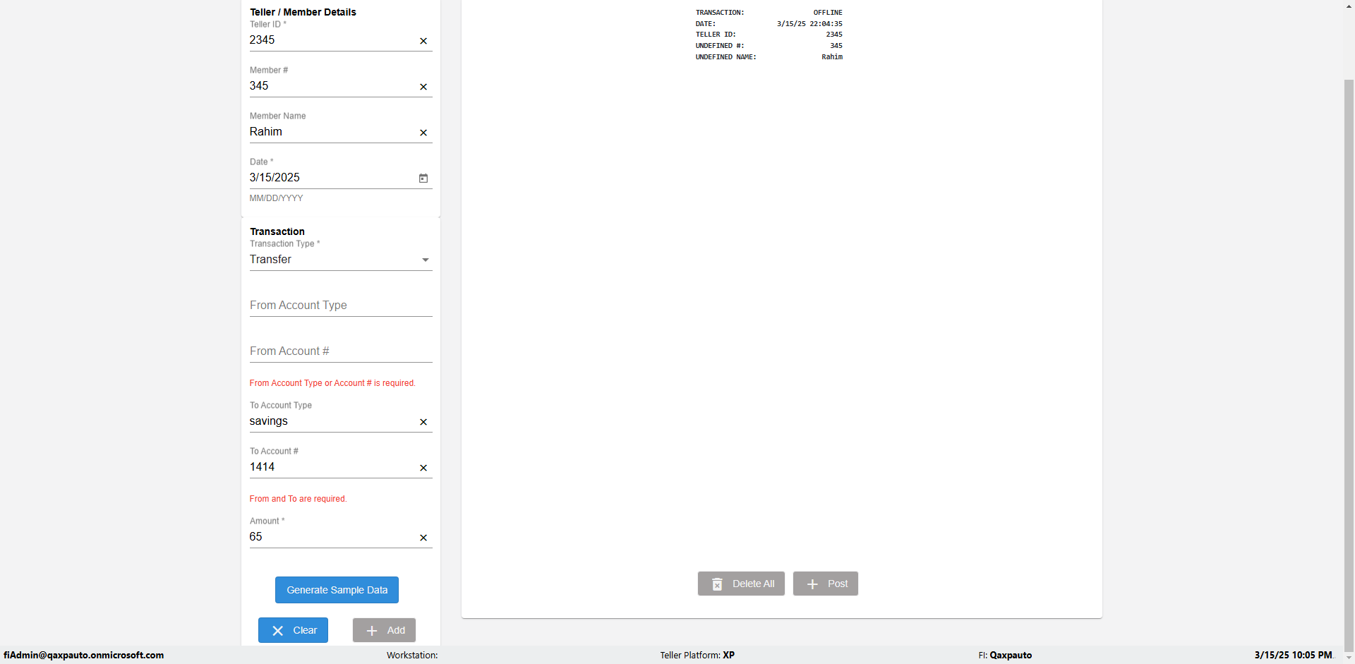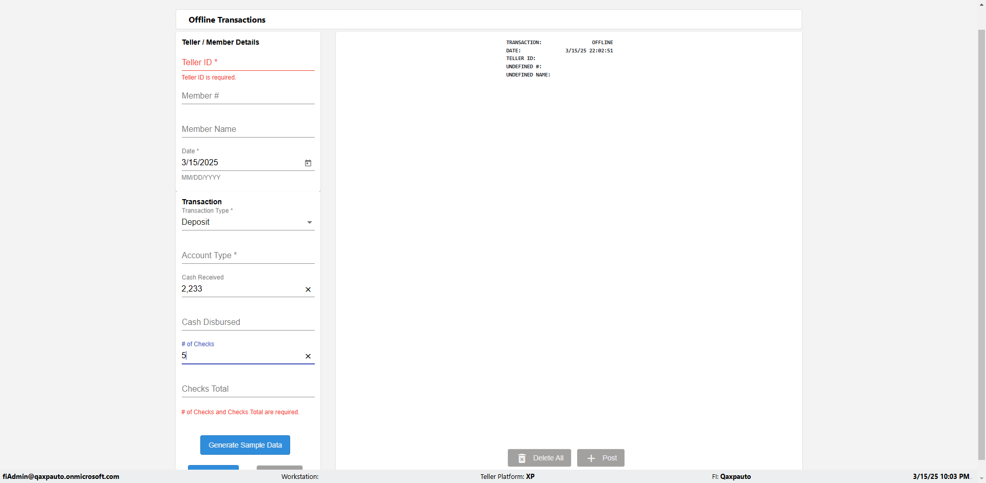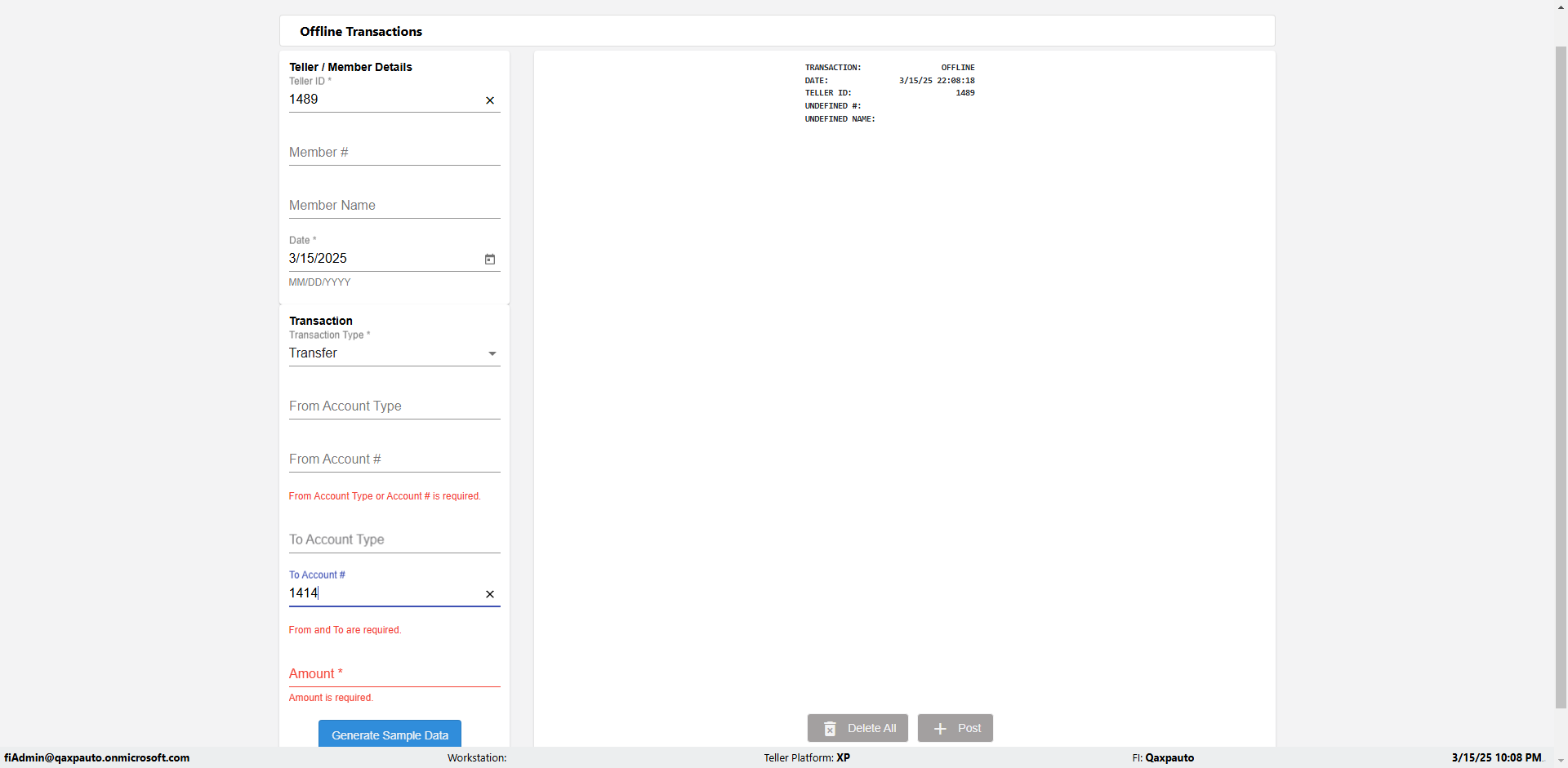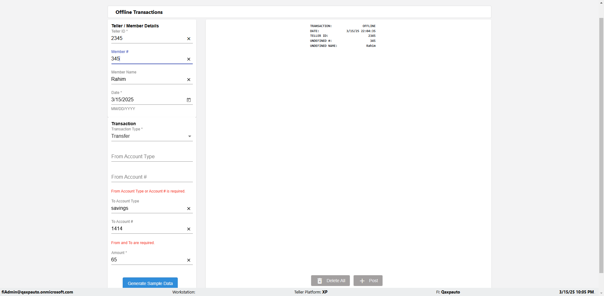 | {Description=Verify generate sample data in Offline Transaction demo, From Account #=1212, Teller ID=1488, To Account #=1414, Amount=565, errorMessage=, Transaction Type=Deposit, userpwd=iMM2022!, # of Checks=5, Member#=8888, Member Name=Alla, Cash Received=5000, From Account Type=checking, Date=3, To Account Type=savings, errorint=, TestID=verifyOfflineTranGenerateSample, offlineurl=/offlinereceipt/demo, Cash Disbursed=3000, Account Type=Checking, Checks Total=999, username=fiAdmin@Qaxpauto.onmicrosoft.com} |