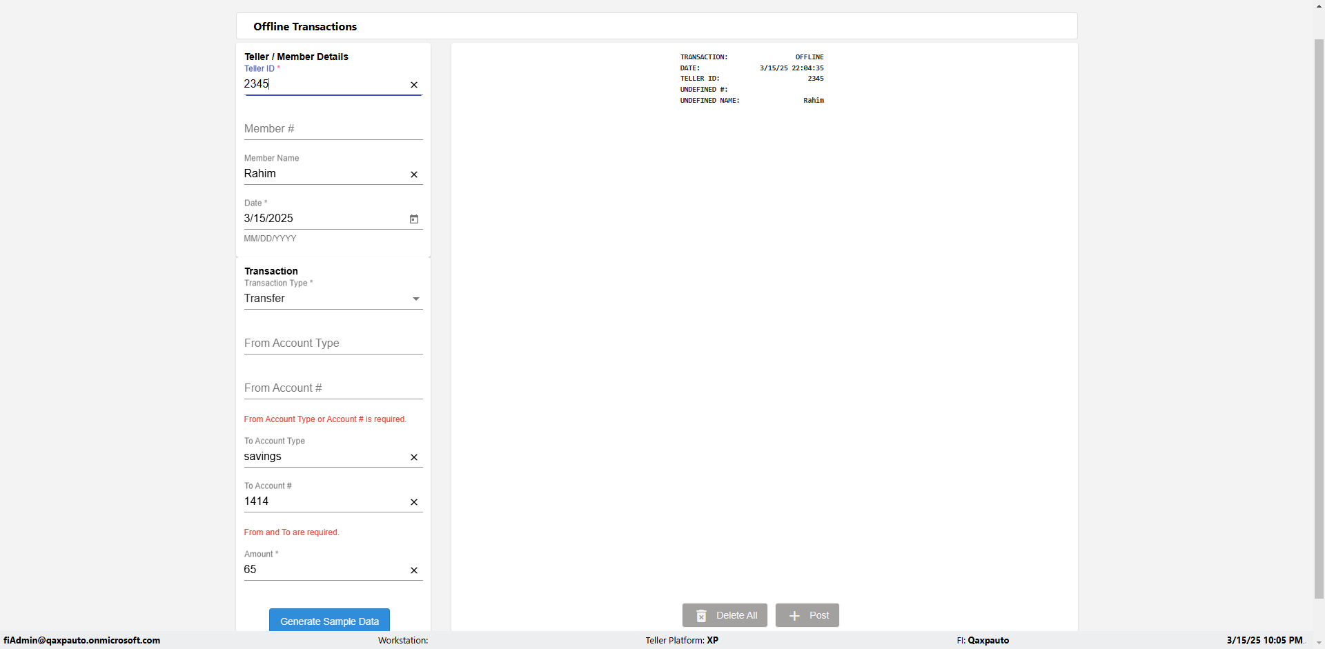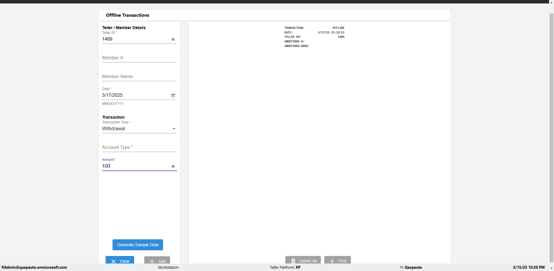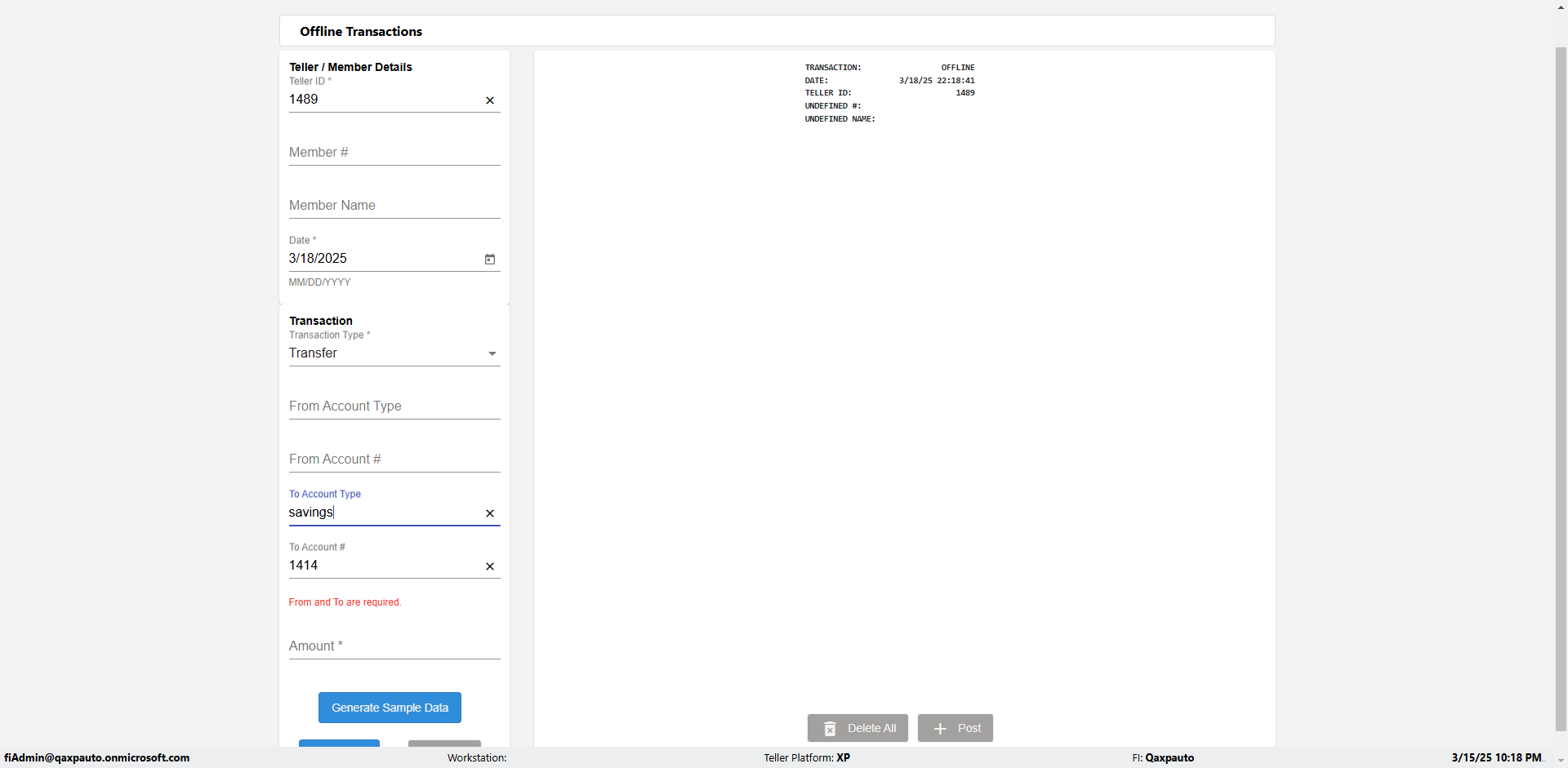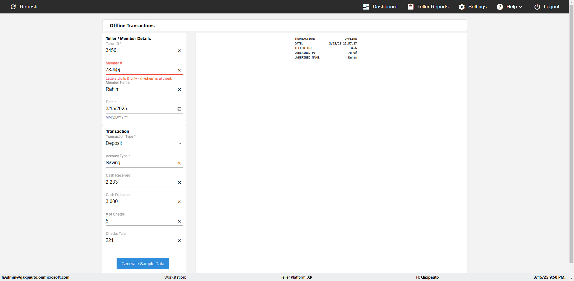 | {Description=Verify generate sample data in Offline Transaction demo, From Account #=1212, Teller ID=1488, To Account #=1414, Amount=565, errorMessage=, Transaction Type=Deposit, userpwd=iMM2022!, # of Checks=5, Member#=8888, Member Name=Alla, Cash Received=5000, From Account Type=checking, Date=3, To Account Type=savings, errorint=, TestID=verifyOfflineTranGenerateSample, offlineurl=/offlinereceipt/demo, Cash Disbursed=3000, Account Type=Checking, Checks Total=999, username=fiAdmin@Qaxpauto.onmicrosoft.com} |