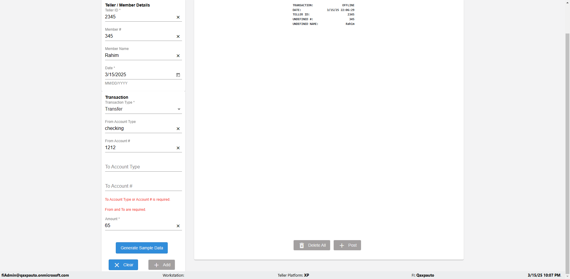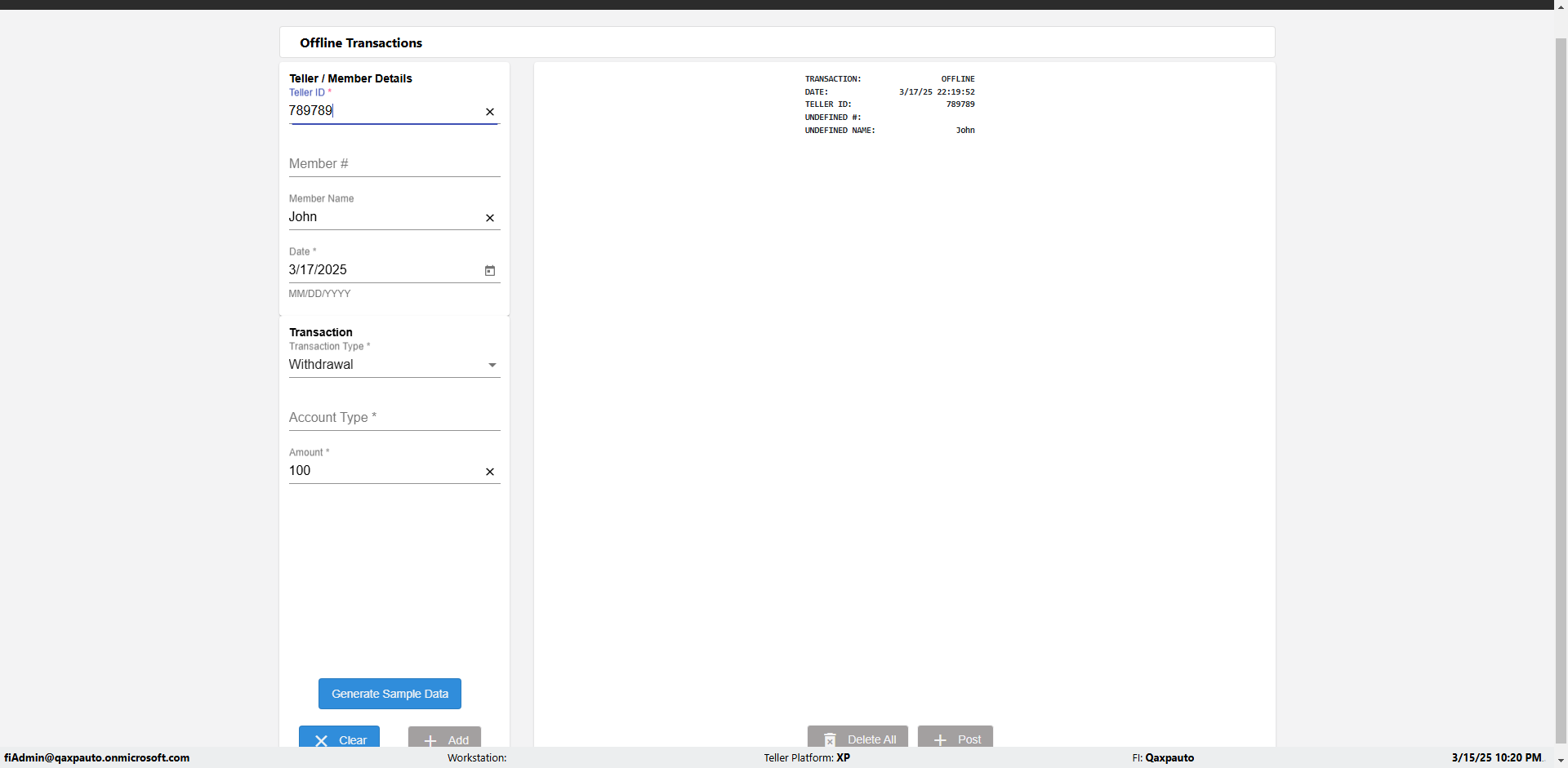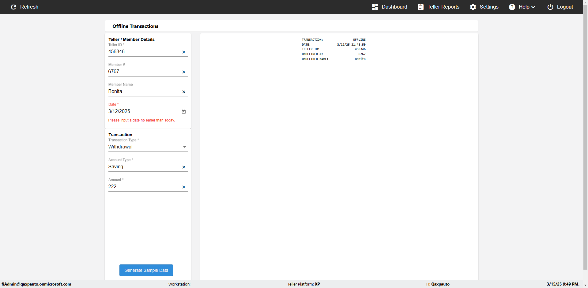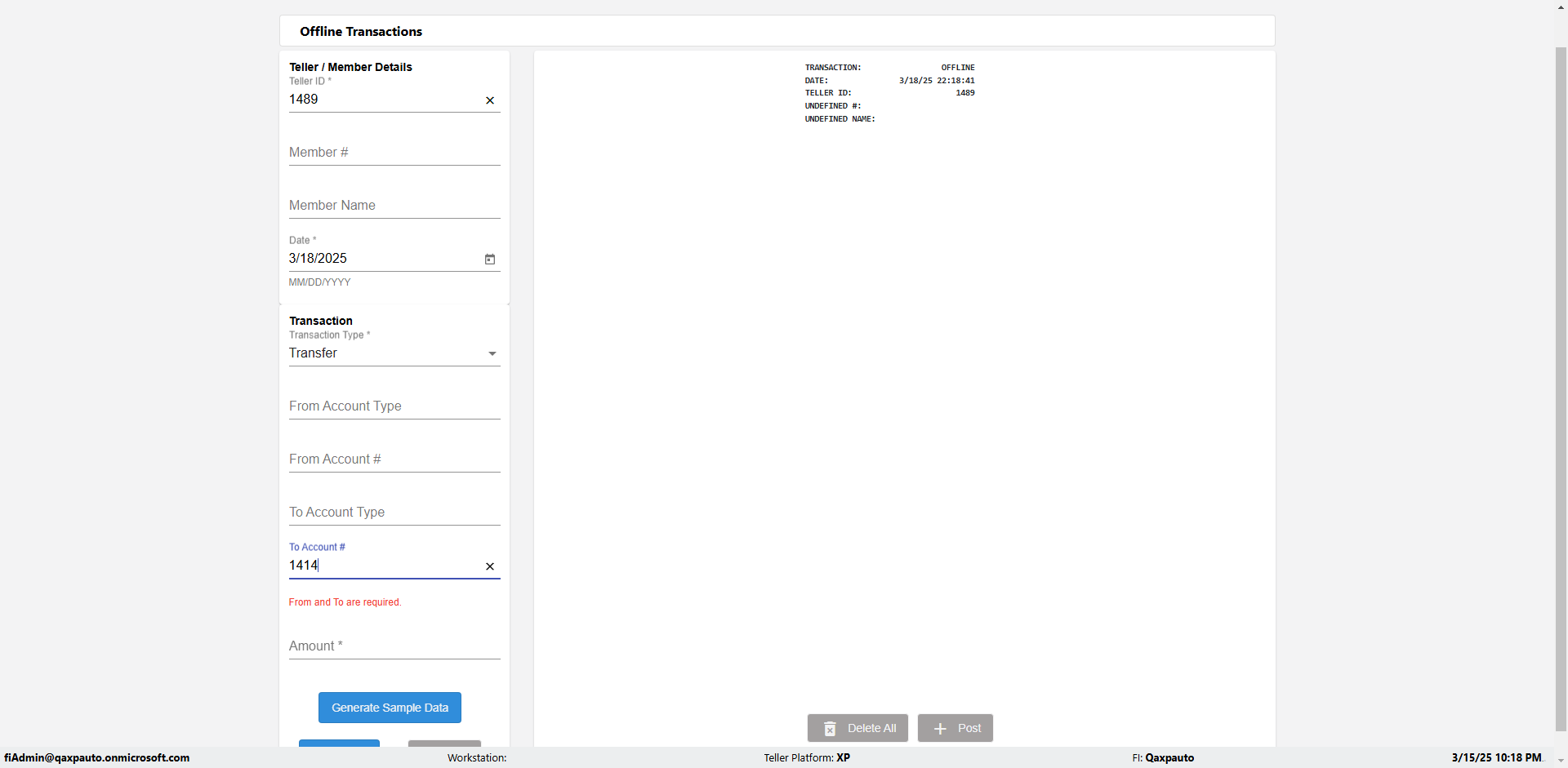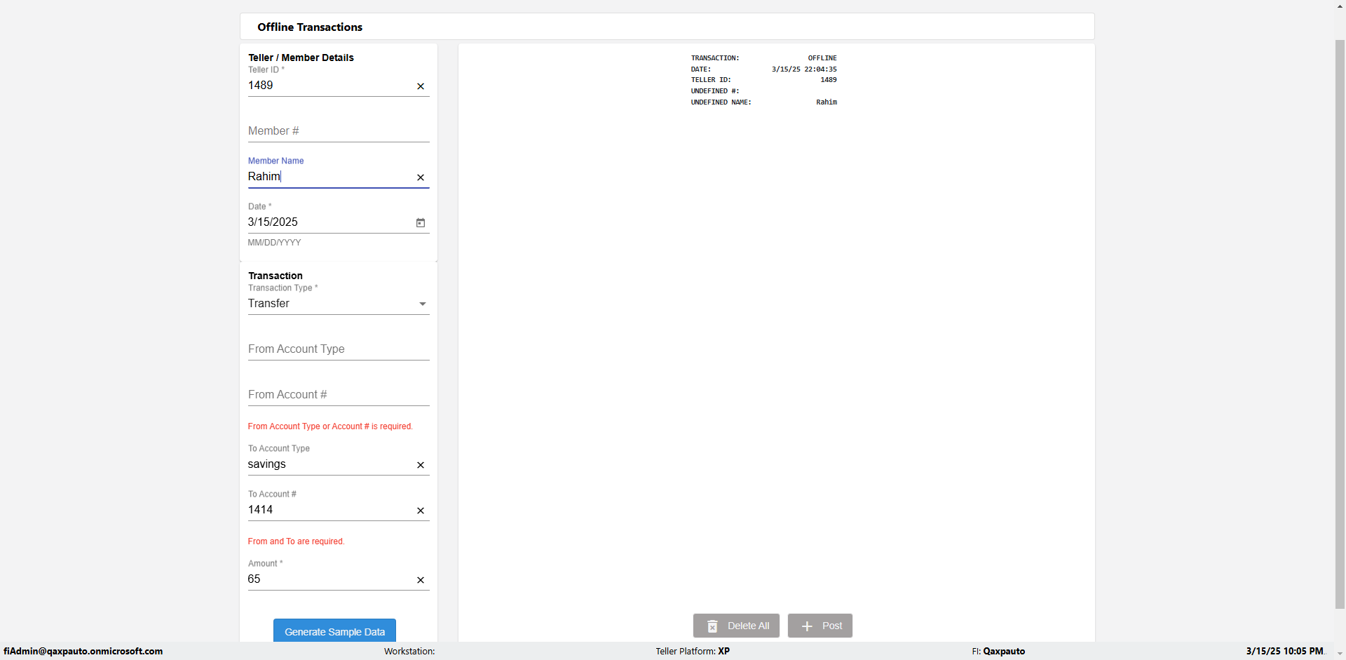 | {Description=Verify generate sample data in Offline Transaction demo, From Account #=1212, Teller ID=1488, To Account #=1414, Amount=565, errorMessage=, Transaction Type=Deposit, userpwd=iMM2022!, # of Checks=5, Member#=8888, Member Name=Alla, Cash Received=5000, From Account Type=checking, Date=3, To Account Type=savings, errorint=, TestID=verifyOfflineTranGenerateSample, offlineurl=/offlinereceipt/demo, Cash Disbursed=3000, Account Type=Checking, Checks Total=999, username=fiAdmin@Qaxpauto.onmicrosoft.com} |