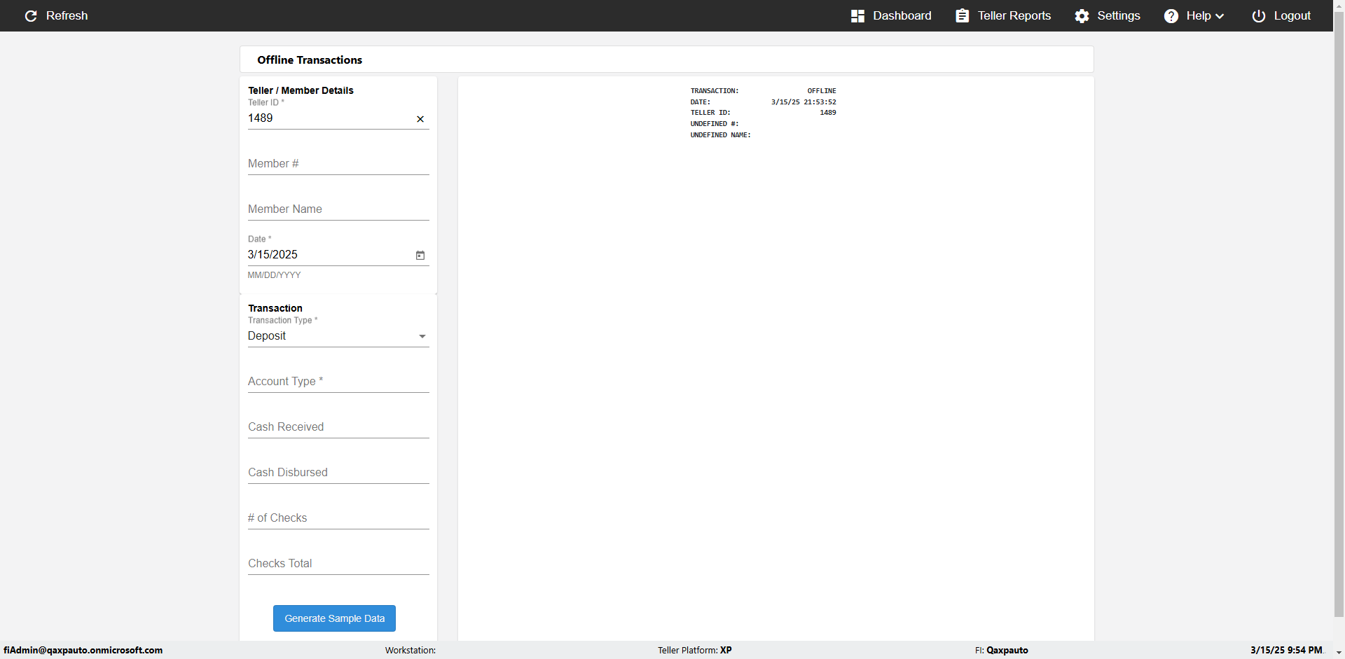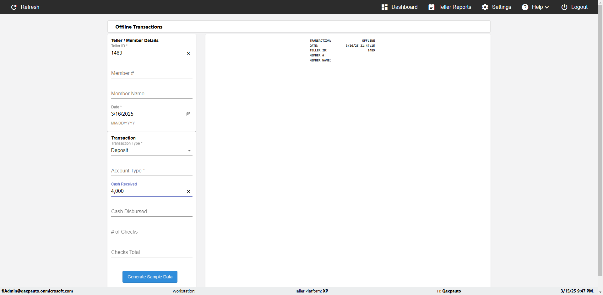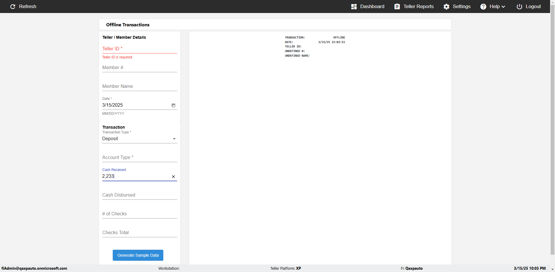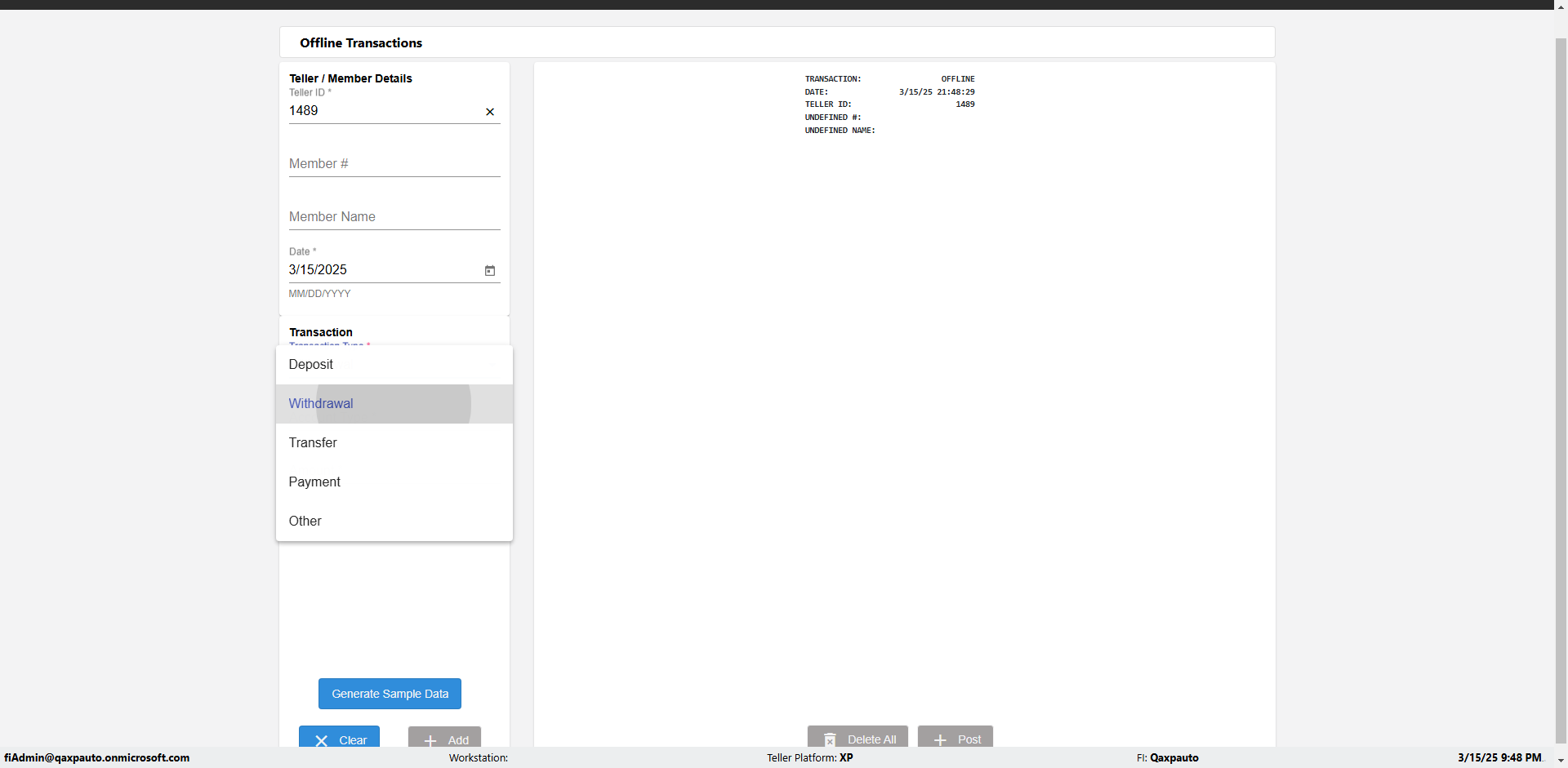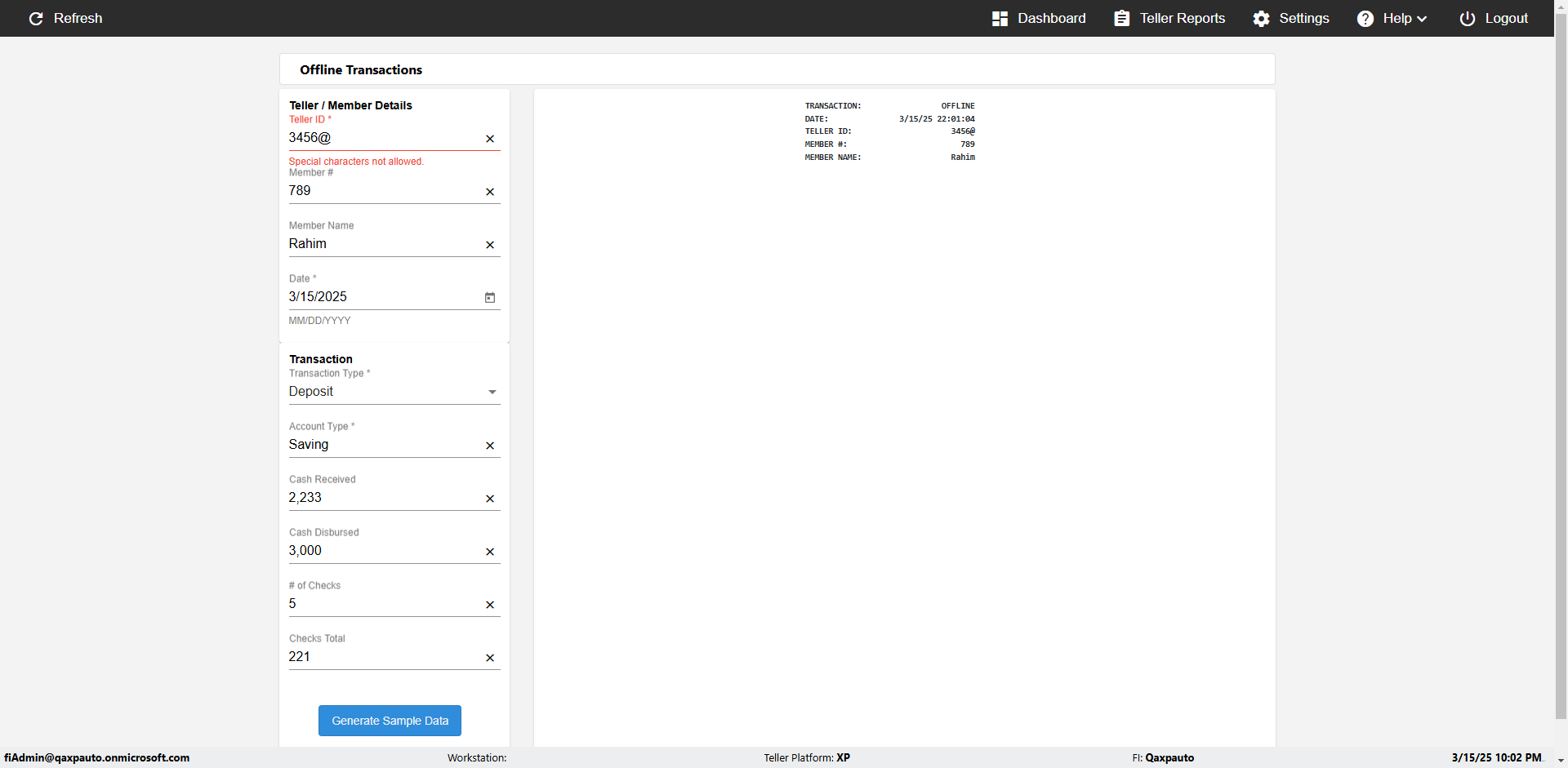 | {Description=Verify generate sample data in Offline Transaction demo, From Account #=1212, Teller ID=1488, To Account #=1414, Amount=565, errorMessage=, Transaction Type=Deposit, userpwd=iMM2022!, # of Checks=5, Member#=8888, Member Name=Alla, Cash Received=5000, From Account Type=checking, Date=3, To Account Type=savings, errorint=, TestID=verifyOfflineTranGenerateSample, offlineurl=/offlinereceipt/demo, Cash Disbursed=3000, Account Type=Checking, Checks Total=999, username=fiAdmin@Qaxpauto.onmicrosoft.com} |