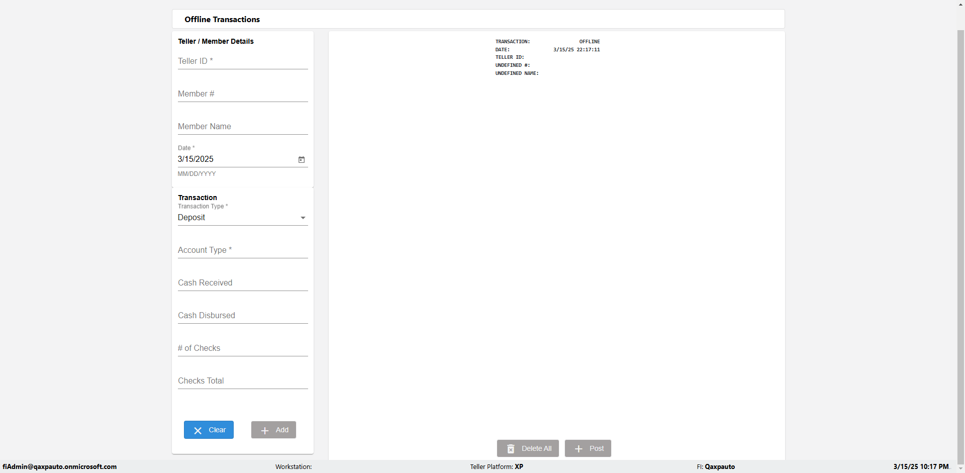 | {Description=Verify Account Type in DEposit, From Account #=1212, Teller ID=2345, To Account #=1414, Amount=65, errorMessage=Account Type is required., Transaction Type=Deposit, userpwd=iMM2022!, # of Checks=2, Member#=345, Member Name=Rahim, Cash Received=233, From Account Type=checking, Date=, To Account Type=savings, errorint=1, TestID=verifyOfflineErrorMessagesWithdraw, offlineurl=/offlinereceipt/demo, Cash Disbursed=3000, Account Type=, Checks Total=33, username=fiAdmin@Qaxpauto.onmicrosoft.com} |