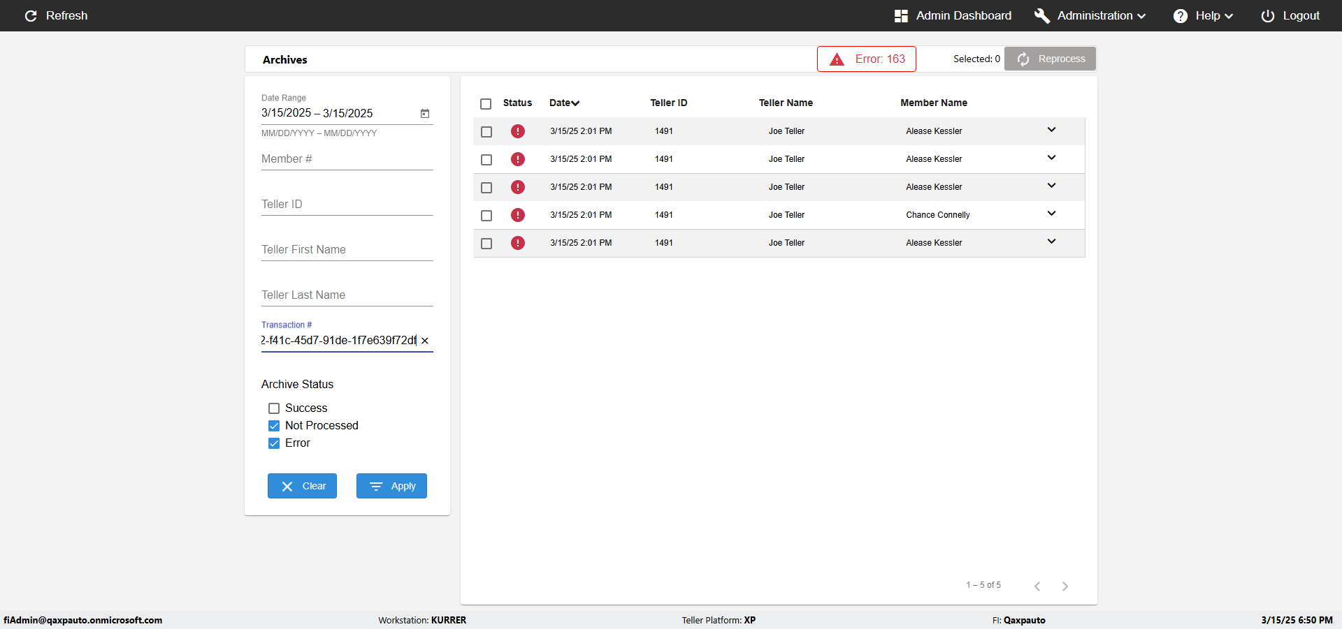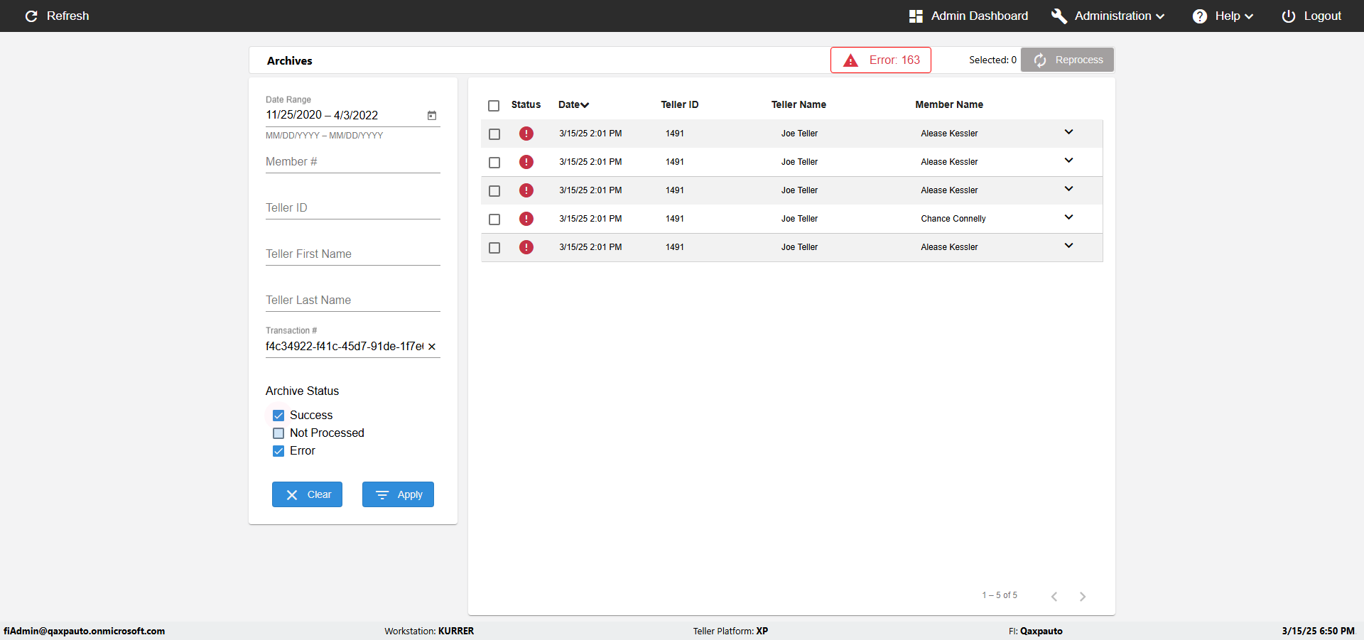 | {UserPwd=iMM2022!, Description=verify sorting in Archives Page with Teller,Date, Category=, select=, Reference=, Teller=, Teller FirstName=, errorMessage=, Teller LastName=, Teller Email=, Machine=, Date=1, Clear=, errorint=, TestID=verifySortingInArchivesPage, Reprocess=, Transaction=, Header=Date,Teller ID,Teller Name,Member Name,, Username=fiAdmin@Qaxpauto.onmicrosoft.com, Export=, Level=, Member=, ArchiveStatus=Success;Not Processed} |