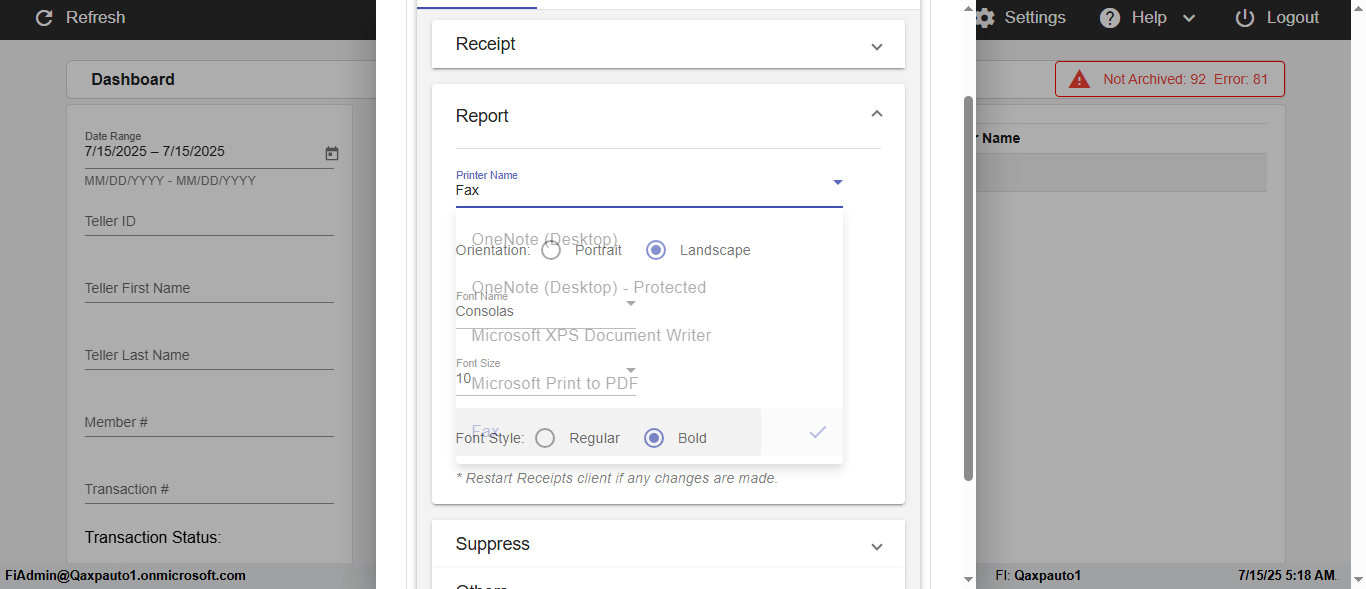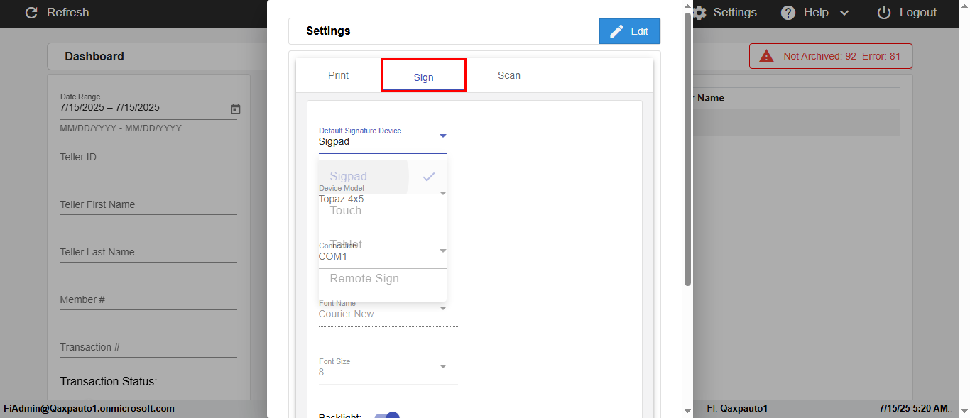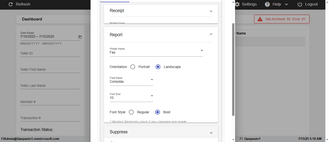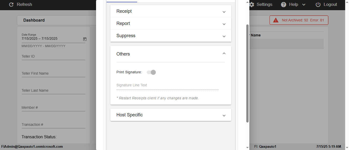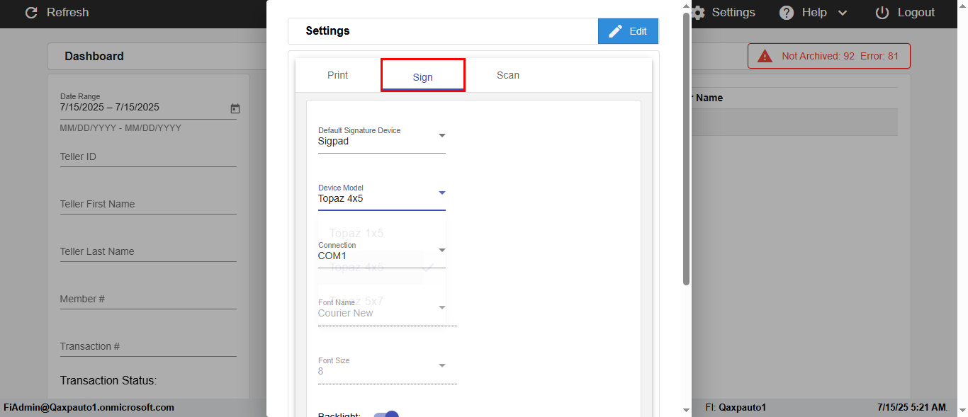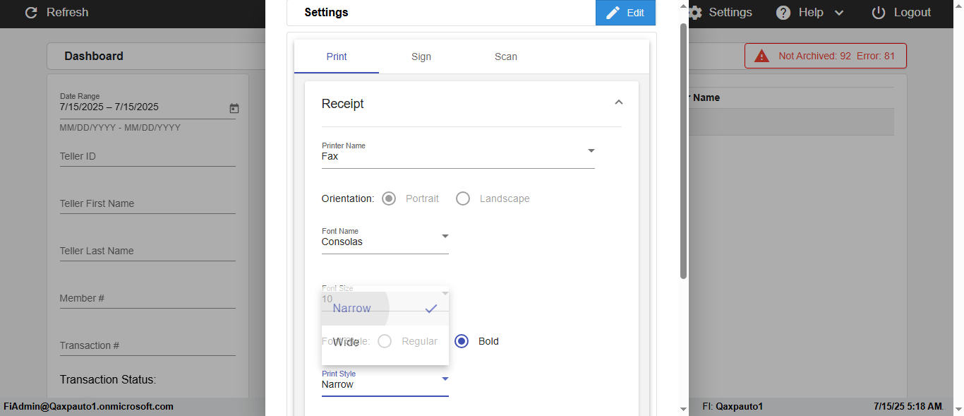 ({Description=verify Settings page In Teller Portal, Email=, Teller LastName=, print signatur=TRUE, errorint=, TestID=verifySettingsInTellerPage, Color Transactions=, Member=, UserPwd=iMM2022!, Transtatus=, Receipt=Printer Name-Fax;Name-Consolas;Size-10;Style-Bold,Narrow, Report=Printer Name-Fax;Orientation-Landscape;Name-Consolas;Size-10;Style-Bold, Teller=, Teller FirstName=, errorMessage=, Suppress=Log1-false;Log2-false;CuAddress-false;Member Address-false, Date=, print Disburstments=FALSE, Print signature line=print the sign, Type=, Transaction=, Header=, Username=fiAdmin@Qaxpauto1.onmicrosoft.com, SMS=, Sign=Default Signature Device-Sigpad;Device Model-Topaz 4x5;Connection-COM1;Backlight-true, Scan=Scanner Type-ScanShell 3000D;Image Mode-Singleside;USB Connection-false})